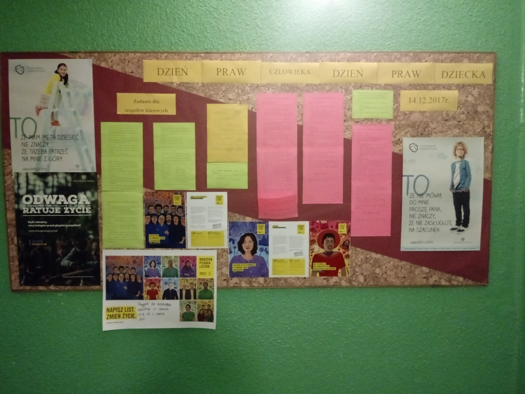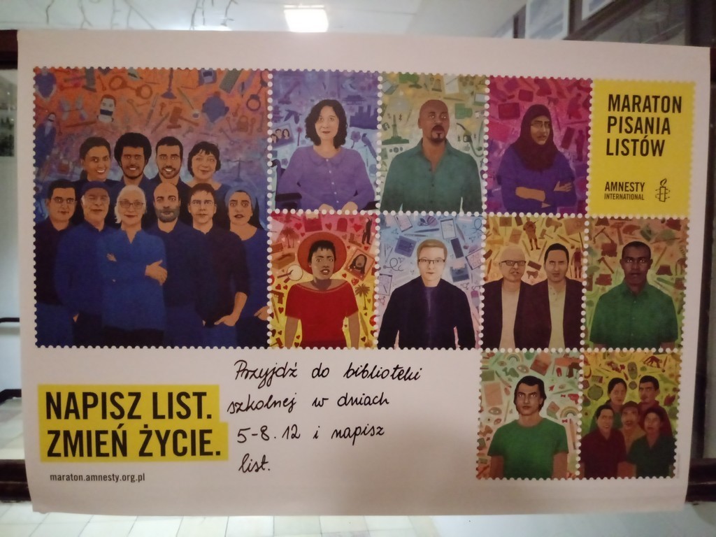 W dniach 4-9 grudnia grupa profilaktyczna kolejny raz zorganizowała w naszej szkole Maraton Pisania Listów. Maraton Pisania Listów odbywa się co roku w okolicach, kiedy przypada Międzynarodowy Dzień Praw Człowieka. Podczas wydarzenia Amnesty International mobilizuje ludzi na całym świecie do solidarnego przeciwstawienia się naruszeniom praw człowieka. „Iskra odwagi jest w każdym z nas. Możemy zabrać głos w słusznej sprawie. Możemy wysłać tweeta. Możemy protestować. Możemy napisać list. Możemy działać razem ramię w ramię z obrońcami i obrończyniami praw człowieka, by walczyć z niesprawiedliwością i budować bardziej sprawiedliwy świat. W tym roku podczas Maratonu pisaliśmy listy w sprawie obrońców i obrończyń praw człowieka z 10 państw. To osoby, które odważnie przeciwstawiają się łamaniu praw człowieka, a teraz same potrzebują naszego wsparcia.” – czytamy na stronie organizacji. Maraton powstał w Polsce w 2001 roku i urósł do rangi największego na świecie wydarzenia w obronie praw człowieka - w zeszłym roku podjęto 4,6 mln akcji, w samej Polsce napisano ponad 356 000 listów, a w działania Amnesty w kraju zaangażowało się blisko 100 000 osób.