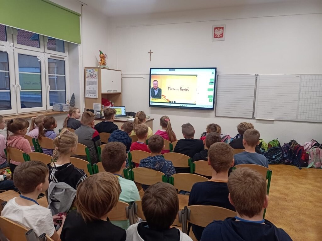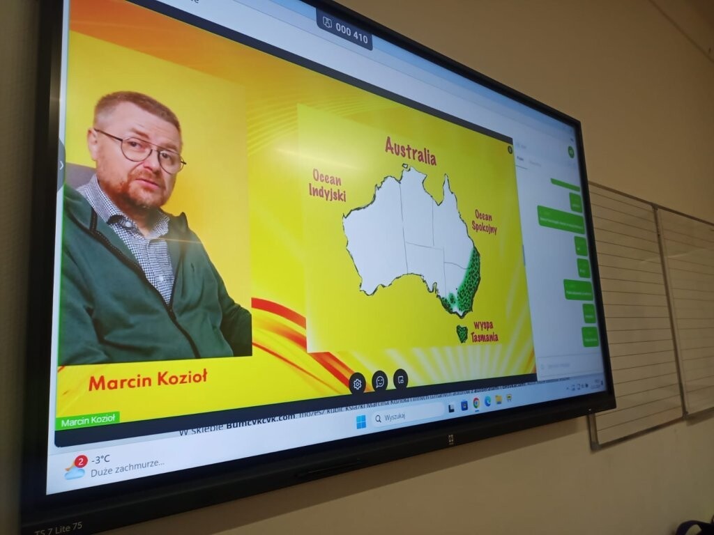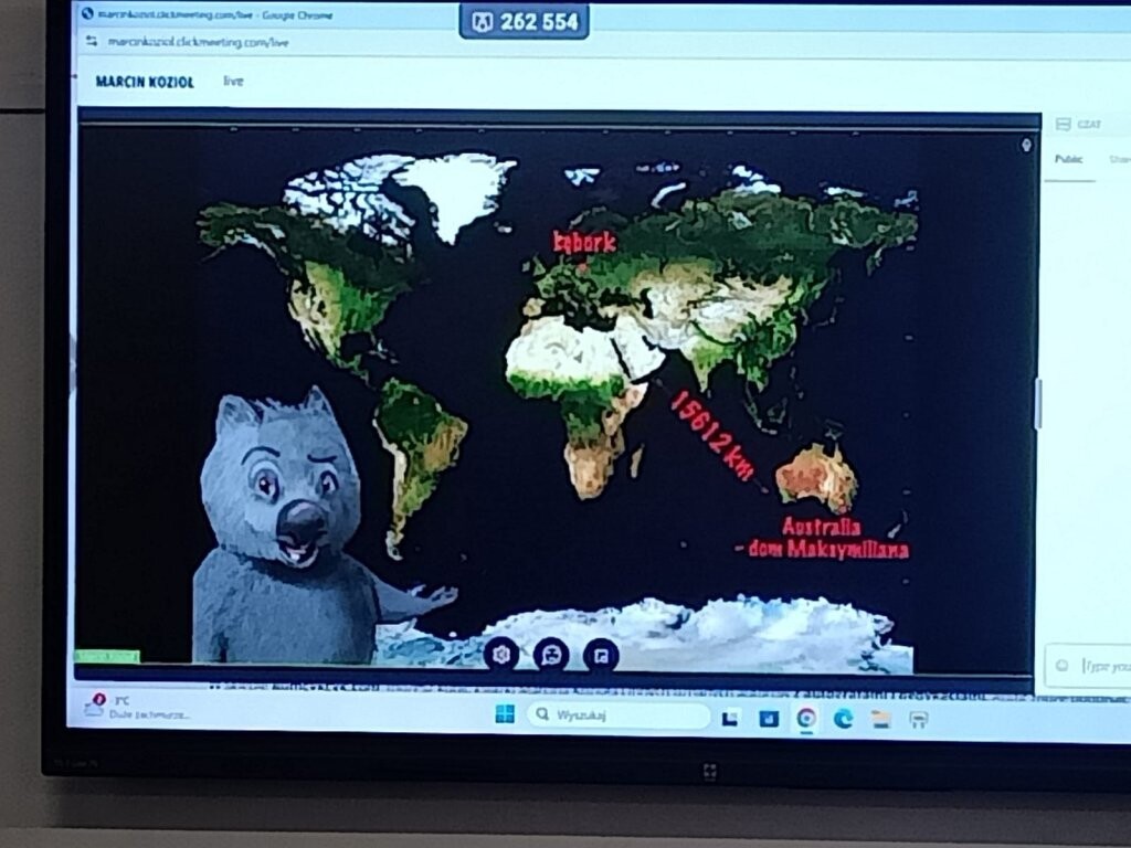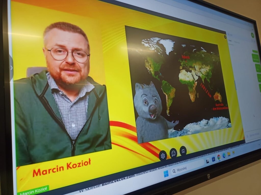 W piątek - 13 grudnia - uczniowie klas: IIIb i IIId uczestniczyli w spotkaniu online z autorem wyjątkowych książek dla dzieci i młodzieży. Pan Marcin Kozioł to autor znany już niektórym naszym uczniom. To zapalony podróżnik, który zwiedził ponad 60 krajów. Jest autorem lektury szkolnej – „Skrzynia Władcy Piorunów”. Owocem jego podróżniczej pasji jest seria książek o Wombacie Maksymilianie i to właśnie ten sympatyczny zwierzak był bohaterem piątkowego spotkania. Uczniowie zadawali mnóstwo pytań, na które otrzymywali od autora wyczerpujące odpowiedzi. Prezentowana przez pana Marcina książka jest interaktywna, wzbogacona o dodatki multimedialne, dzięki którym można przenieść się na miejsce akcji, jak również odbyć wirtualne spacery albo obejrzeć nagrania.