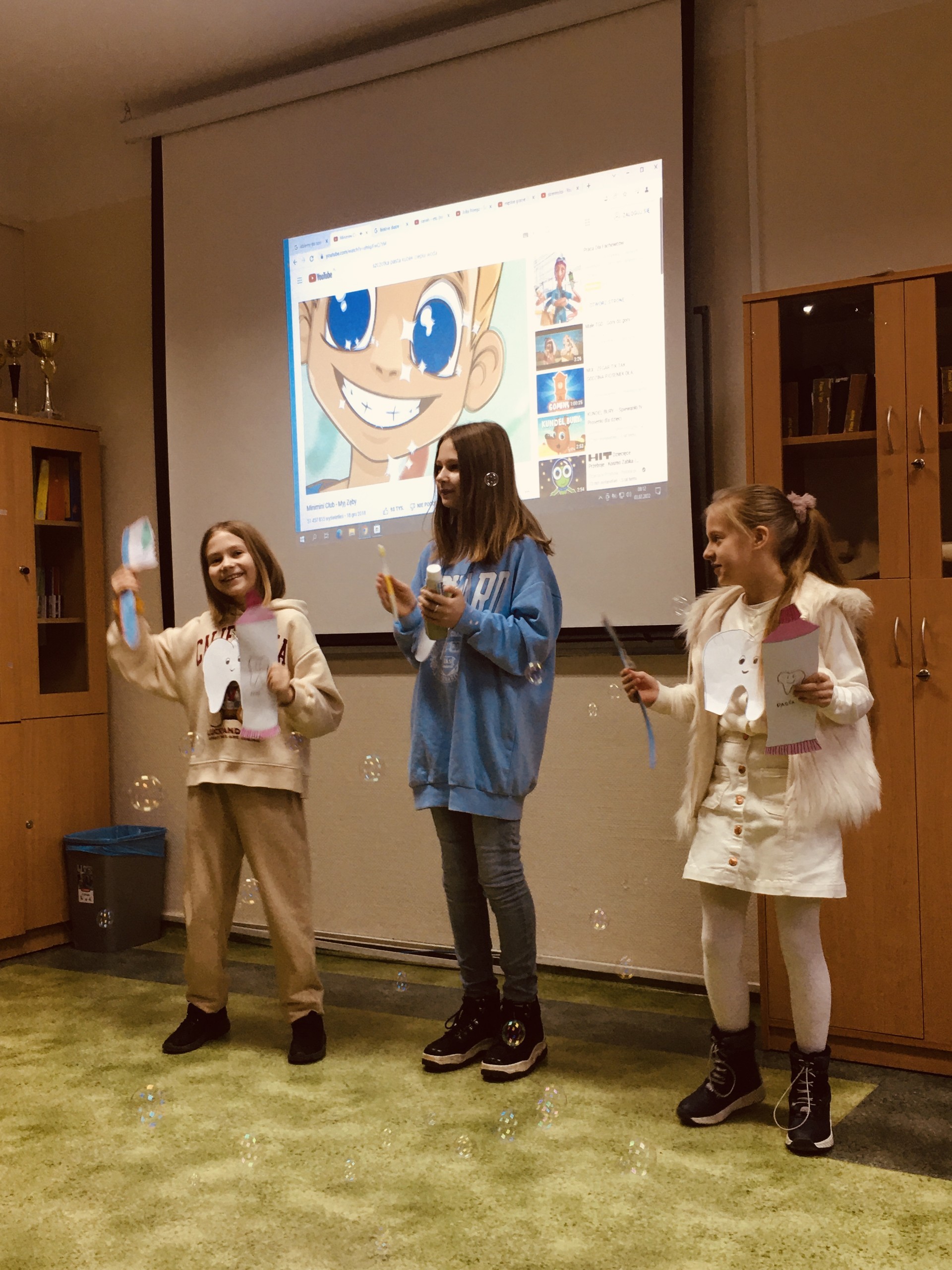 Ewcia, Rozi i Kajka rozbawiały klasową publiczność przy piosence „Szczotka, pasta, kubek, ciepła woda”,