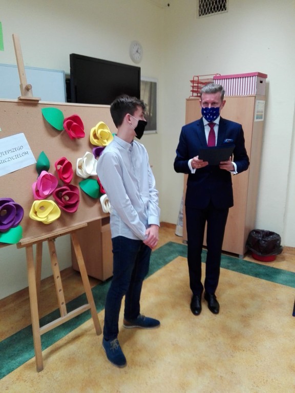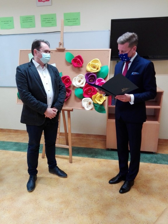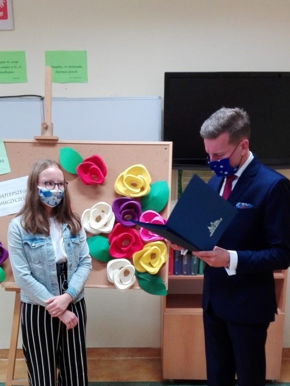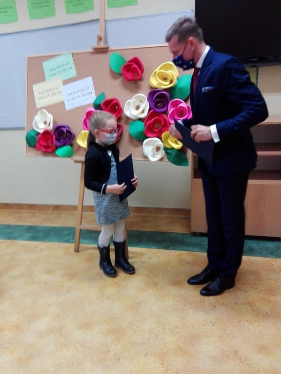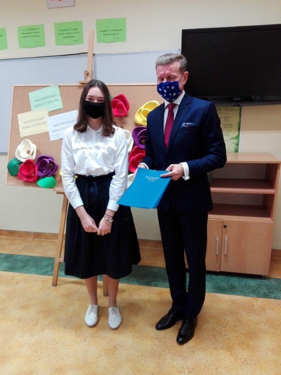 Podczas spotkania w naszej placówce wyróżnienia wręczone zostały przez sekretarza miasta p. Mariana Kurzydło pozostałym uczniom - Hubertowi Stencel, Natalii Tracewicz, Maksymilianowi Młyńskiemu, Patrycji Gwiazda, Kacprowi Zajkowskiemu i Adriannie Stępniak.