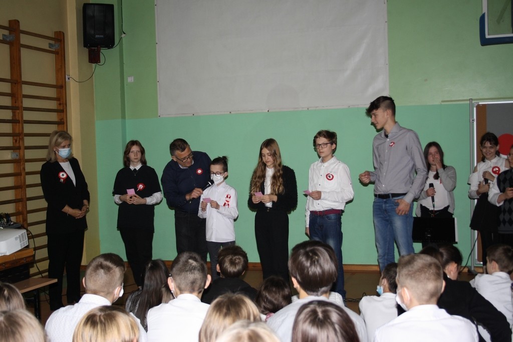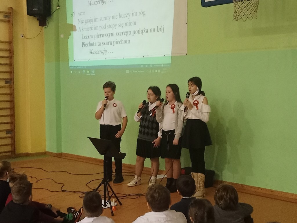 Narodowe Święto Niepodległości w tym roku szkolnym uczniowie i nauczyciele postanowili uczcić w nieco inny sposób... 10 listopada na sali gimnastycznej uczniowie naszej szkoły mieli okazję wziąć udział w niezwykłym koncercie poświęconym 103 rocznicy odzyskania przez Polskę niepodległości. Zespół muzyczny Witamina M pod kierunkiem pana Andrzeja Łakockiego zabrał wszystkich w muzyczną podróż poprzez pieśni wojskowe i legionowe, które towarzyszyły naszym żołnierzom podczas działań wojennych, a także stanowiły otuchę w trudach walki. Tego dnia wszyscy uczniowie mogli wspólnie śpiewać i radować się. Nie zabrakło również konkursów dla uczniów związanych ze znajomością treści pieśni patriotycznych.
