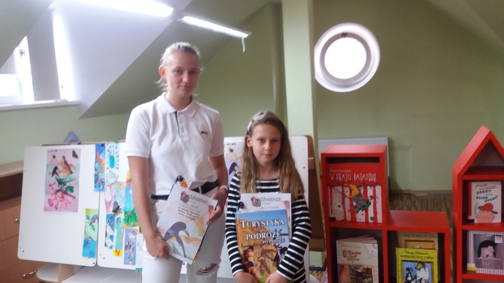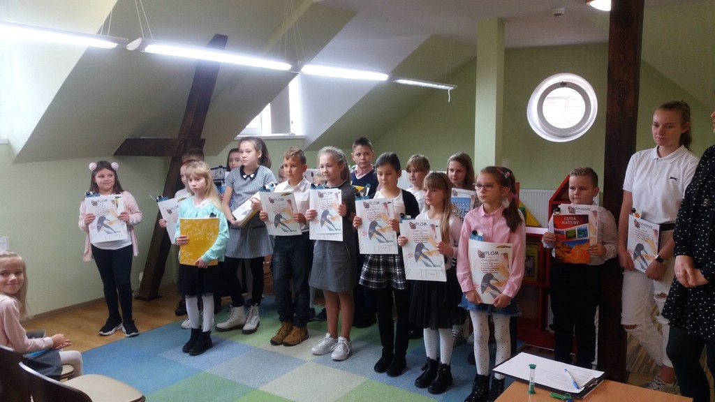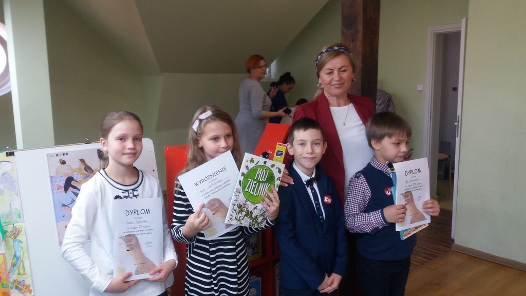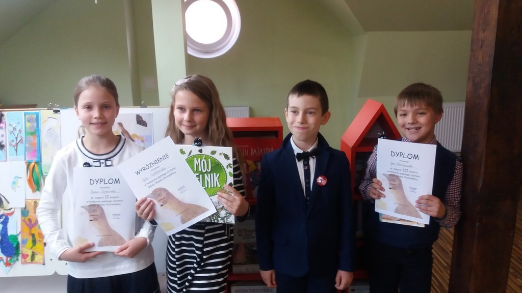 Miejska Biblioteka Publiczna w Lęborku to instytucja , która zachęca nie tylko do wypożyczania książek, ale i do uczestnictwa w rozmaitych konkursach. Dnia 25 października miało tam miejsce rozstrzygnięcie dwóch konkursów : plastycznego oraz czytelniczego pod hasłem ,,Nasze ptaki". Konkurs ten zainspirowany był twórczością Wandy Chotomskiej. W zmaganiach plastycznych uczniowie mieli za zadanie wykonanie zakładki do książki z motywem ptaków. Komisja konkursowa spośród 95 nadesłanych prac wyłoniła te najlepsze. Miło nam oznajmić, że w gronie laureatów znalazły się dwie nasze uczennice, które otrzymały wyróżnienia: