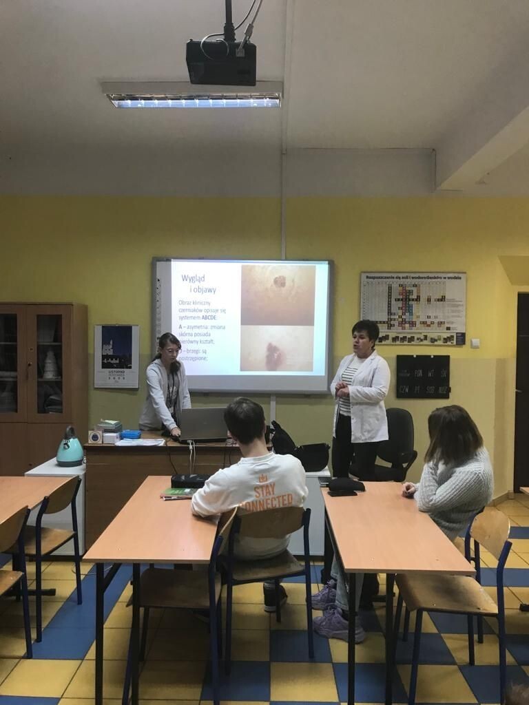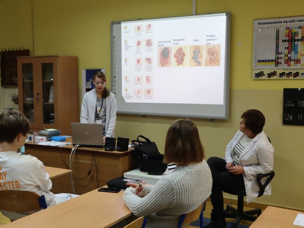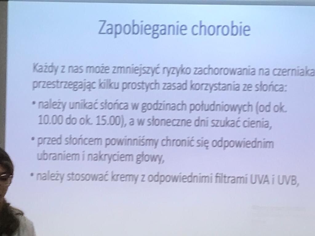 W ramach prezentacji przypomniano uczniom budowę skóry i wskazano związek pomiędzy nadmierną ekspozycją na promienie ultrafioletowe a zachorowalnością na nowotwory skóry. Uczniowie poznali zasady profilaktyki czerniaka i nabyli umiejętność samobadania skóry oraz różnicowania podejrzanych zmian o charakterze nowotworowym ze zwykłymi zmianami.