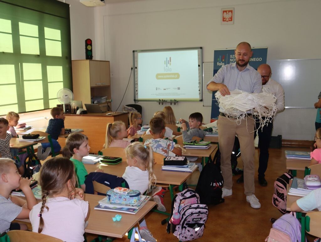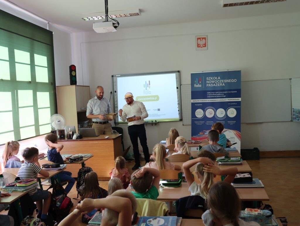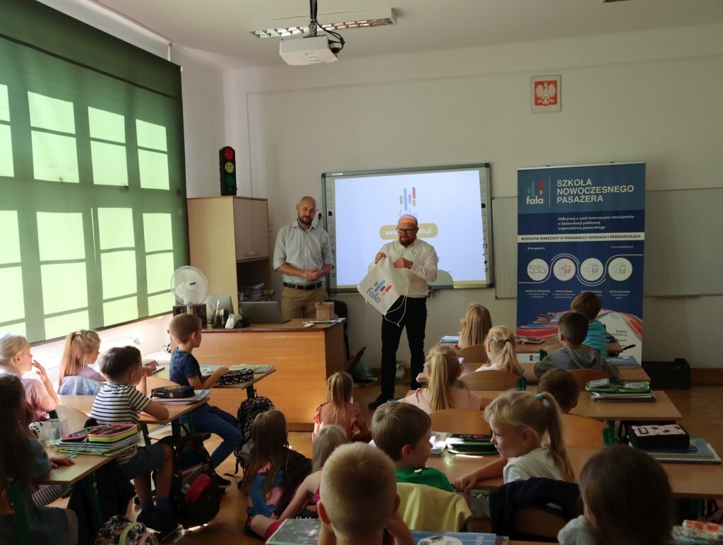 23 września br. naszych pierwszoklasistów odwiedzili przedstawiciele firmy Fala. Spotkanie związane było z nowymi legitymacjami szkolnymi w formie plastikowego blankietu, które właśnie otrzymali uczniowie klas pierwszych. Legitymacja szkolna posiada również elektroniczny moduł transportowy. Oprócz tego, że jest dokumentem, po aktywacji Systemu FALA stanowi też w pełni funkcjonalną Kartę FALA, umożliwiającą poruszanie się komunikacją miejską po Trójmieście, Lęborku, Słupsku, Chojnicach, Pucku i Władysławowie, a niebawem także koleją po całym województwie. Podczas kontroli biletów uczeń będzie okazywał tylko legitymację – jako dokument potwierdzający ulgę oraz jako nośnik biletu. Podczas spotkania uczniowie otrzymali drobne upominki oraz foldery dla rodziców zawierające informacje na temat aktywacji systemu.