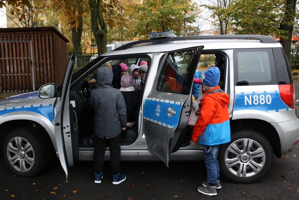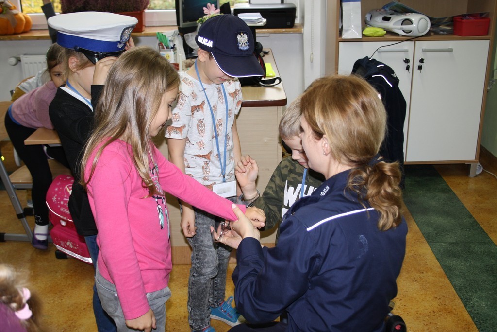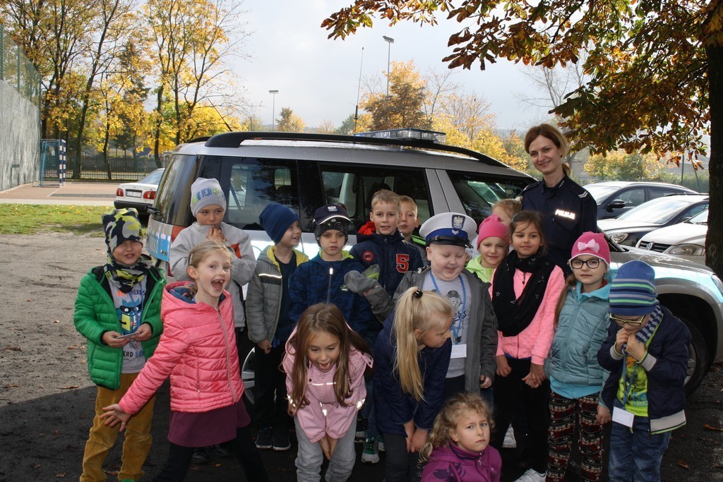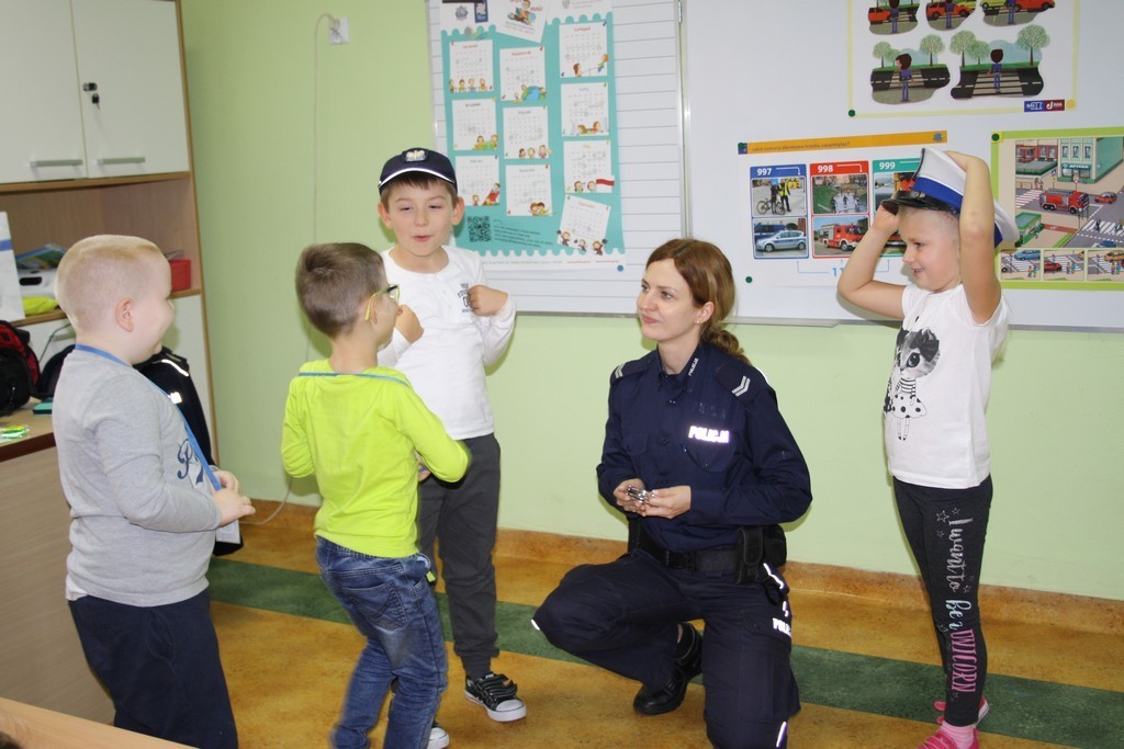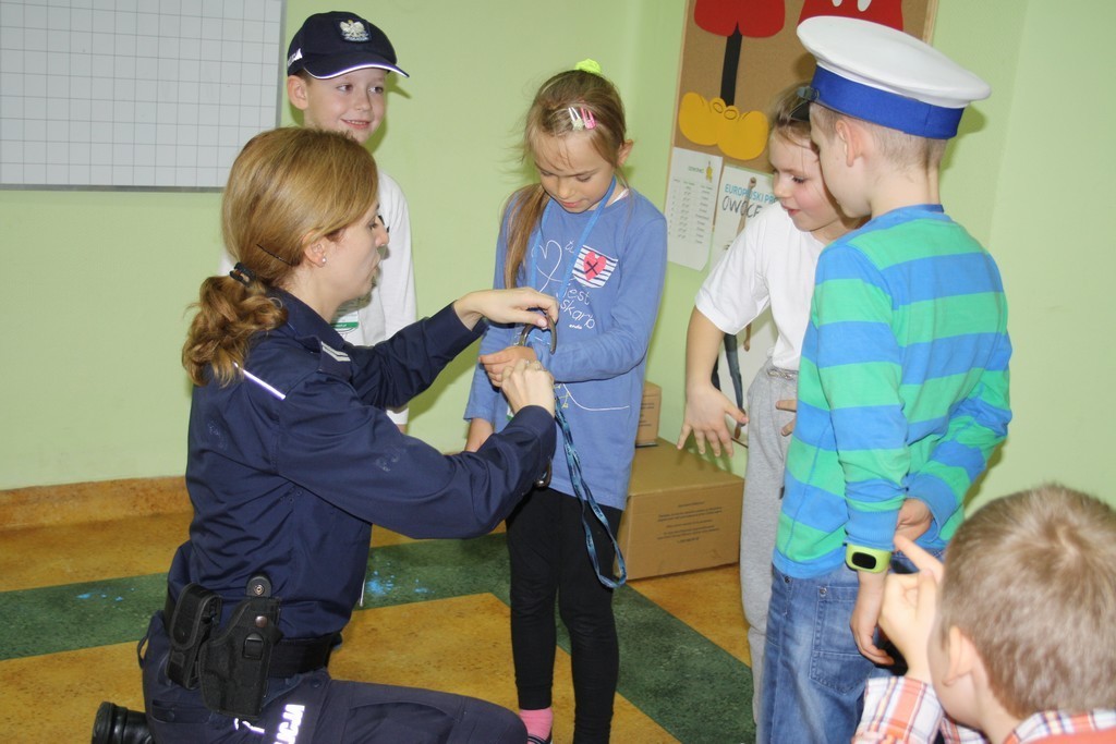 Tematem tej niecodziennej lekcji były zasady dotyczące bezpieczeństwa na drodze. Pani policjantka przypomniała pierwszoklasistom jak bezpiecznie poruszać się po drodze oraz jak prawidłowo korzystać z numerów alarmowych. Wszystkie dzieci wykazały się dużą wiedzą w omawianym zakresie, chętnie odpowiadały na pytania. Dodatkową atrakcją było obejrzenie policyjnego radiowozu oraz zabawa „w policjantów i złoczyńców”.