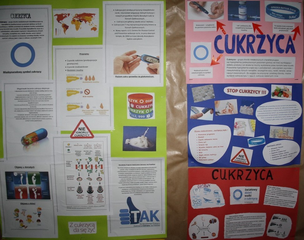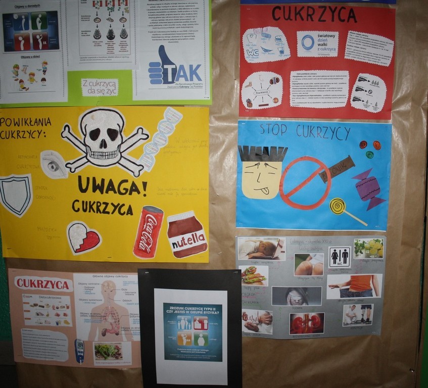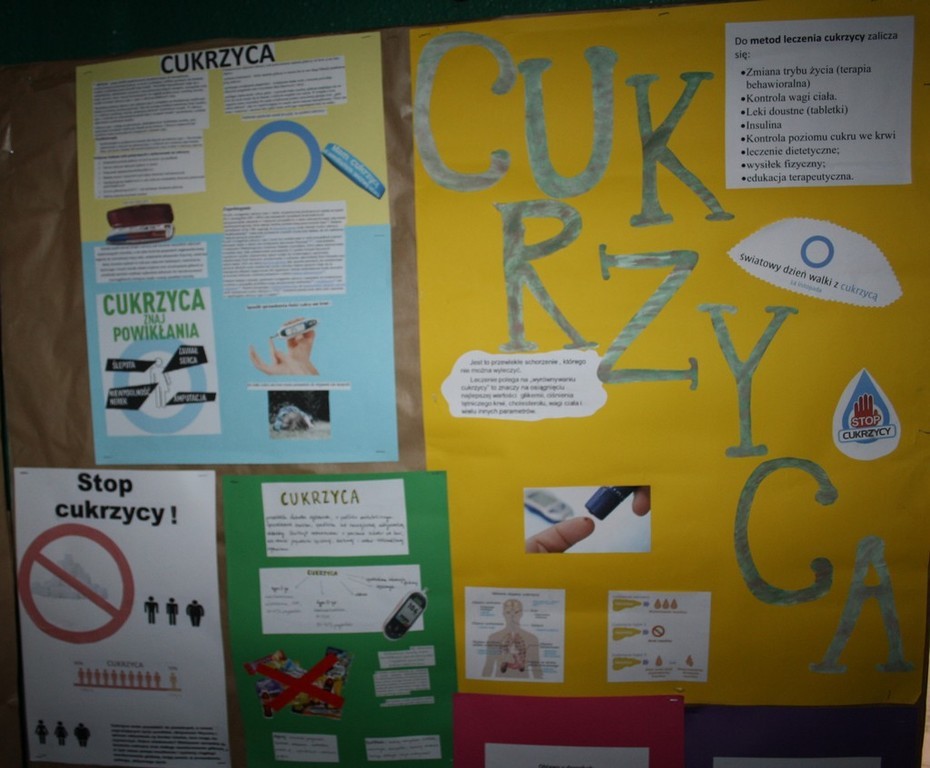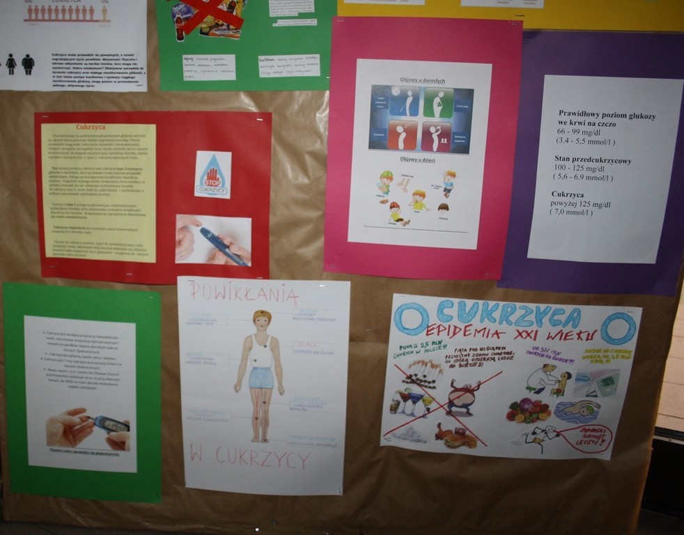 W ramach działań prozdrowotnych na lekcji biologii uczniowie zapoznali się z prezentacją zawierającą informacje na temat cukrzycy . Poszerzono wiadomości o objawach na jakie powinniśmy zwracać uwagę, ponieważ mogą świadczyć o istnieniu tej choroby oraz o trybie życia prowadzonym przez ludzi , którzy są już chorzy. Uczniowie wykonali albumy o cukrzycy a swoje prace wyeksponowali w formie wystawy prac plastycznych.