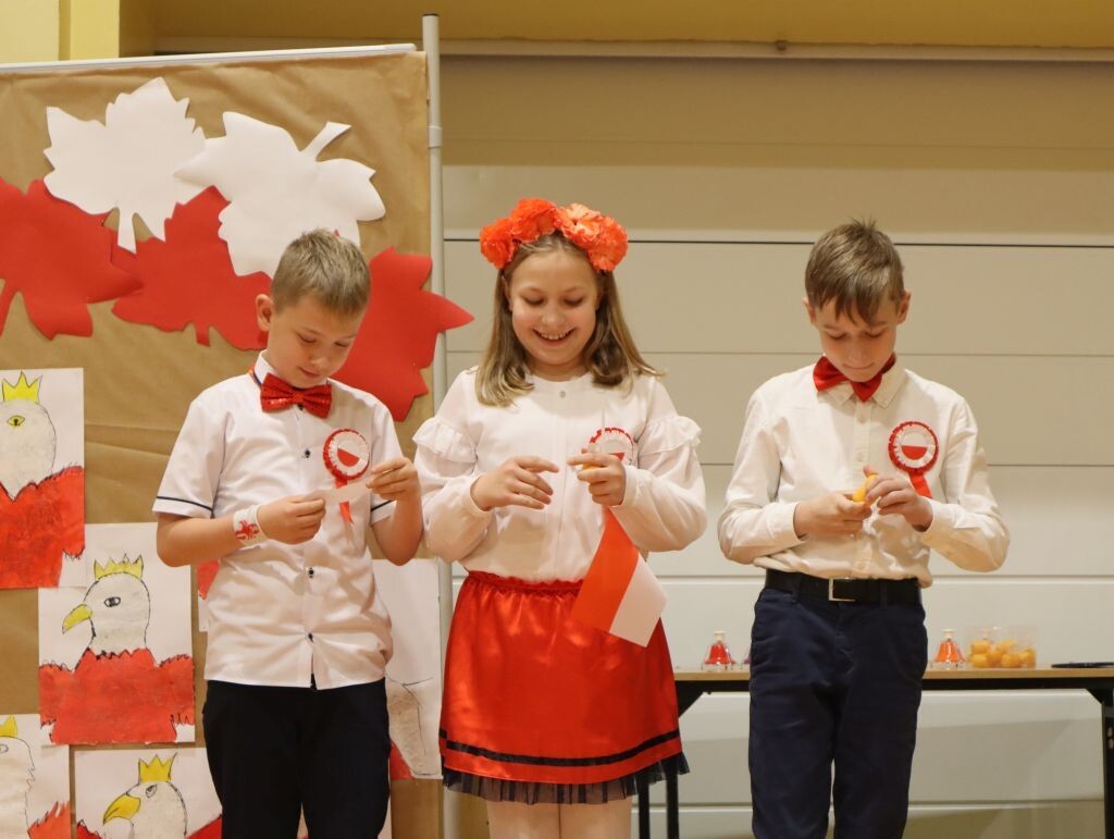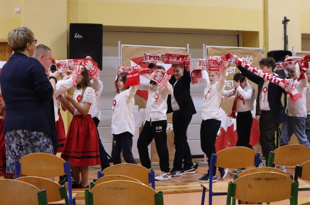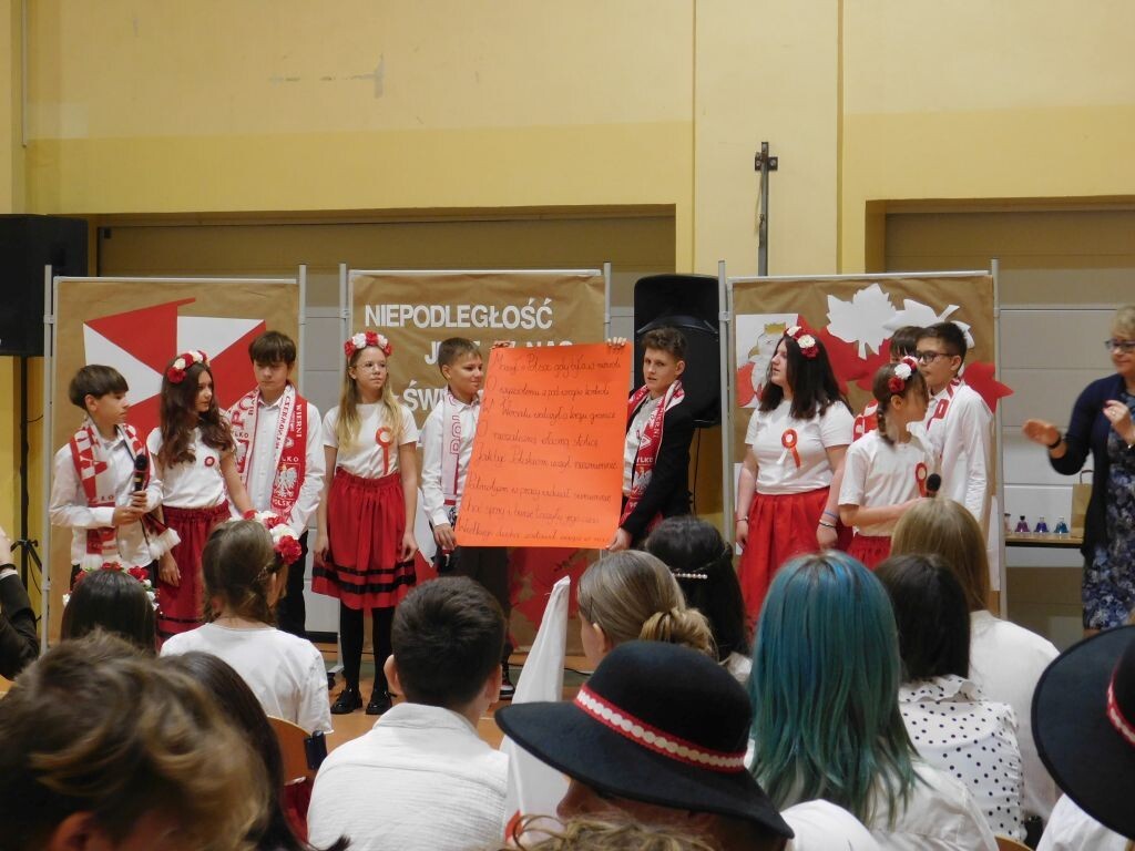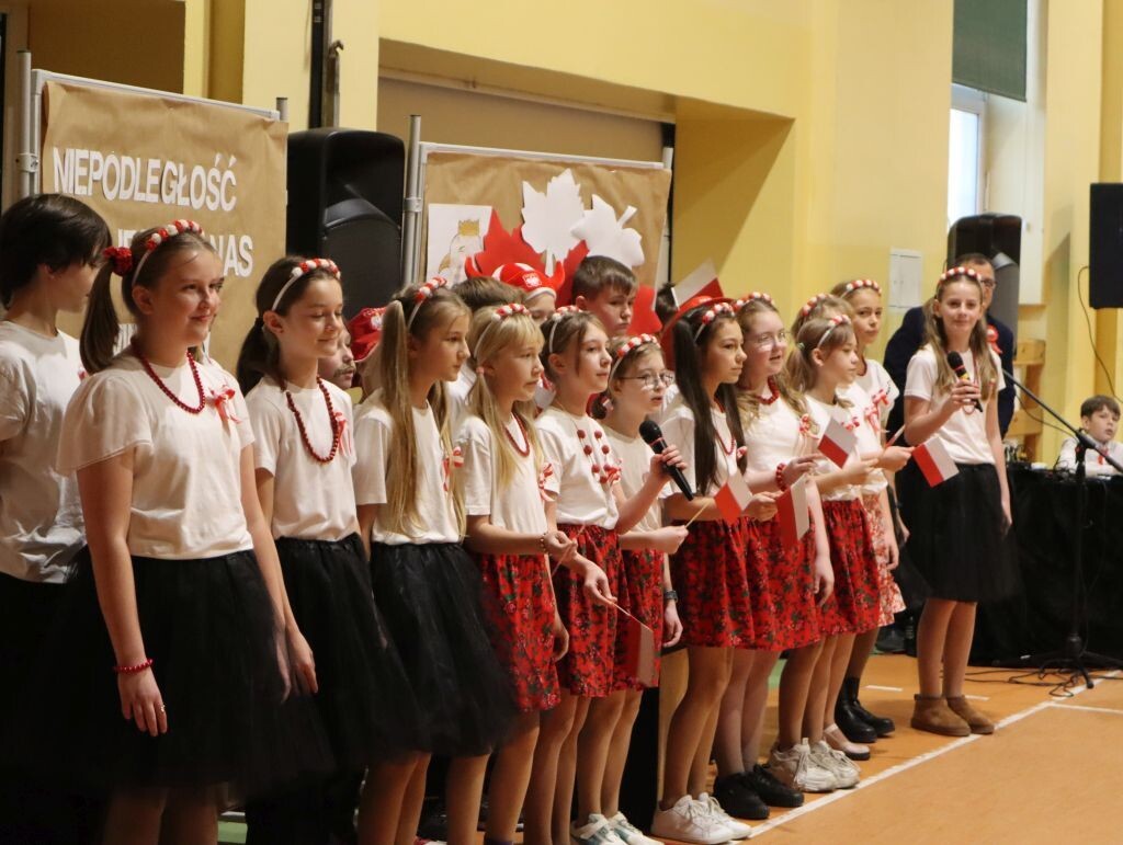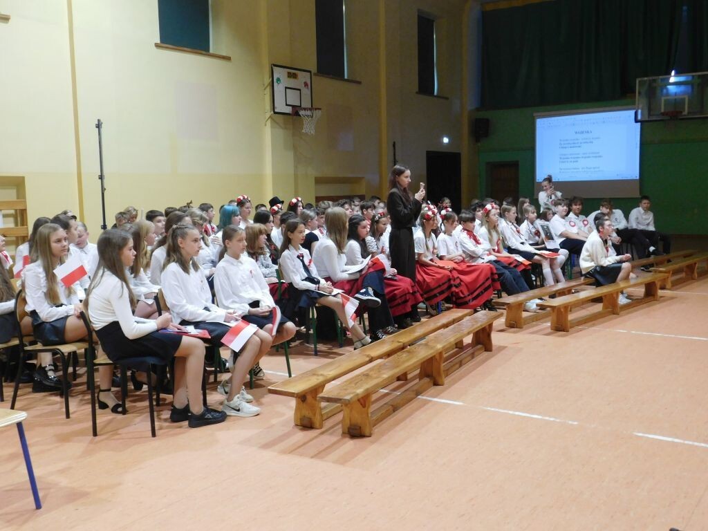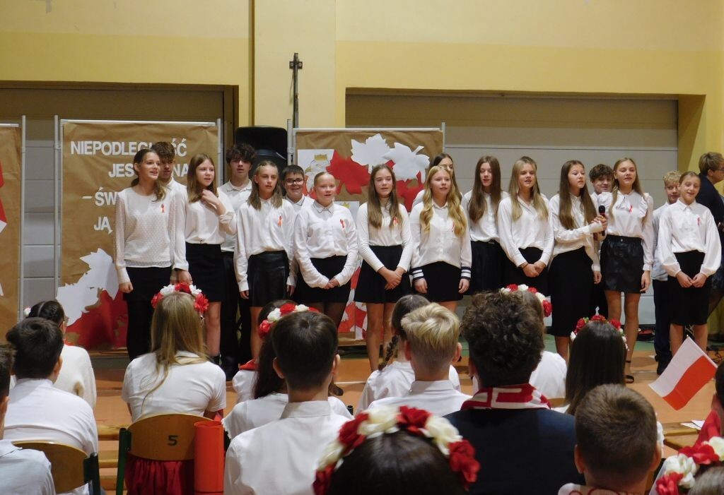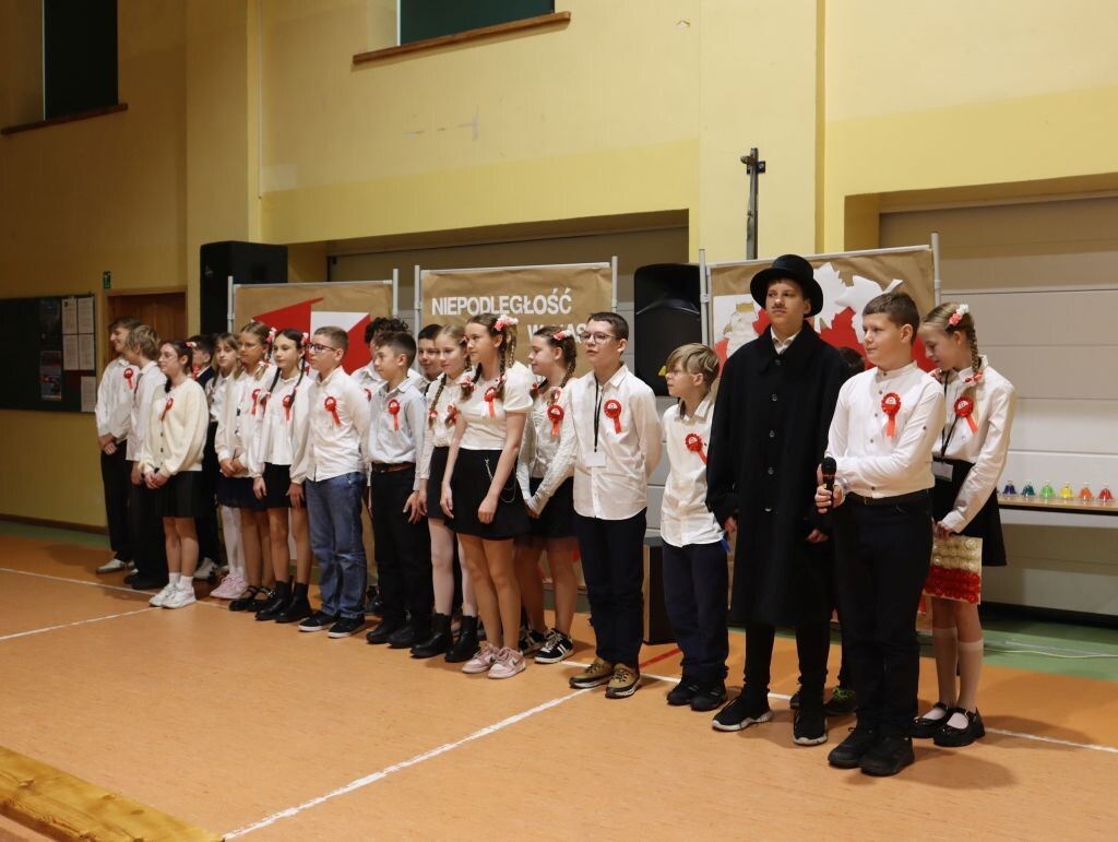 W miniony piątek obchodziliśmy w naszej szkole 107. rocznicę odzyskania niepodległości przez Polskę. Uczciliśmy ten dzień, wyrażając swój patriotyzm i pamięć o bohaterach, którzy przez 123 lata zaborów walczyli i oddawali życie w imię wolności Polski. Tego dnia uczniowie klas 4-7 uczestniczyli w Wielkim Turnieju Młodych Polaków, do którego przygotowywali się od kilku tygodni. Zadaniem każdej klasy było zaśpiewanie wylosowanej pieśni legionowej, przygotowanie wiersza o postaci związanej z niepodległością, udział w quizie wiedzowym oraz przemarsz w barwnym korowodzie. Uczniowie przygotowali się do tego wydarzenia wzorowo - było patriotycznie, uroczyście i radośnie. Tego samego dnia uczniowie klas ósmych przygotowali i przeprowadzili lekcje dla swoich młodszych kolegów i koleżanek z klas I-III, dotyczące wydarzeń związanych z tematem niepodległości.