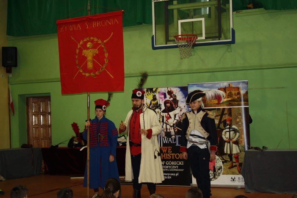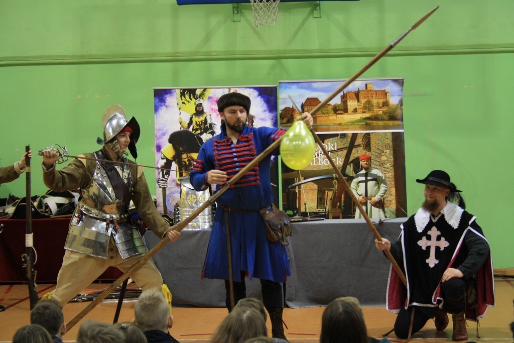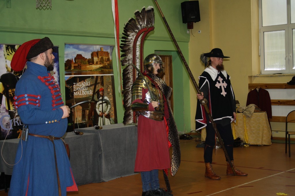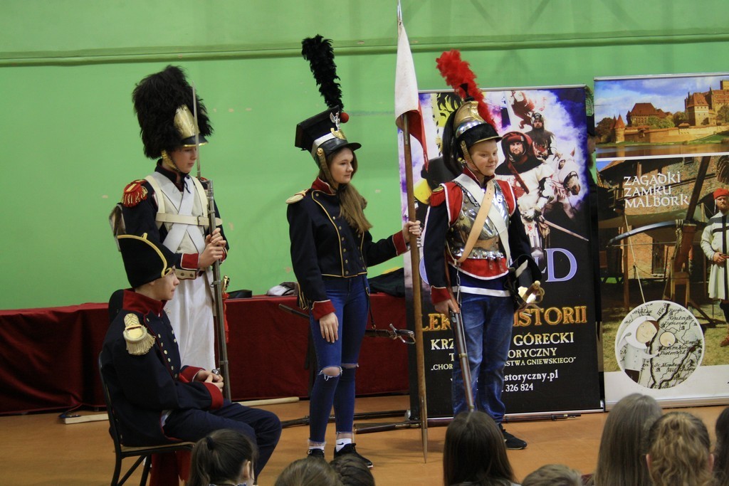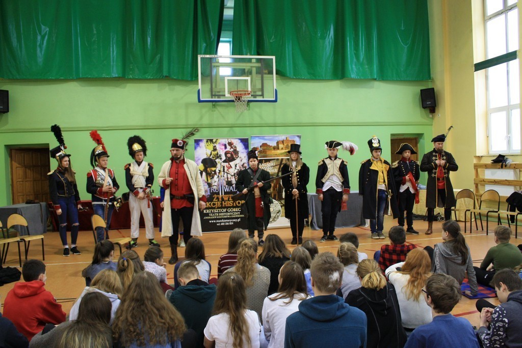 To efekt naszej wieloletniej współpracy z teatrem historycznym Krzysztofa Góreckiego. W szkole przeprowadziliśmy dwa pokazy: dla uczniów klas II gimnazjum - związany z tematyką zajęć dotyczących demokracji szlacheckiej, a dla uczniów klas VII - od czasów Napoleona po Odzyskanie Niepodległości. Każda cześć pokazu była zachwycająca. Prowadzący w sposób barwny i ciekawy wprowadzili w nastrój epok historycznych. Uczniowie mogli osobiście doświadczyć pojedynków i przymierzyć stroje z epoki. Całość okraszona sporą dawką uśmiechu i dowcipu wprowadzała uczestników w dobry nastrój.
