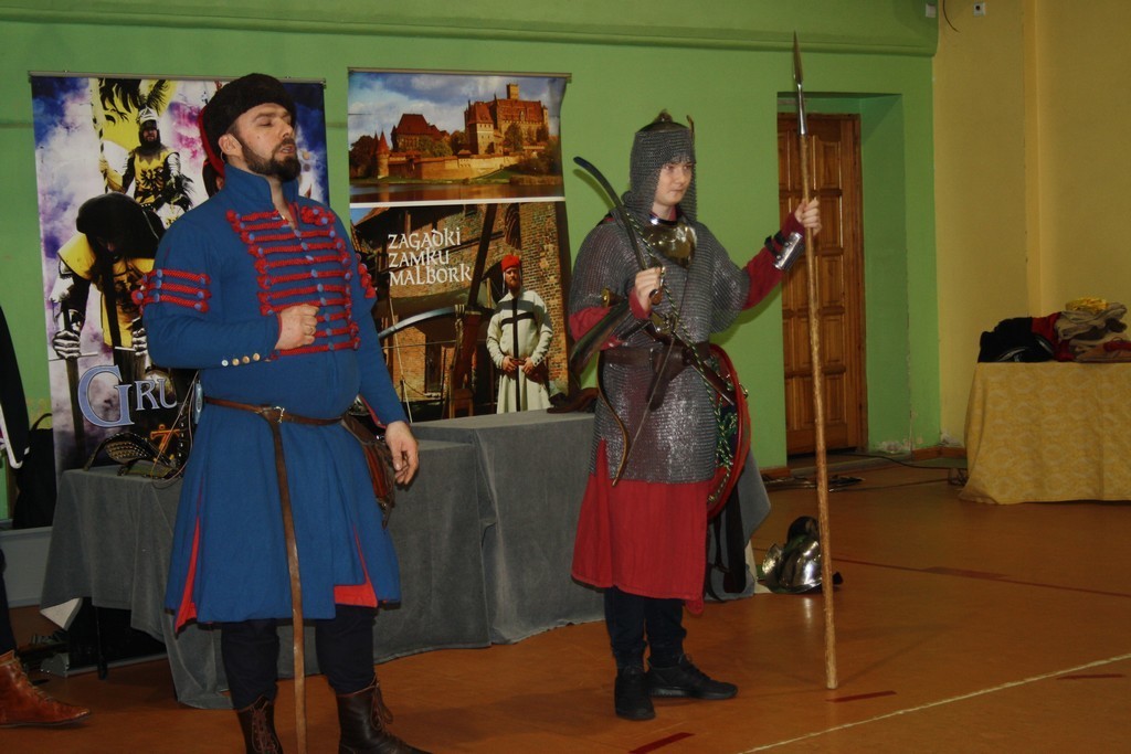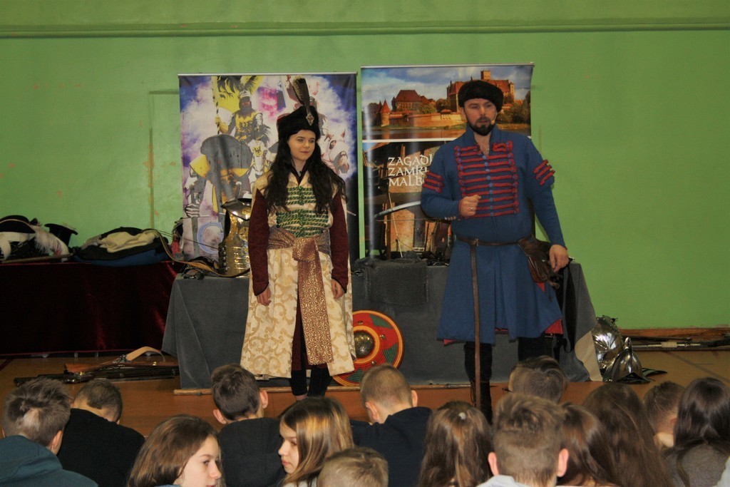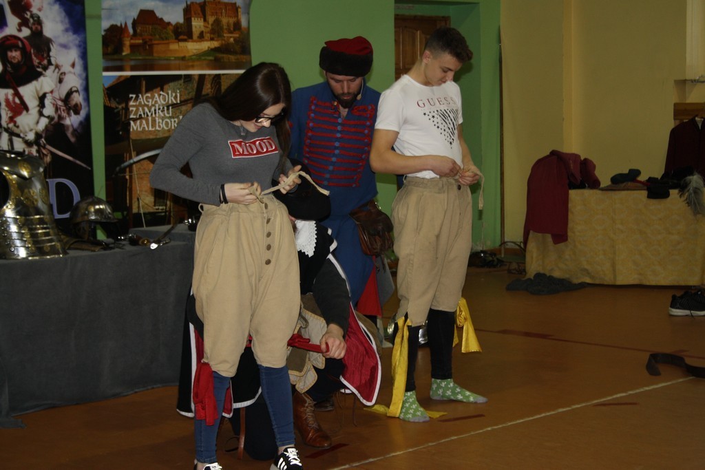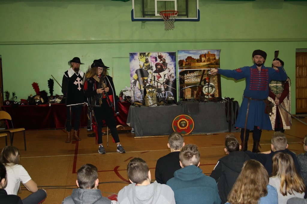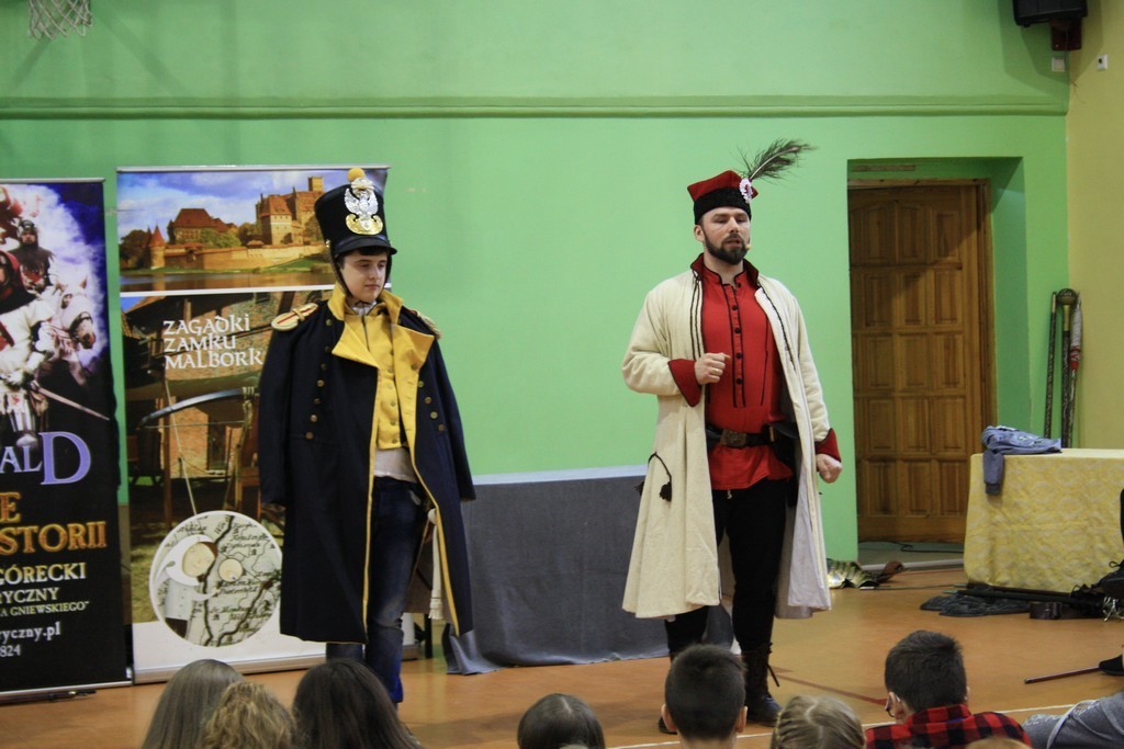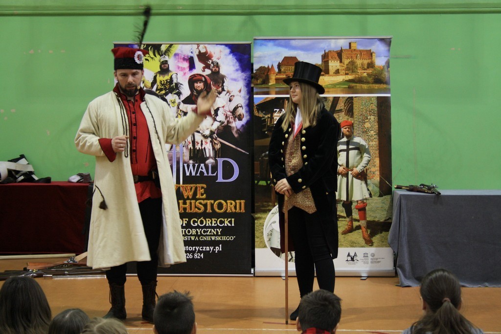 To efekt naszej wieloletniej współpracy z teatrem historycznym Krzysztofa Góreckiego. W szkole przeprowadziliśmy dwa pokazy: dla uczniów klas II gimnazjum - związany z tematyką zajęć dotyczących demokracji szlacheckiej, a dla uczniów klas VII - od czasów Napoleona po Odzyskanie Niepodległości. Każda cześć pokazu była zachwycająca. Prowadzący w sposób barwny i ciekawy wprowadzili w nastrój epok historycznych. Uczniowie mogli osobiście doświadczyć pojedynków i przymierzyć stroje z epoki. Całość okraszona sporą dawką uśmiechu i dowcipu wprowadzała uczestników w dobry nastrój.