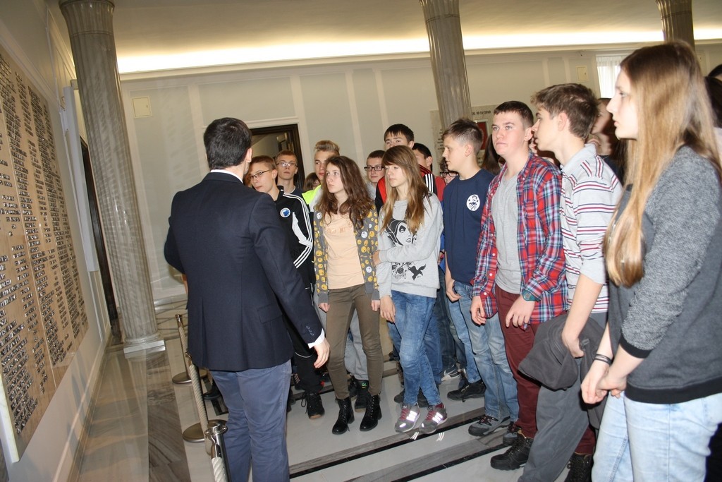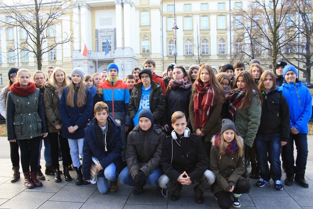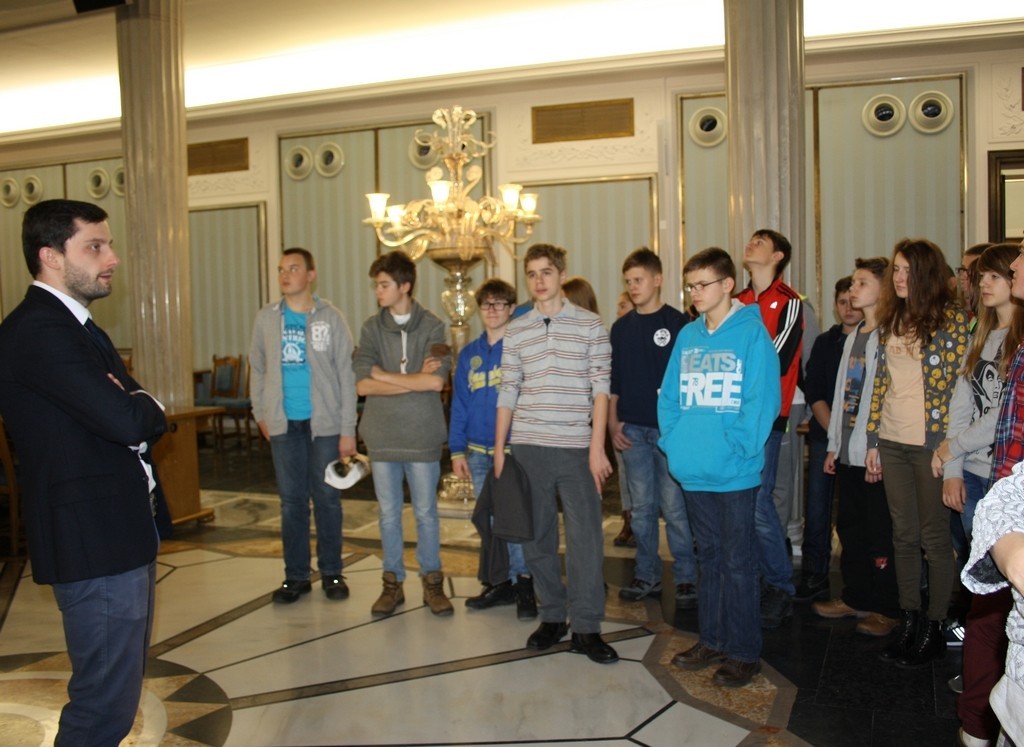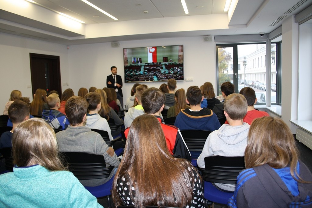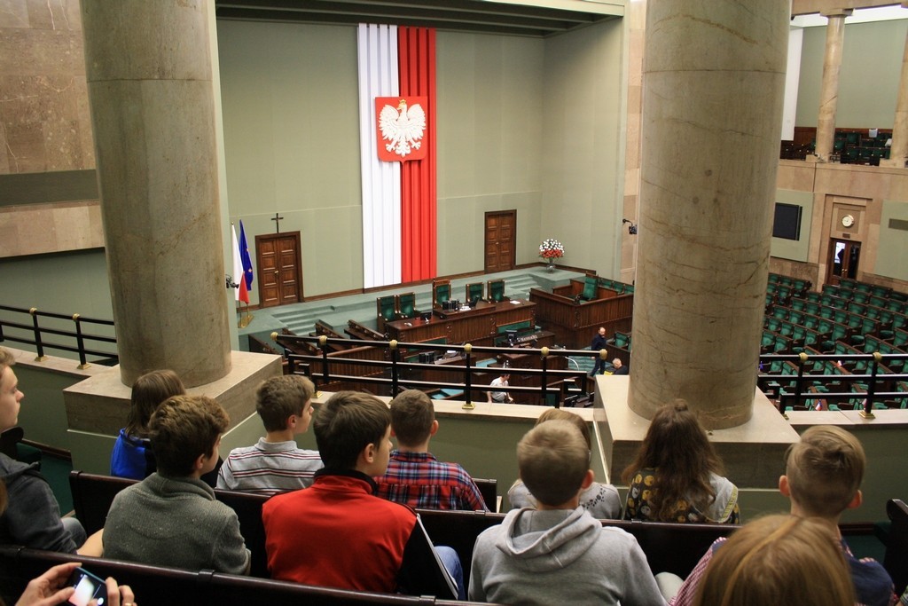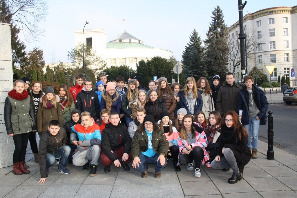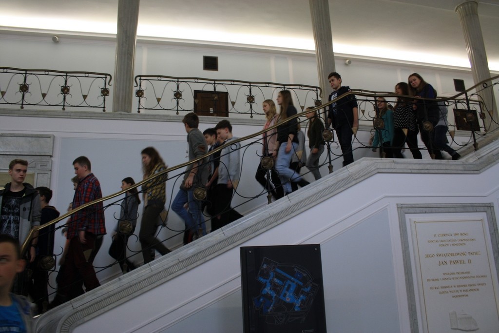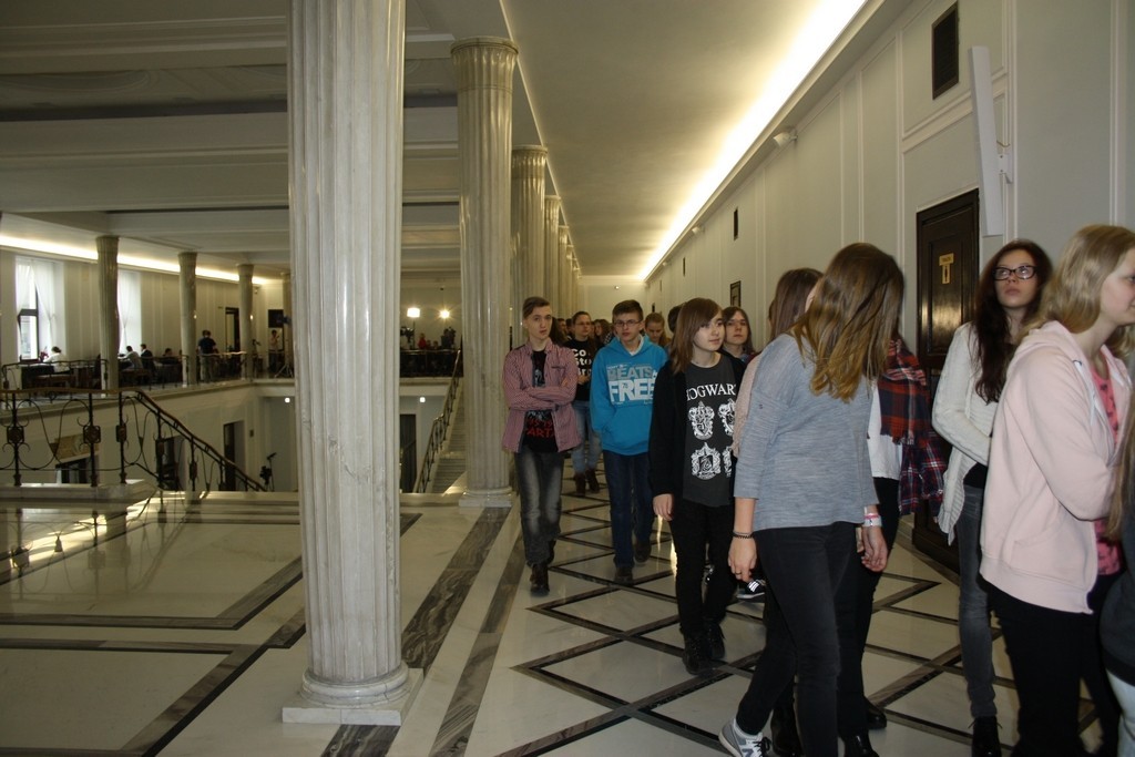 Pierwszym punktem wyprawy była wizyta w budynku Sejmu Rzeczypospolitej Polskiej. Tam czekał na nas przewodnik, który oprowadził nas po Sali obrad i innych pomieszczeniach, opowiadając o pracy posłów oraz senatorów. W holu głównym zapoznaliśmy się z tablicą upamiętniającą posłów II Rzeczypospolitej, którzy zginęli podczas II wojny światowej. Obejrzeliśmy również makietę wszystkich sejmowych zabudowań a następnie udaliśmy się do Sali Kolumnowej. Wizyta w Sejmie pozwoliła porównać nasze wrażenia z gmachem znanym nam z telewizyjnego ekranu i poczuć jego atmosferę.