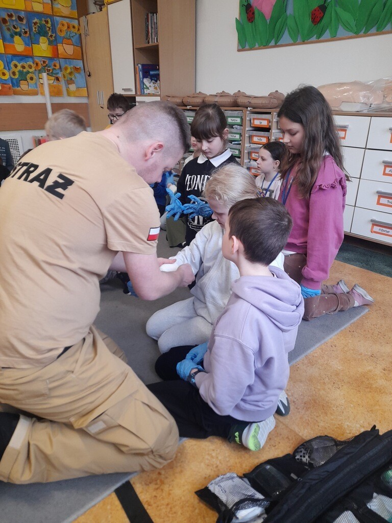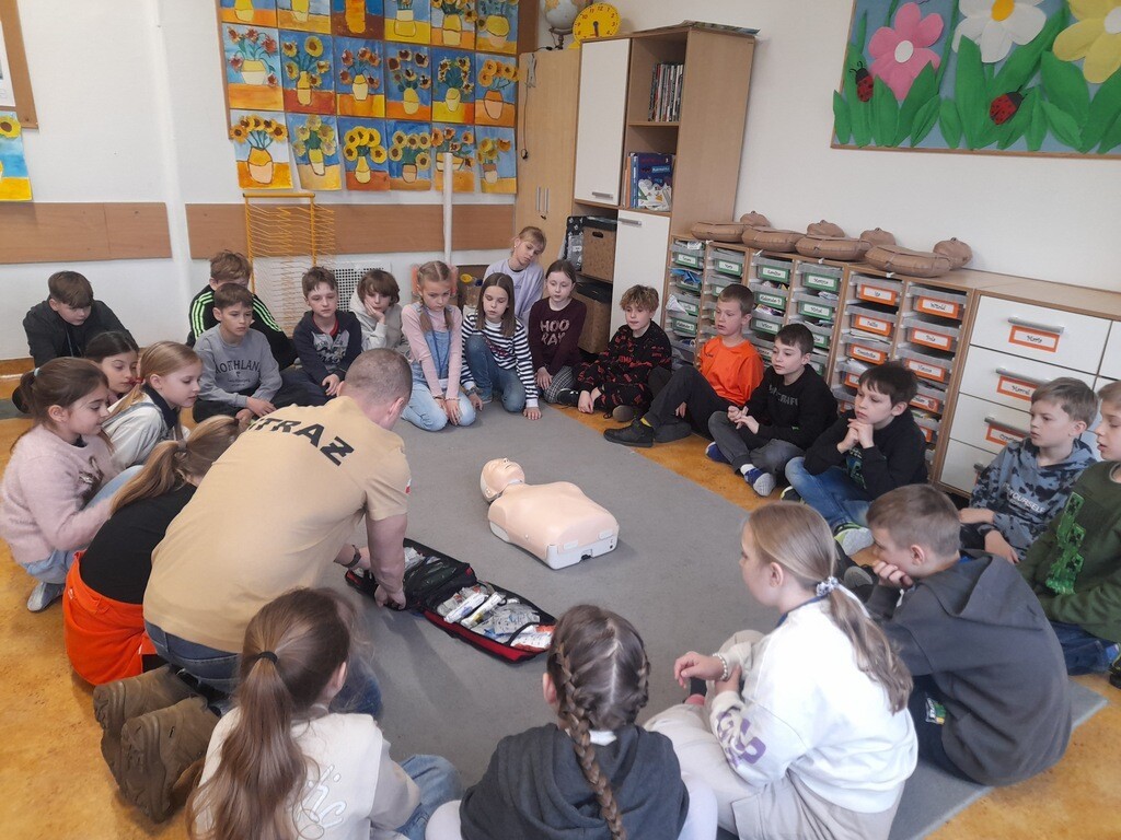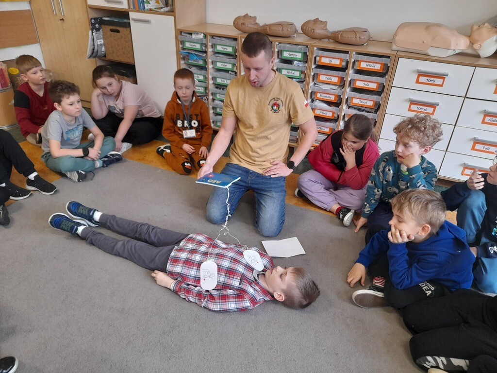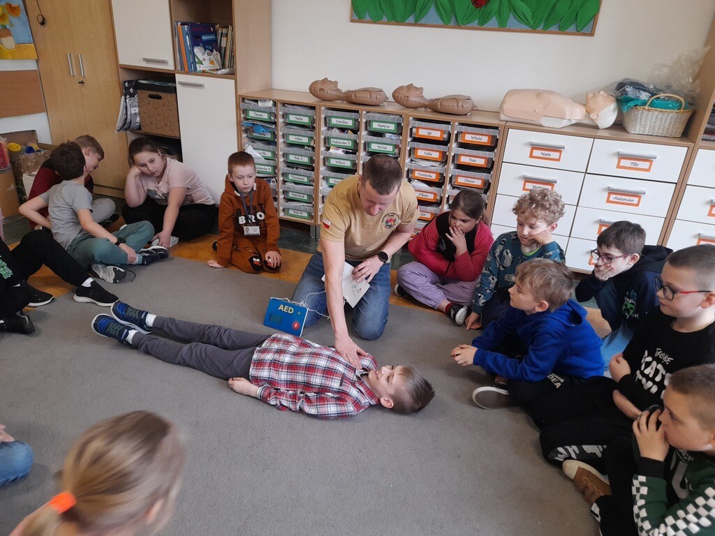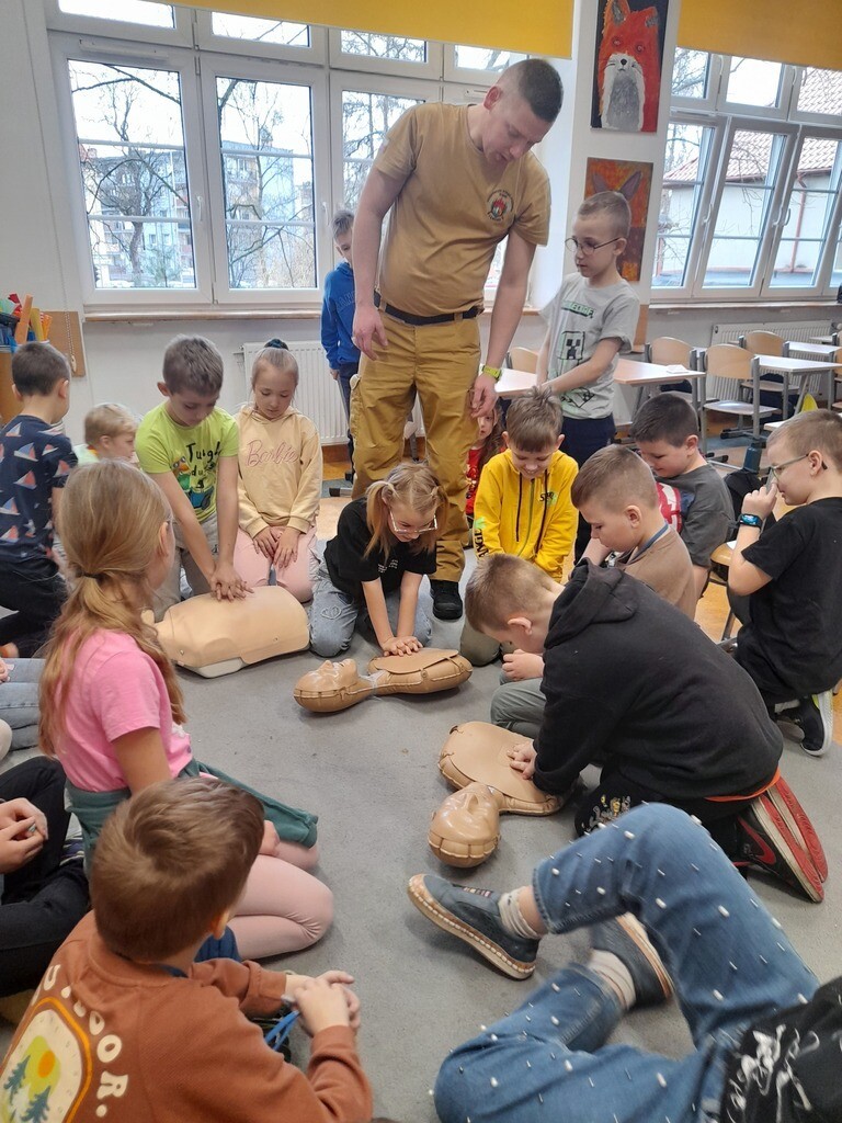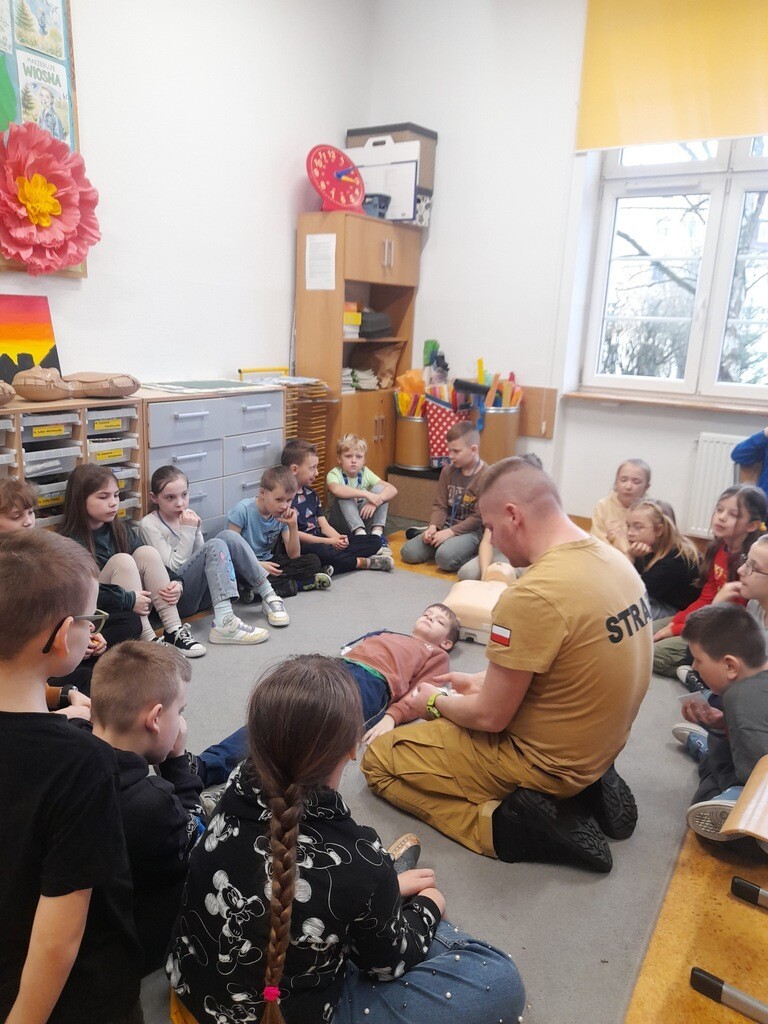 W środę, 26 marca, naszą szkołę odwiedzili panowie Mateusz Wołocznik oraz Sebastian Matusiak - strażacy z Komendy Powiatowej Państwowej Straży Pożarnej Lęborku, którzy pracują również jako ratownicy medyczni. Panowie przeprowadzili dla uczniów klas 1-3 bardzo ciekawe lekcje z zakresu pierwszej pomocy przedmedycznej. Dzieci uczestniczące w zajęciach miały okazję poznać podstawowe zasady udzielania pierwszej pomocy w przypadku zatrzymania krążenia, zarówno u osoby dorosłej jak i u dziecka. Utrwaliły również wiadomości dotyczące wzywania pomocy, ułożenia osoby poszkodowanej w pozycji bocznej ustalonej, opatrywania ran oraz reagowania w sytuacji zadławienia. Dzięki takim zajęciom uczniowie już od najmłodszych lat oswajają się ze świadomością konieczności niesienia pomocy osobom poszkodowanym. Uczą się odpowiedniego i odpowiedzialnego zachowania w sytuacji wypadku, potrafią wezwać prawidłowo pomoc przez telefon oraz wykonać najprostsze czynności w ramach pierwszej pomocy.