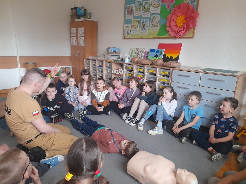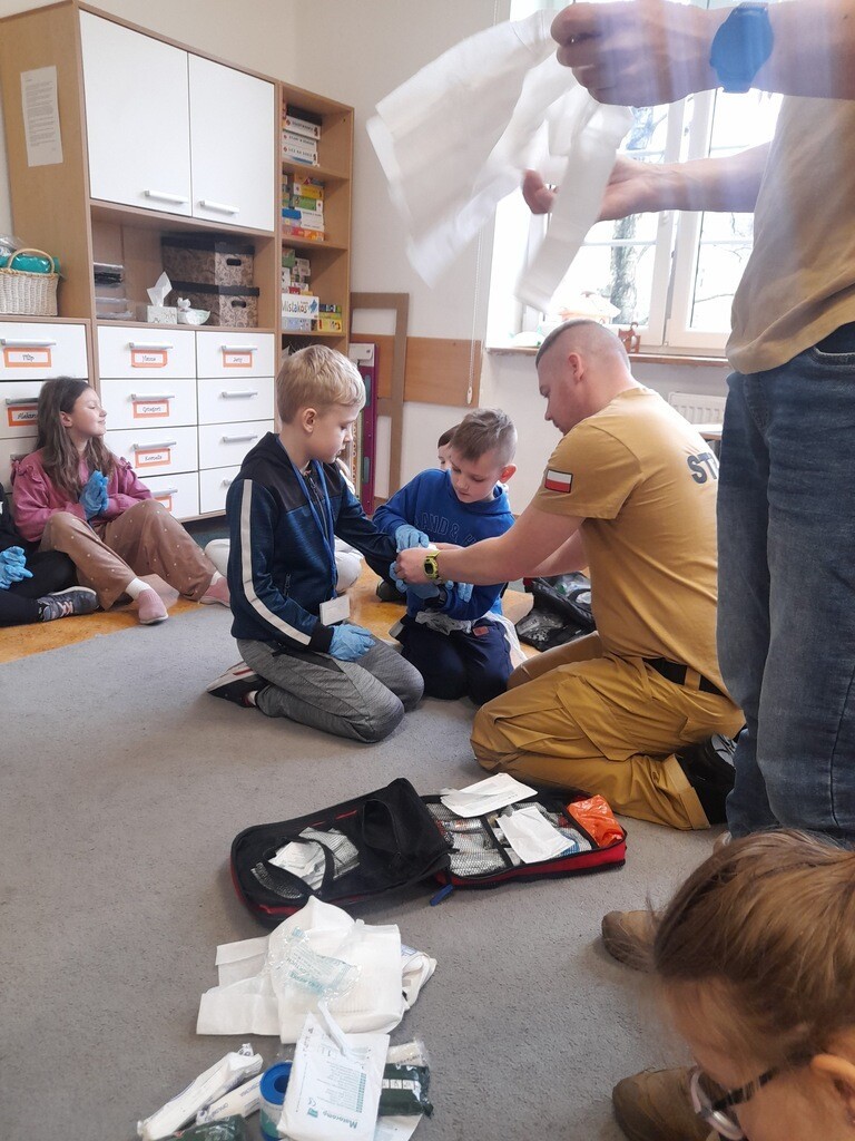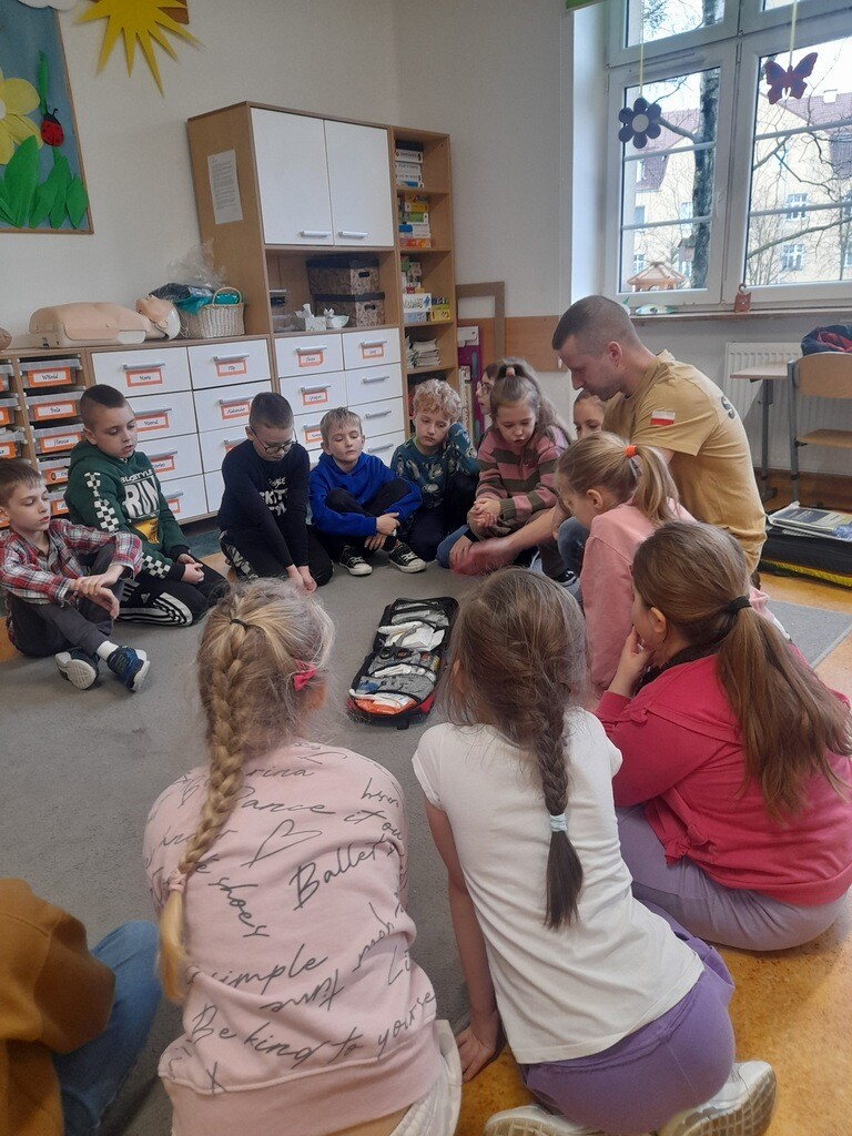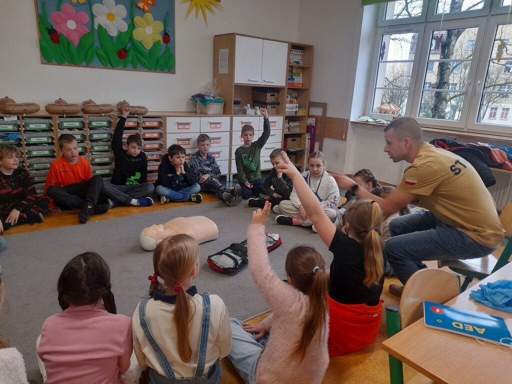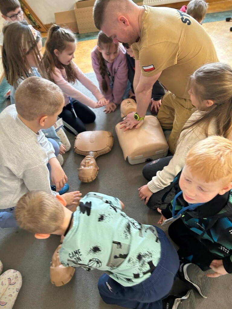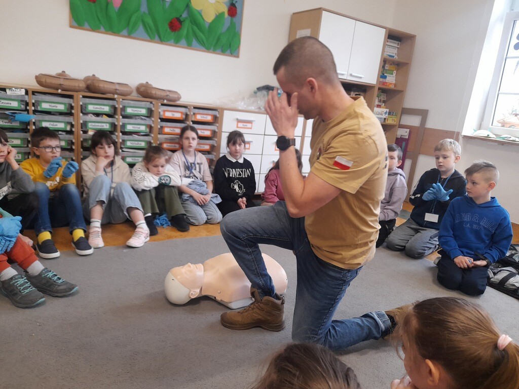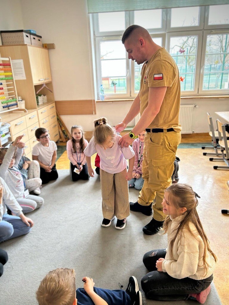 W środę, 26 marca, naszą szkołę odwiedzili panowie Mateusz Wołocznik oraz Sebastian Matusiak - strażacy z Komendy Powiatowej Państwowej Straży Pożarnej Lęborku, którzy pracują również jako ratownicy medyczni. Panowie przeprowadzili dla uczniów klas 1-3 bardzo ciekawe lekcje z zakresu pierwszej pomocy przedmedycznej. Dzieci uczestniczące w zajęciach miały okazję poznać podstawowe zasady udzielania pierwszej pomocy w przypadku zatrzymania krążenia, zarówno u osoby dorosłej jak i u dziecka. Utrwaliły również wiadomości dotyczące wzywania pomocy, ułożenia osoby poszkodowanej w pozycji bocznej ustalonej, opatrywania ran oraz reagowania w sytuacji zadławienia. Dzięki takim zajęciom uczniowie już od najmłodszych lat oswajają się ze świadomością konieczności niesienia pomocy osobom poszkodowanym. Uczą się odpowiedniego i odpowiedzialnego zachowania w sytuacji wypadku, potrafią wezwać prawidłowo pomoc przez telefon oraz wykonać najprostsze czynności w ramach pierwszej pomocy.