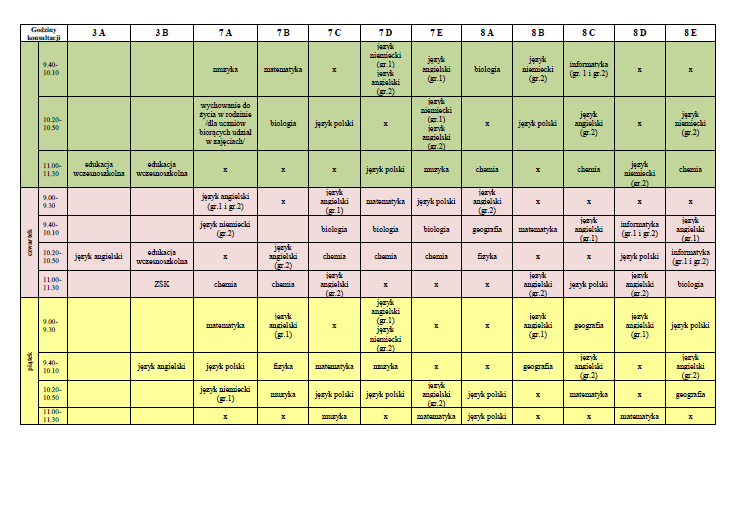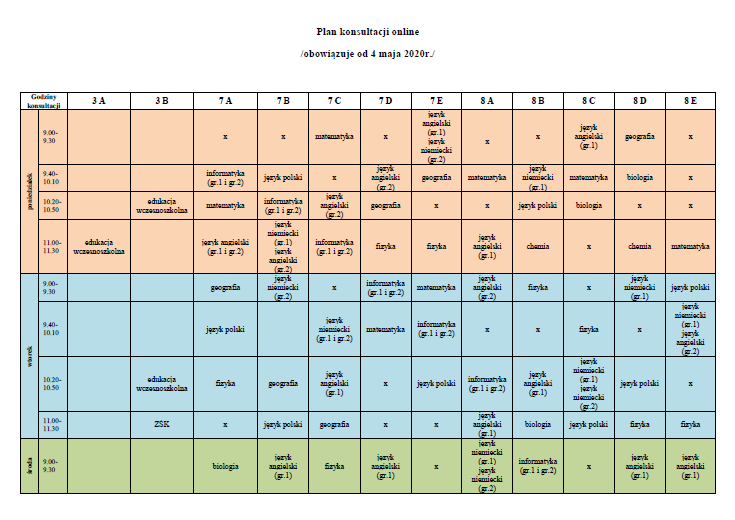 W poniższej tabeli znajduje się plan konsultacji on-line dla uczniów klas trzecich, siódmych i ósmych.