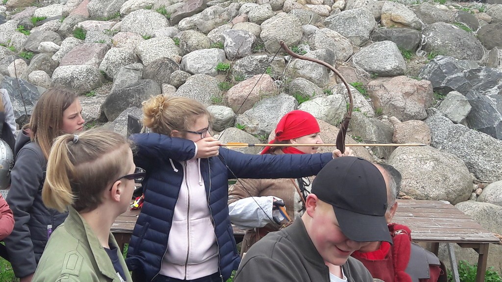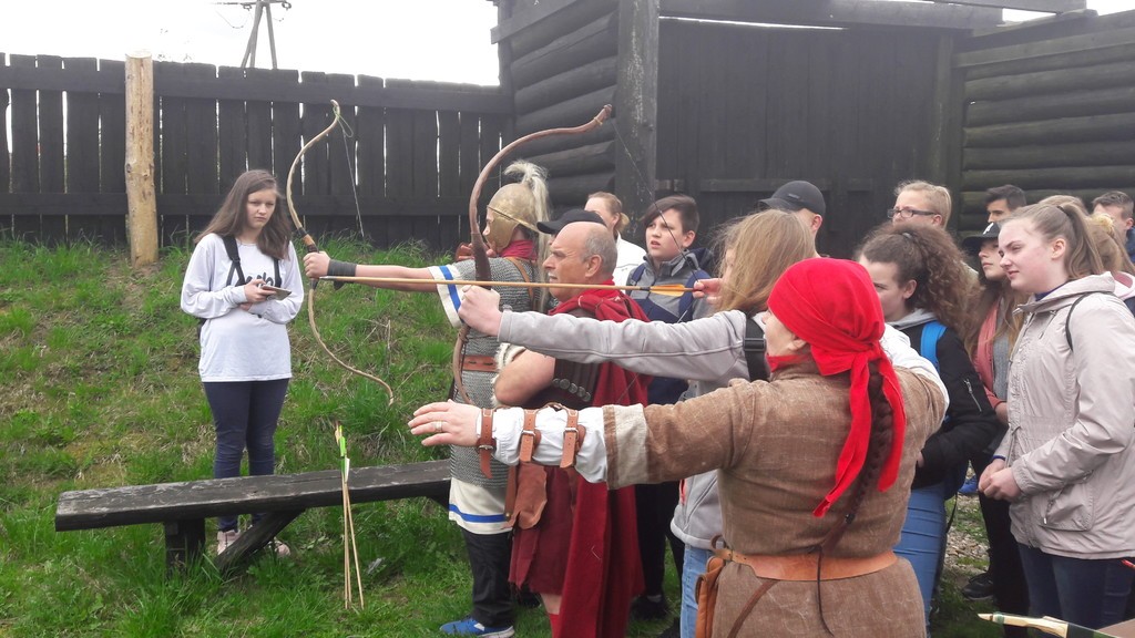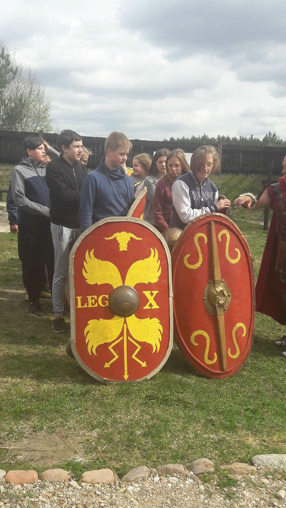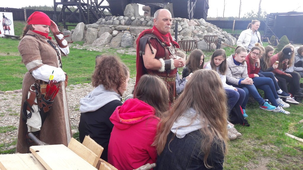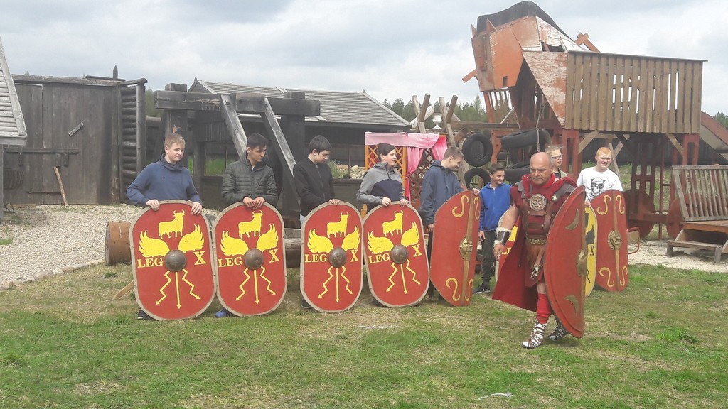 We wtorek uczniowie klasy VII b wraz z opiekunami udali się na lekcję przedmiotową w terenie do pobliskiego Oskowa, by uczestniczyć w żywej lekcji historii. Faktoria rzymska odtworzona przez centuriona Wiesława Formelę zachwyciła uczestników lekcji. Zbliżających się do osady wita Koń Trojański. Miłośnicy starożytnego Rzymu mają tu okazję zapoznać się z historią antycznego Rzymu oraz poznać zasady funkcjonowania rzymskiej armii. Właściciel osady, miłośnik kultury starożytnego Rzymu, barwnie przypomniał historię jednej z najpiękniejszych cywilizacji. Uczniowie mieli okazję zobaczyć i przymierzyć stroje dawnych legionistów, uczestniczyć w musztrze, zobaczyć jaka była taktyka walki legionów. Utalentowana w łucznictwie Pani Marzena Goike pokazała uczniom zasady strzelania do tarczy. Potem wszyscy uczestnicy mogli spróbować tej niełatwej sztuki strzelania z łuku. Zorganizowano także zawody specjalnych zaprzęgów, co obok ducha rywalizacji wywoływało salwy śmiechu. Uczniowie zaprezentowali centurionowi grecką zorbę w podziękowaniu za gościnę.