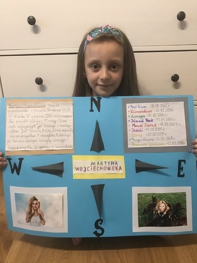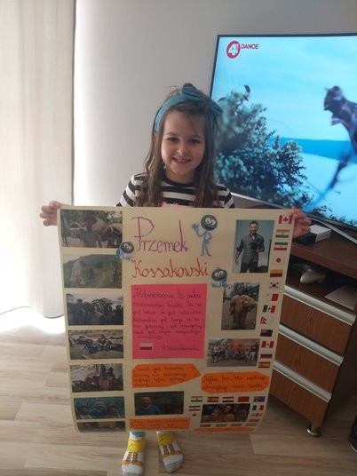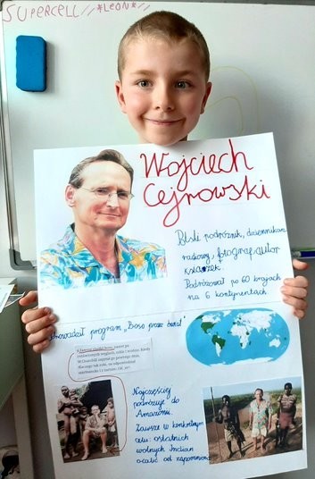 Uczniowie klasy Ia podczas zdalnych zajęć rozmawiali o podróżach i pomysłach na spędzanie wolnego czasu. Wspólnie z wychowawcą zamarzyli o dalekich wojażach w nieznane regiony świata i trochę pozazdrościli tym, dla których podróżowanie to codzienność, a także praca. Zainspirowani tym tematem postanowili stworzyć plakaty dotyczące słynnych podróżników. I tak oto powstały plakaty dotyczące m.in. Wojciecha Cejrowskiego, Martyny Wojciechowskiej czy Aleksandra Doby.