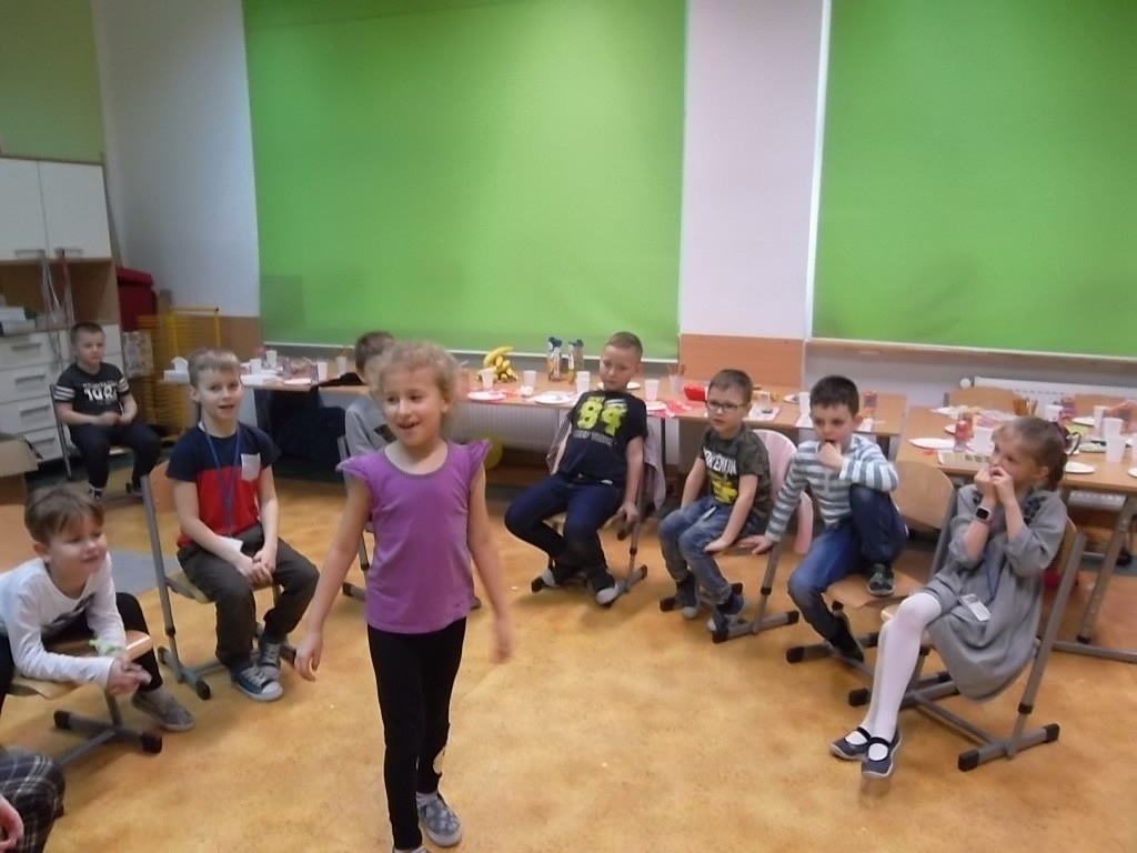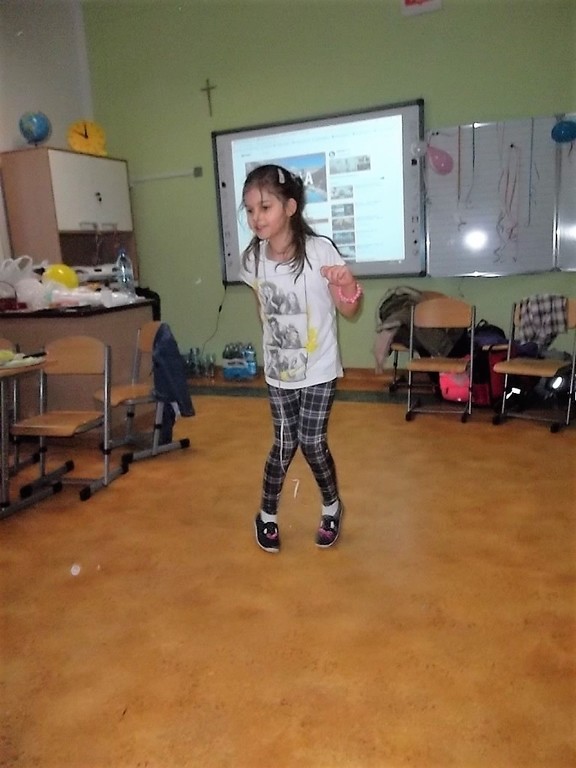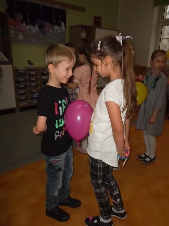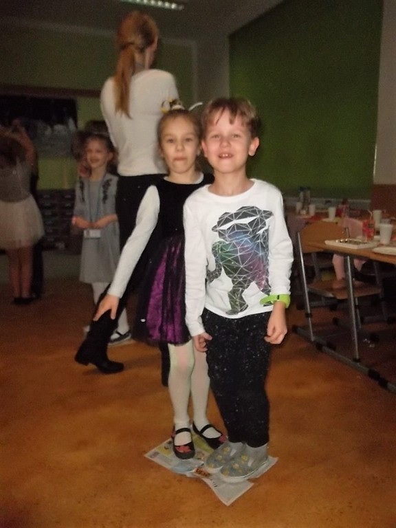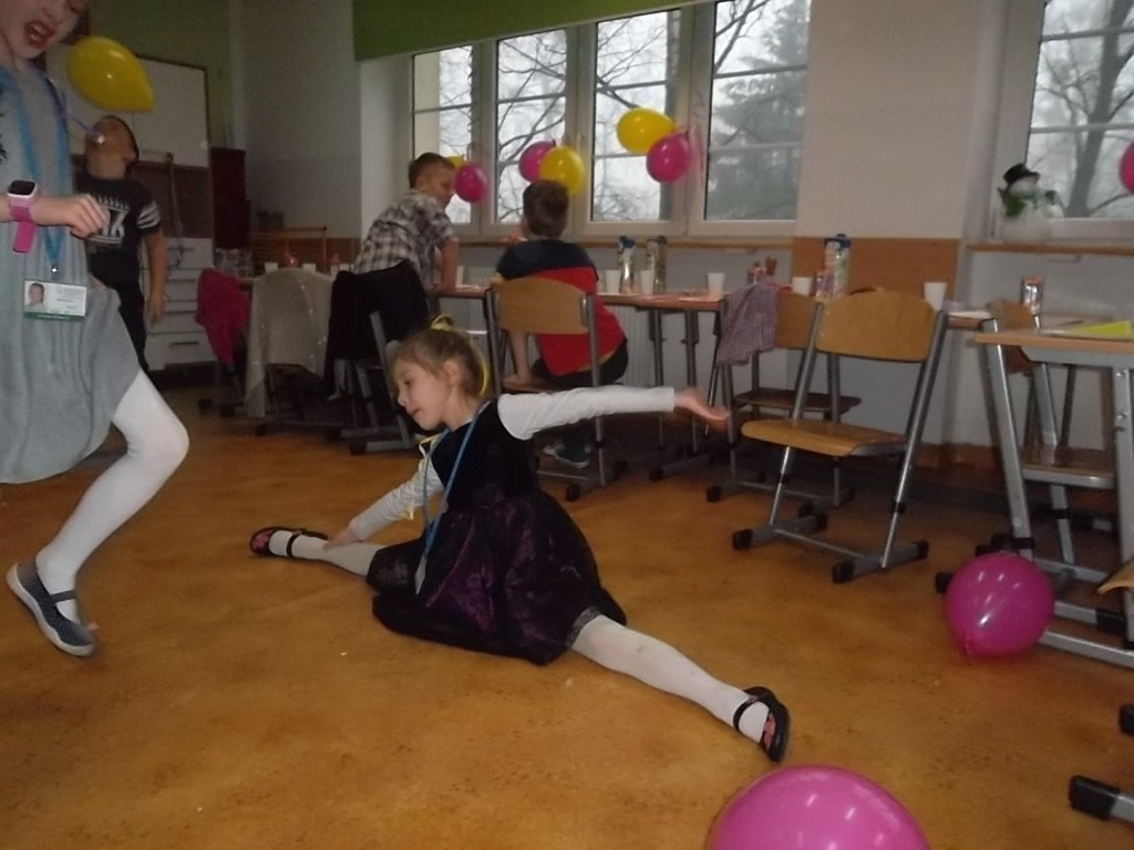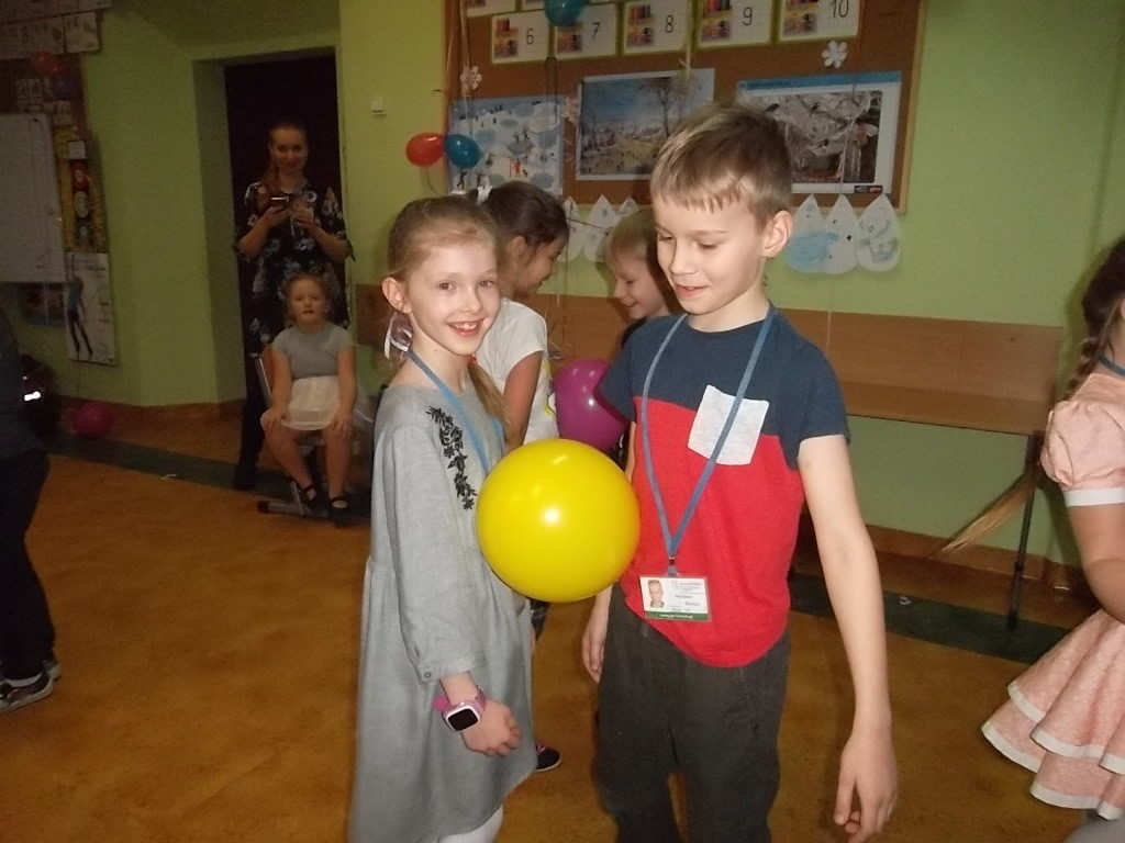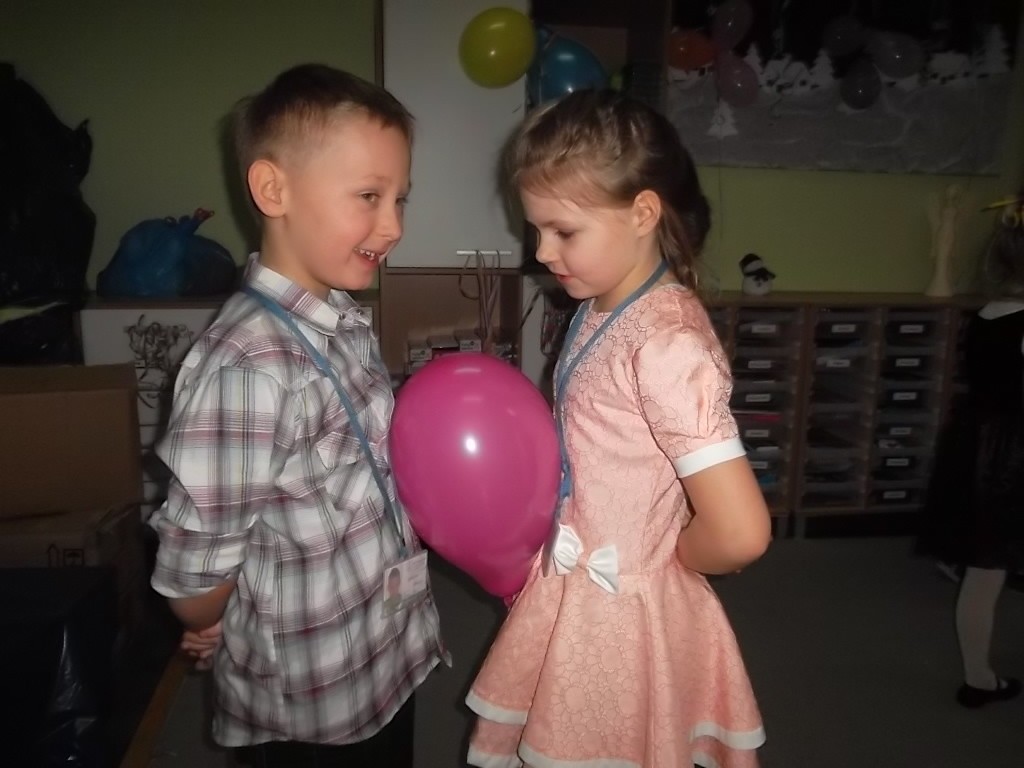Pięć pierwszych miesięcy uczęszczania do szkoły obfitowało w wiele nowych wyzwań, wzajemne poznawanie się, integrację oraz naukę. Wszyscy uczniowie świetnie poradzili sobie z tymi zadaniami, dlatego wychowawczyni pani Aleksandra Nadworska wspólnie z rodzicami przygotowała dla pierwszoklasistów bal z konkursami, tańcami i poczęstunkiem. Podczas wspólnej zabawy dzieci wzięły udział w kilku konkurencjach m.in. tańcu w parach na gazetach, tańcu z balonem, gorących krzesłach, parzącej piłce oraz w różnych grach integracyjnych. Nie obyło się bez pokazu indywidualnych umiejętności tanecznych. W chwilach odpoczynku uczniowie mogli zjeść pyszne ciasto, babeczki oraz inne łakocie przygotowane przez mamy. Na koniec balu wszyscy otrzymali drobne upominki. To był ostatni dzień przed feriami.