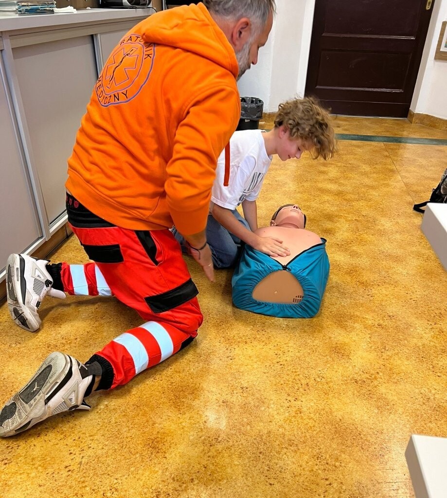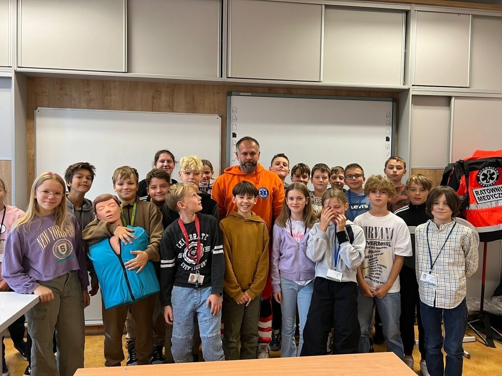 Nigdy nie za dużo lekcji poświęconych ratownictwu medycznemu. Pan Mateusz Nowatkowski - ratownik medyczny - jako wolontariusz spotkał się z uczniami klasy Va, by przypomnieć zasady udzielania pierwszej pomocy. Uczniowie mieli okazję przypomnieć sobie jak zachowujemy się przy złamaniu ręki, krwawieniu z nosa czy zakrztuszeniu. Przyniesiony na zajęcia fantom pozwolił na przeszkolenie z przeprowadzania resuscytacji krążeniowo-oddechowej. Wszyscy stwierdziliśmy, że praca ratownika jest bardzo trudna i wymaga siły fizycznej.