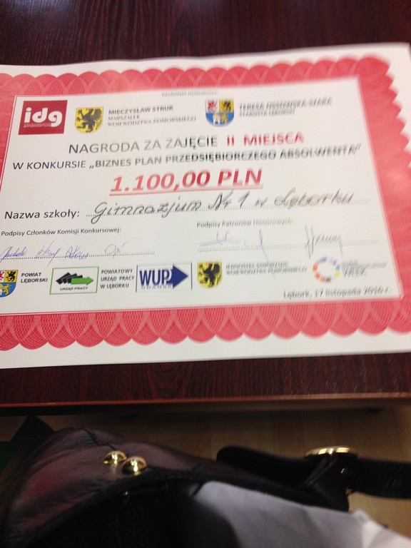 Ponadto , uczennice naszego gimnazjum: Klaudia Zbrożek, Aleksandra Jankowska, Zuzanna Milewczyk, Zuzanna Maciejewska i Karolina Byczuk reprezentowały naszą szkołę w konkursie: „Biznes Plan Przedsiębiorczego Absolwenta”. Dziewczęta zaprezentowały ciekawy pomysł utworzenia szkoły tańców angielskich w której nauka tańca połączona została z nauką języka angielskiego. Uczennice jako jedyne reprezentantki lęborskich gimnazjów rywalizowały z przedstawicielami LO nr 1, ZSM-I, PCE-ZSP, ZSGŻiA.