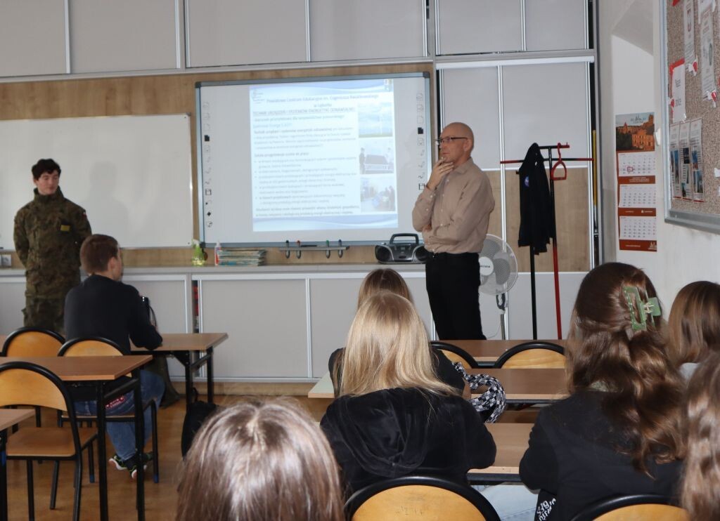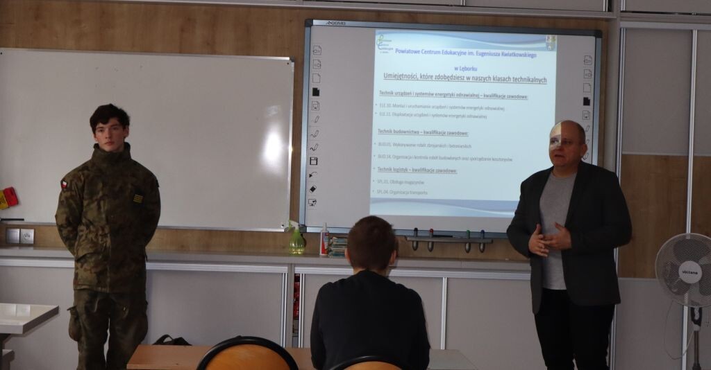 We wtorek, 19 listopada br., ósmoklasiści uczestniczyli w spotkaniu z przedstawicielami jednej ze szkół ponadpodstawowych w Lęborku. Panowie: Sławomir Hryczak i Zbigniew Kotłowski z Powiatowego Centrum Edukacyjnego zaprezentowali naszym uczniom kierunki kształcenia dla młodzieży w roku szkolnym 2025/2026. PCE oferuje atrakcyjne kierunki kształcenia pod patronatem lęborskich firm i zakładów pracy. Ósmoklasiści zostali zapoznani z wymaganiami stawianymi w procesie rekrutacji oraz umiejętnościami, które zdobędą w procesie nauki w szkole średniej. Była to cenna lekcja, ponieważ już za parę miesięcy uczniowie będą musieli podjąć pierwsze decyzje dotyczące wyboru dalszej edukacji.