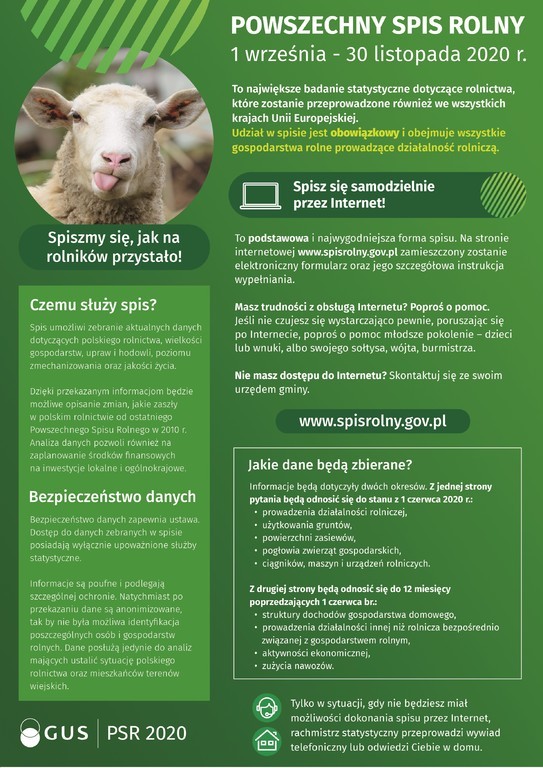 Powszechny Spis Rolny 2020 to największe badanie statystyczne dotyczące rolnictwa, które zostanie przeprowadzone we wszystkich krajach Unii Europejskiej. Do jego wykonania zobowiązuje nas Komisja Europejska. W Polsce będzie miał miejsce od 1 września do 30 listopada. Udział w spisie jest obowiązkowy i obejmuje wszystkie gospodarstwa rolne prowadzące działalność rolniczą.