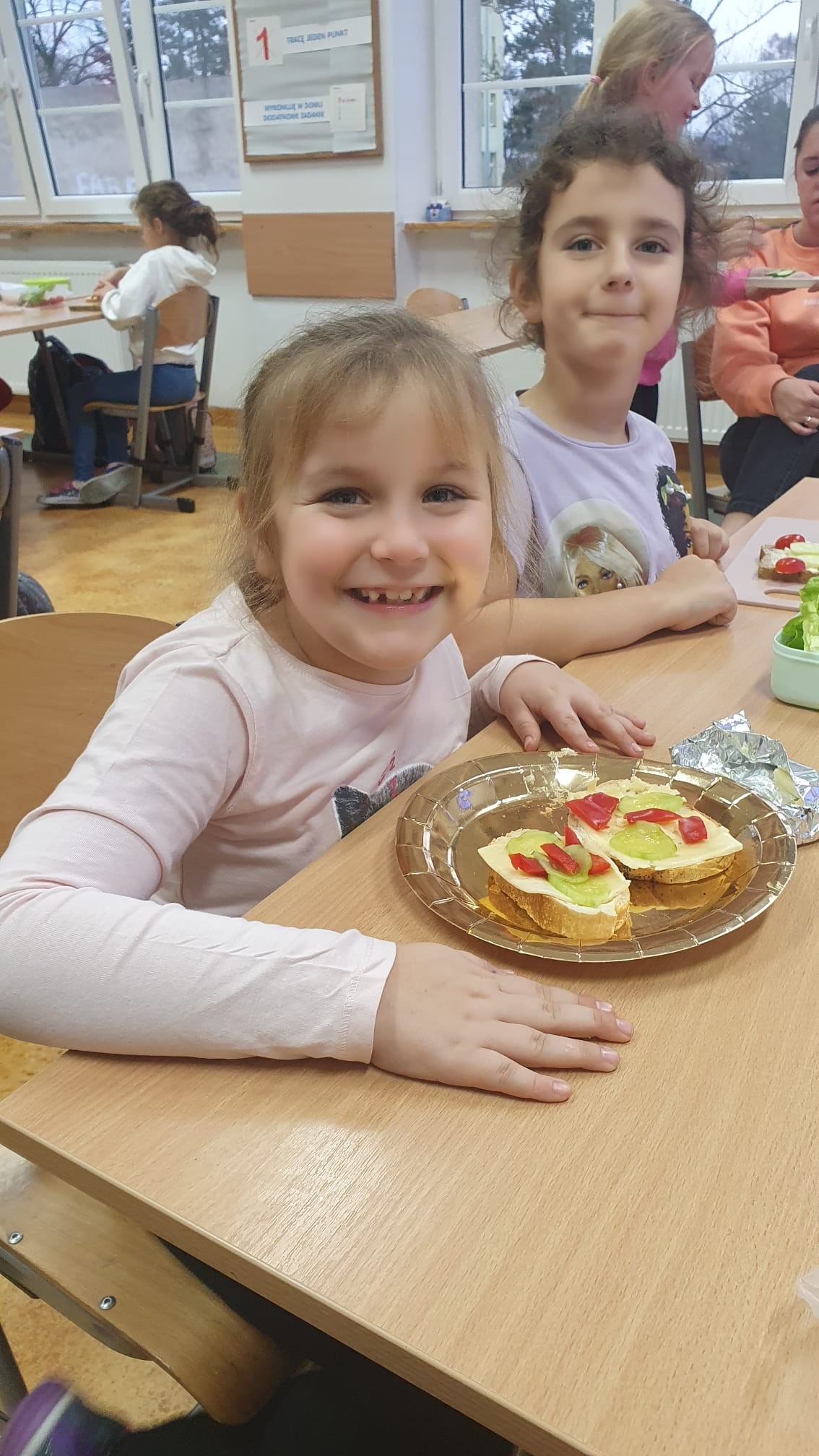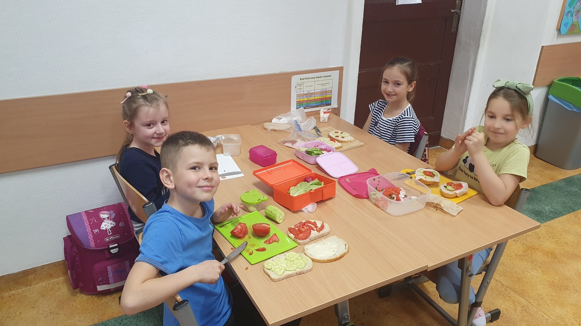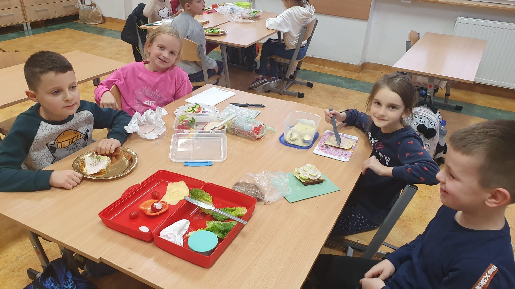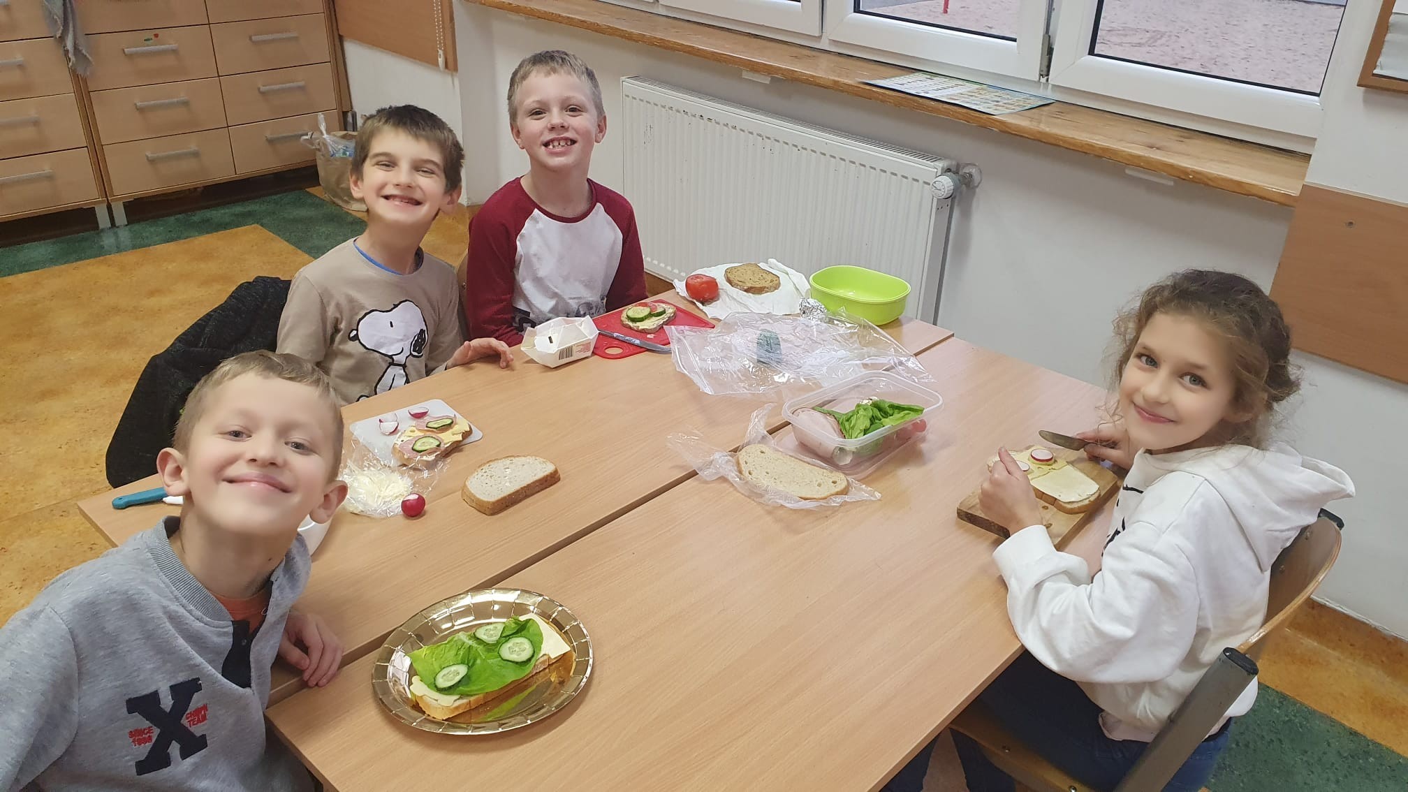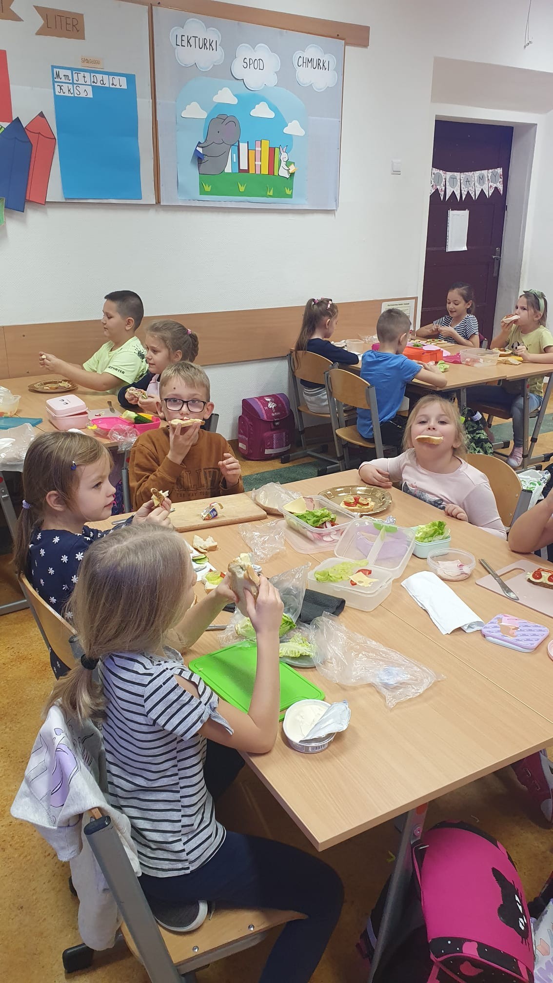 19 listopada uczniowie klasy Ia wzięli udział w śniadaniowych warsztatach kulinarnych. Dzieci przez cały tydzień poznawały korzyści wynikające ze spożywania drugiego śniadania, dowiedziały się, jak ważna jest zbilansowana dieta, bogata w produkty zbożowe i 5 porcji warzyw, owoców i soków. Po wskazówkach o higienie oraz bezpieczeństwie posługiwania się nożem, uczniowie zabrali się do pracy. Dzieci samodzielnie smarowały pieczywo masłem i układały na nim wybrane przez siebie produkty. Następnie odbyła się degustacja kanapek, a zadowolone miny potwierdziły, że najlepiej smakują kanapki zrobione własnoręcznie. Dzięki takim zajęciom dzieci kształciły w sobie odpowiednie nawyki żywieniowe, rozwijały kreatywność, wyobraźnię oraz dbałość o higienę podczas spożywania posiłków.