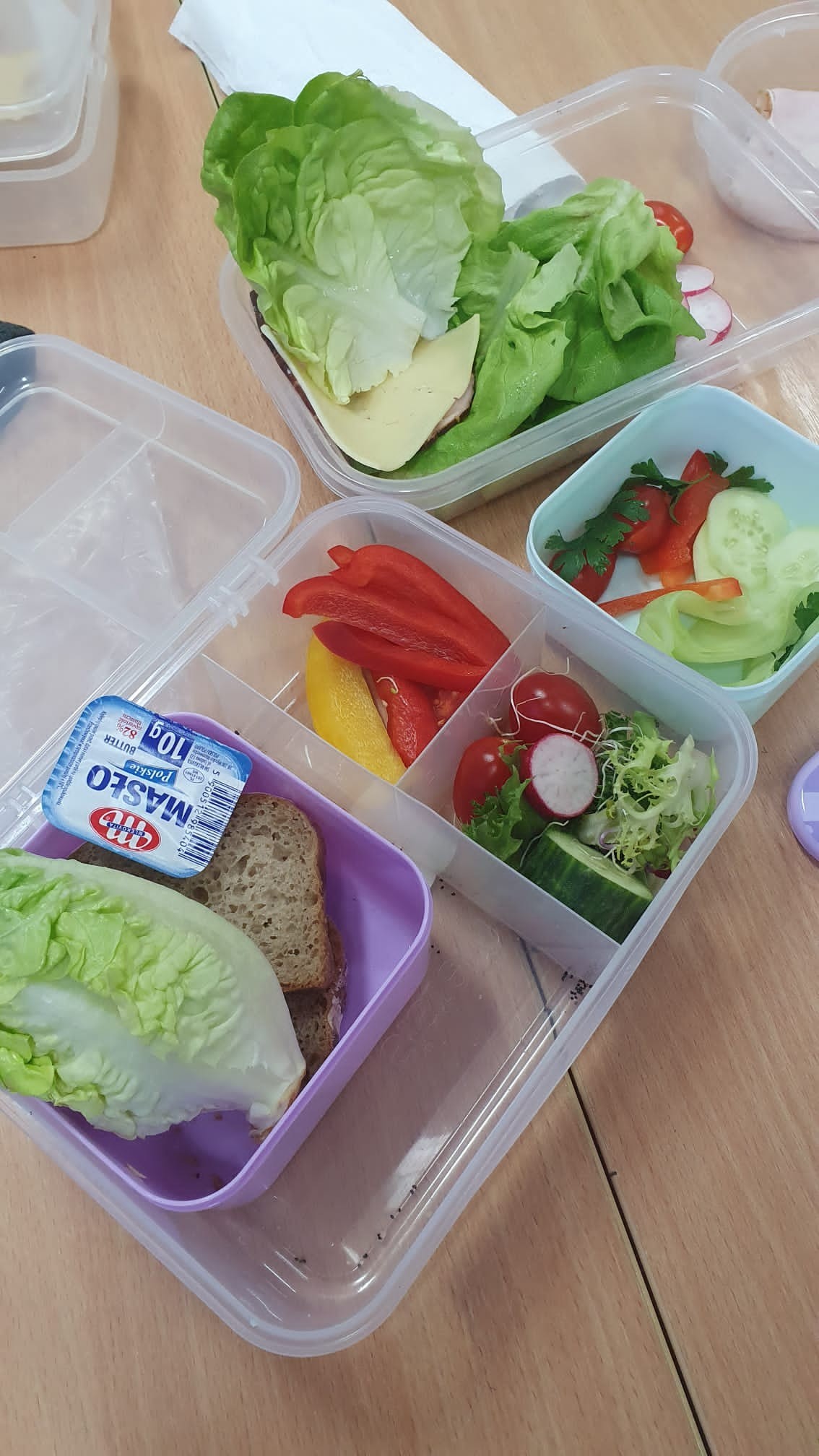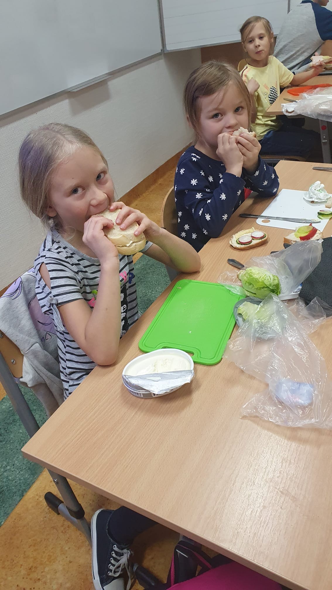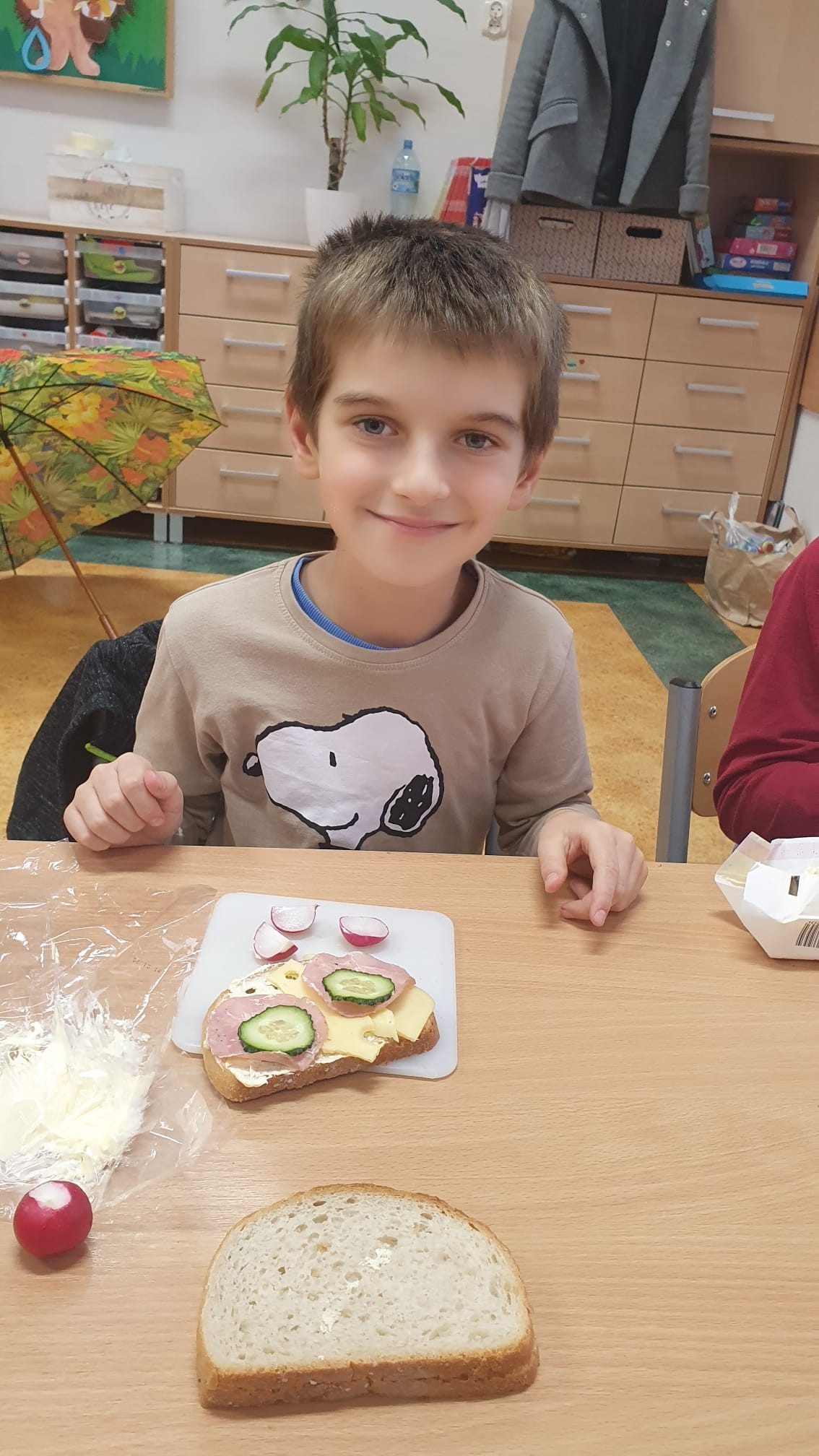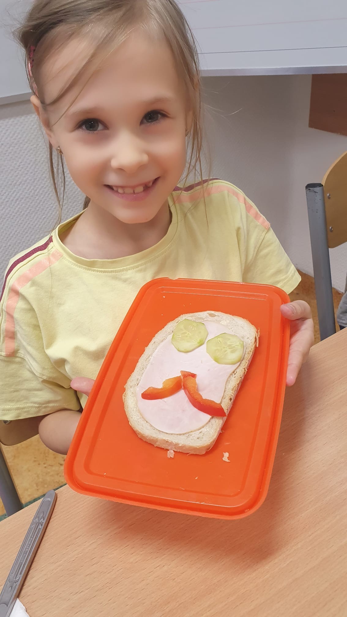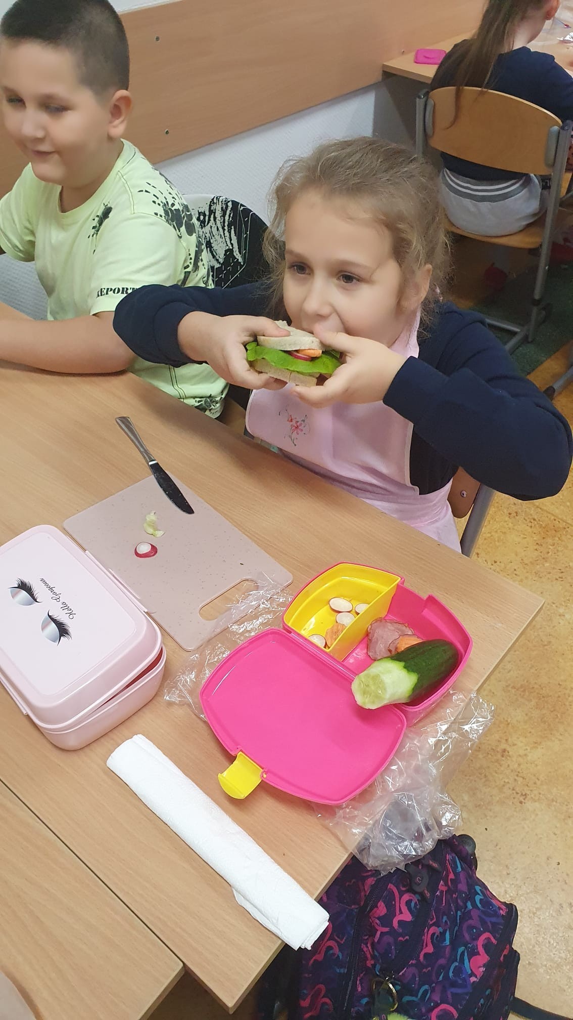 19 listopada uczniowie klasy Ia wzięli udział w śniadaniowych warsztatach kulinarnych. Dzieci przez cały tydzień poznawały korzyści wynikające ze spożywania drugiego śniadania, dowiedziały się, jak ważna jest zbilansowana dieta, bogata w produkty zbożowe i 5 porcji warzyw, owoców i soków. Po wskazówkach o higienie oraz bezpieczeństwie posługiwania się nożem, uczniowie zabrali się do pracy. Dzieci samodzielnie smarowały pieczywo masłem i układały na nim wybrane przez siebie produkty. Następnie odbyła się degustacja kanapek, a zadowolone miny potwierdziły, że najlepiej smakują kanapki zrobione własnoręcznie. Dzięki takim zajęciom dzieci kształciły w sobie odpowiednie nawyki żywieniowe, rozwijały kreatywność, wyobraźnię oraz dbałość o higienę podczas spożywania posiłków.