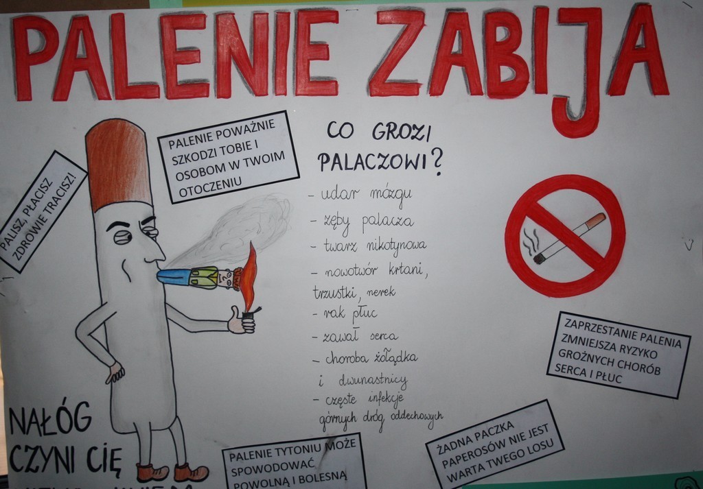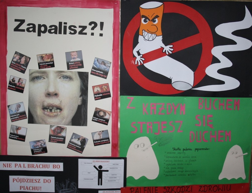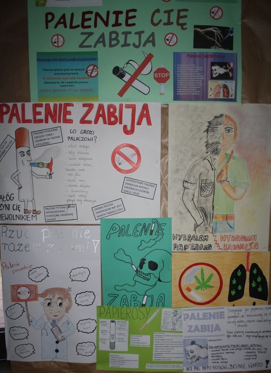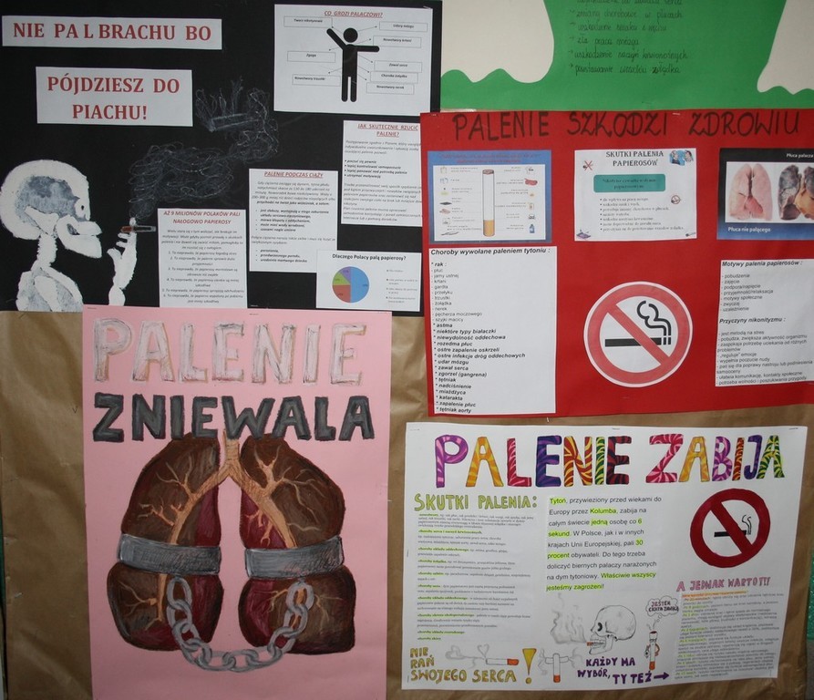 W ramach działań prozdrowotnych, na lekcjach biologii uczniowie omawiali zagadnienie palenia tytoniu, oglądali prezentacje multimedialne a następnie wykonali prace plastycznie.