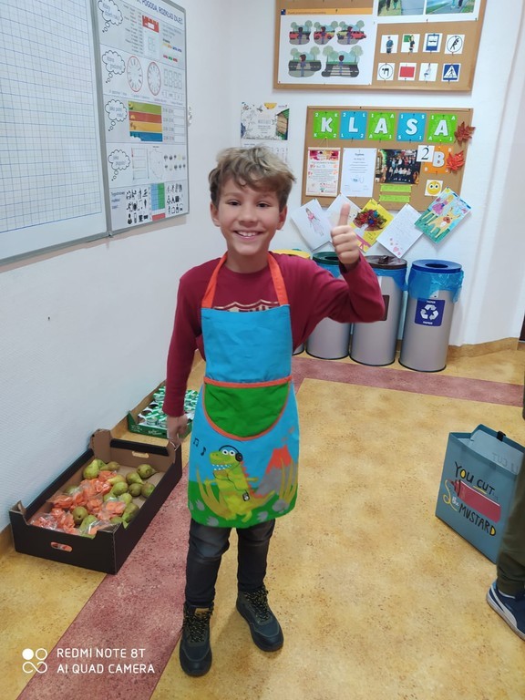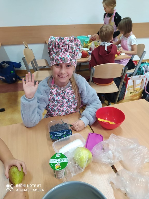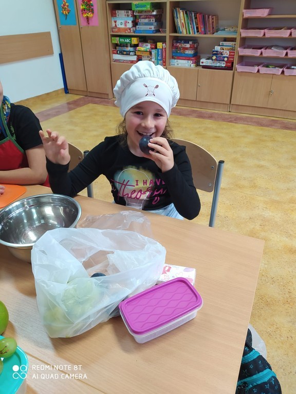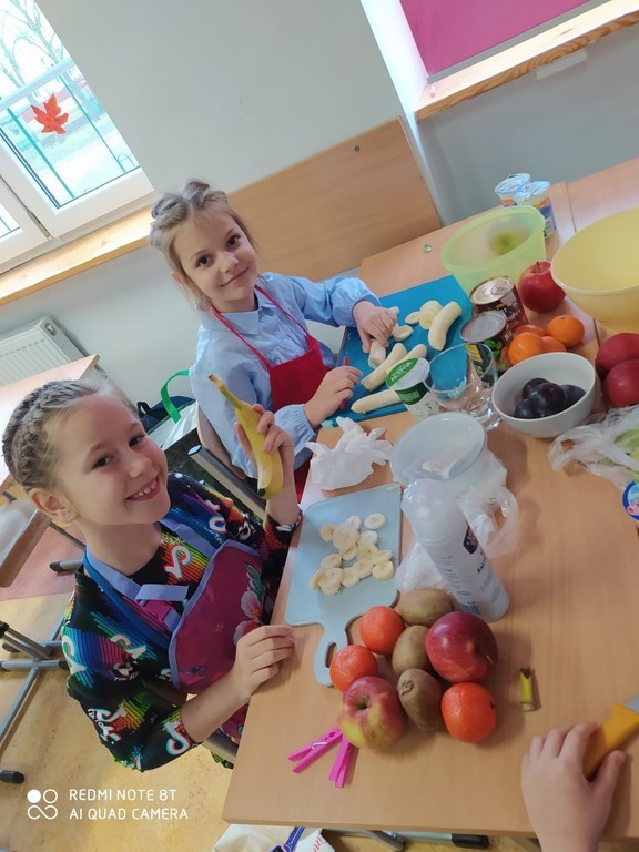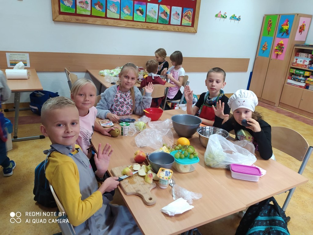 Jednym z zagadnień omawianych ne lekcjach przyrody w klasie drugiej jest temat dotyczący zdrowego odżywiania. Uczniowie klasy 2b doskonale wiedzą , jakie produkty dostarczają im energii, jakie witamin, a jakie pozwalają na budowanie mocnych kości i zdrowych zębów. Zdobytą wiedzę wykorzystali w praktyce i w ramach działań prozdrowotnych, pod okiem wychowawcy, zorganizowali sałatkową lekcję przyrody. Przygotowali w grupach pyszne sałatki owocowe, wymieniali się przepisami i zachęcali do nowych , kulinarnych eksperymentów. Zdaniem dzieci, była to ,,najsmaczniejsza lekcja przyrody " w klasie 2b.
