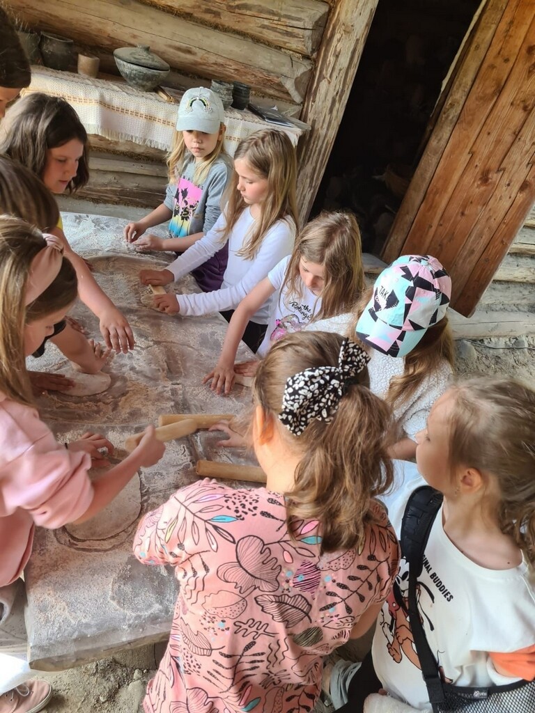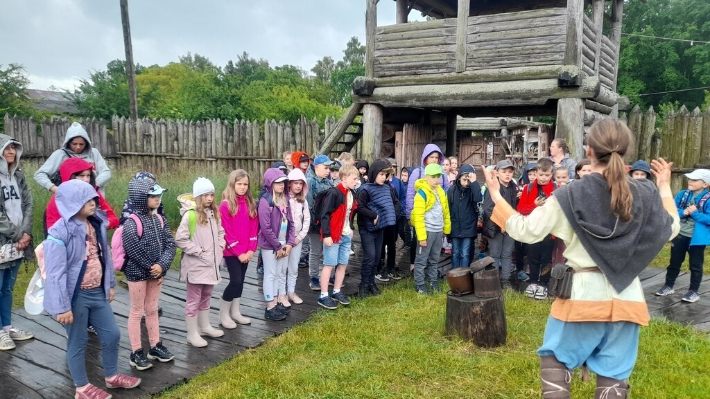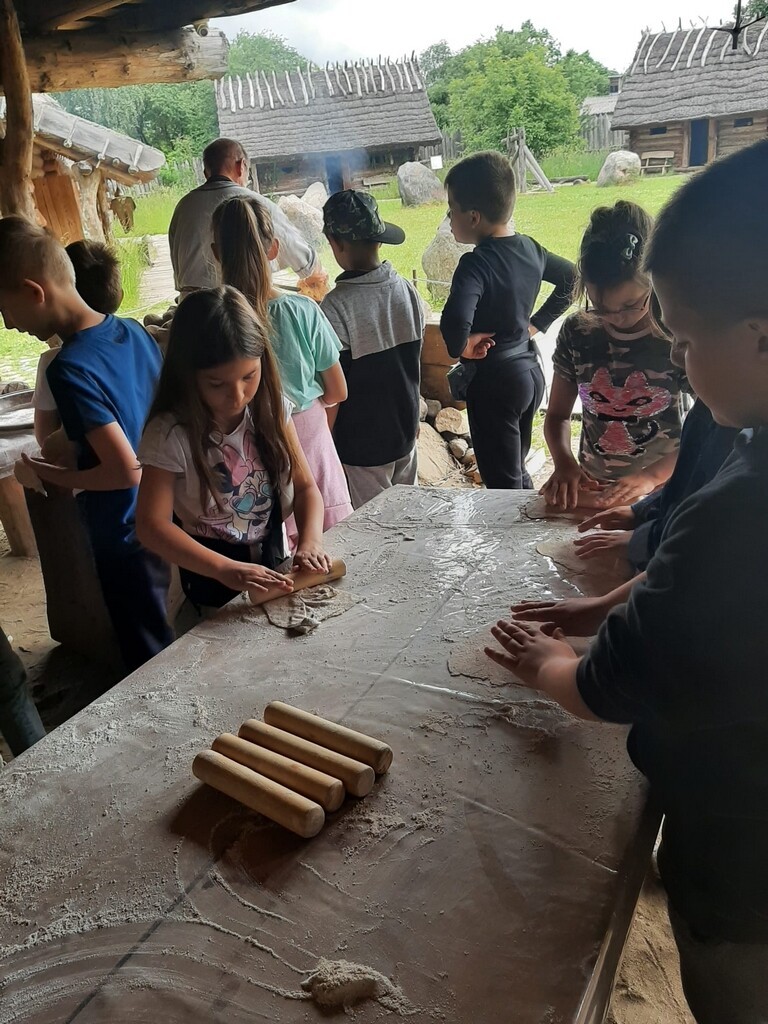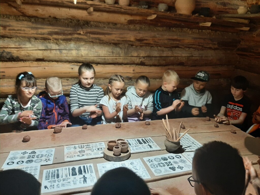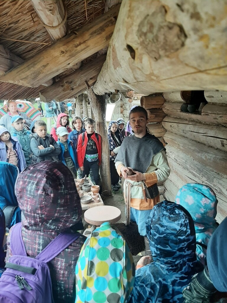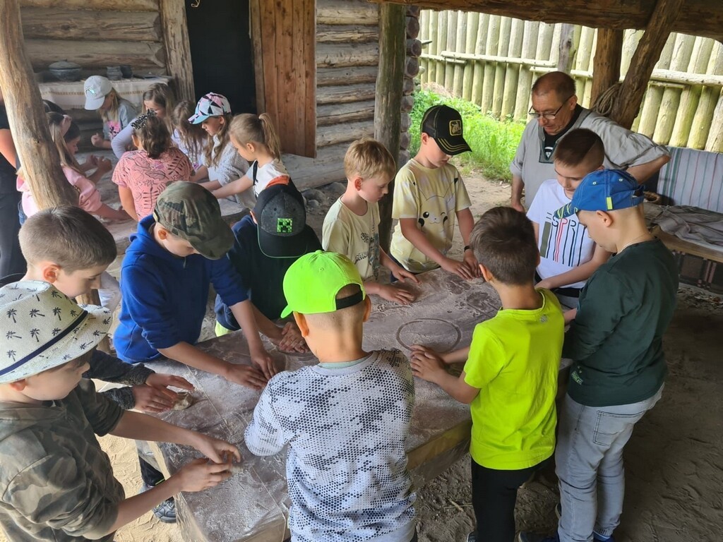 Podczas żywej lekcji historii uczniowie wzięli udział w warsztatach piekarskich. W czasie trwania zajęć piekli podpłomyki. Przenosząc się do kolejnej chaty stali się garncarzami i własnoręcznie wykonali naczynia z gliny. Niestety pogoda popsuła plany drugoklasistów związane z poznaniem dawnych gier i zabaw średniowiecznych. W zamian za to dzieci wzięły udział w warsztacie filcowania. Podczas pobytu w osadzie można było pogłębić swoją wiedzę z zakresu zawodów i zwyczajów dawnych ludów słowiańskich.
