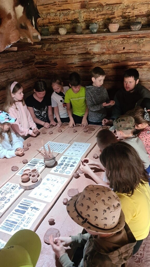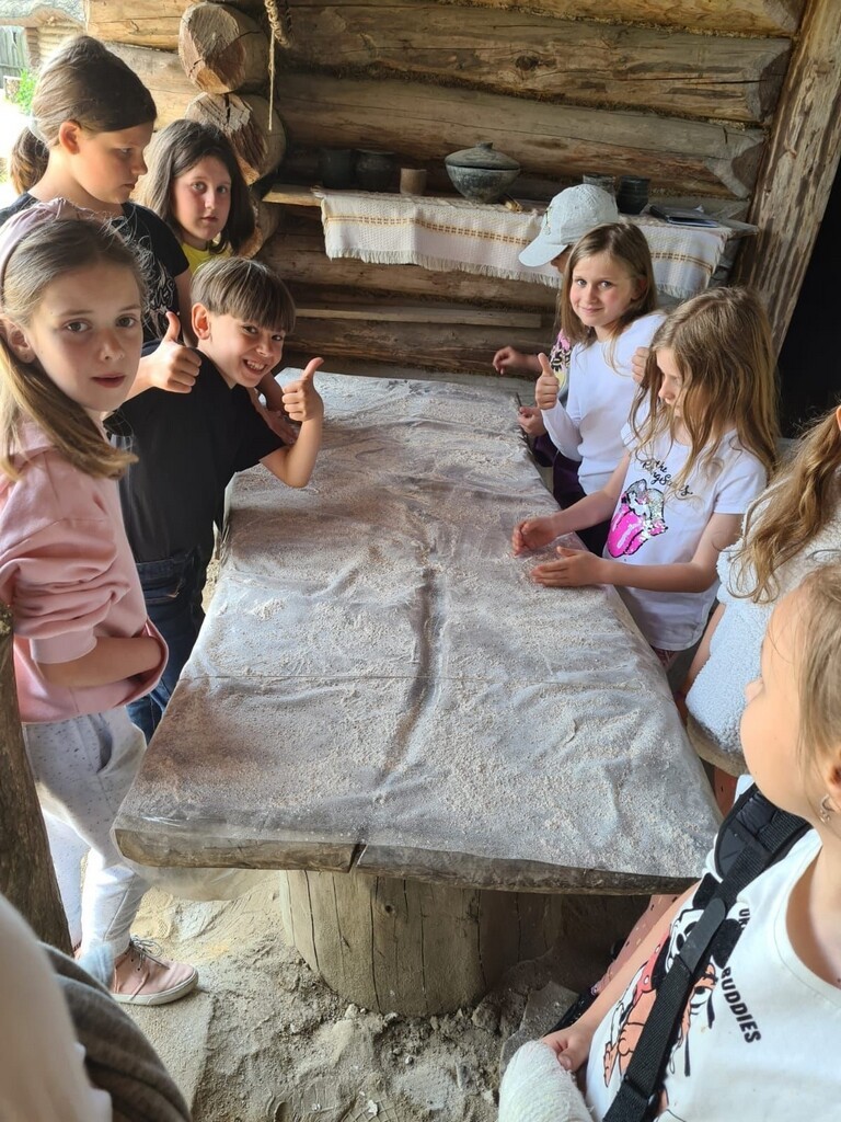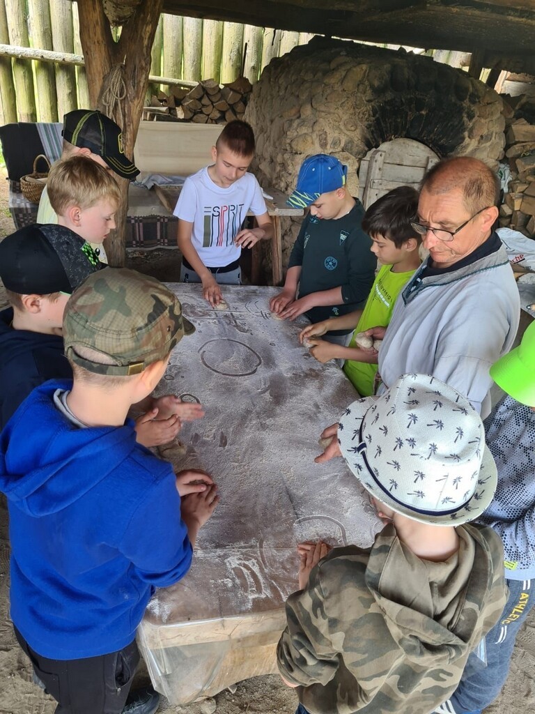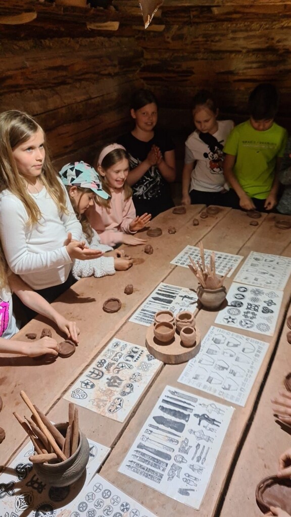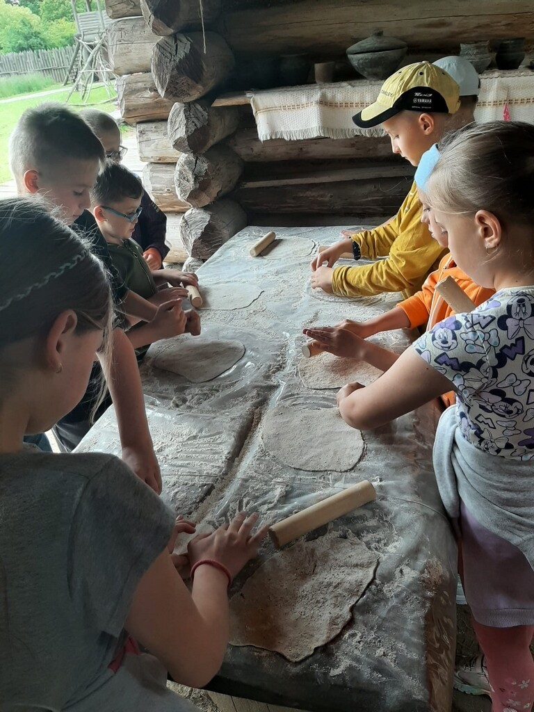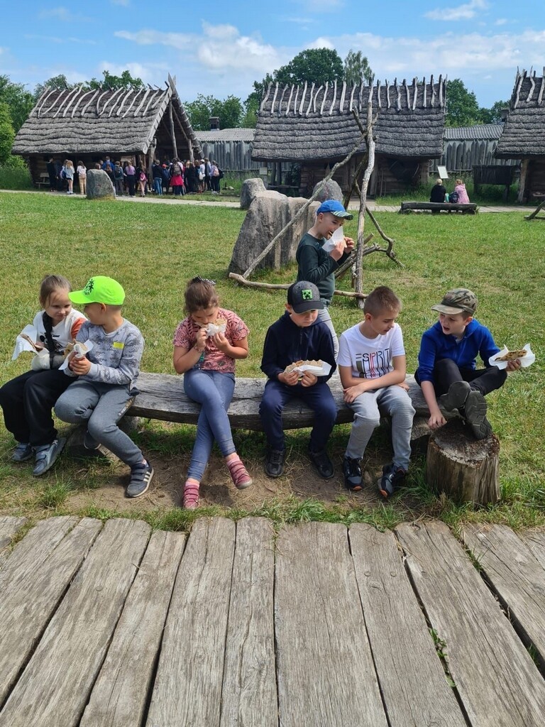 Podczas żywej lekcji historii uczniowie wzięli udział w warsztatach piekarskich. W czasie trwania zajęć piekli podpłomyki. Przenosząc się do kolejnej chaty stali się garncarzami i własnoręcznie wykonali naczynia z gliny. Niestety pogoda popsuła plany drugoklasistów związane z poznaniem dawnych gier i zabaw średniowiecznych. W zamian za to dzieci wzięły udział w warsztacie filcowania. Podczas pobytu w osadzie można było pogłębić swoją wiedzę z zakresu zawodów i zwyczajów dawnych ludów słowiańskich.