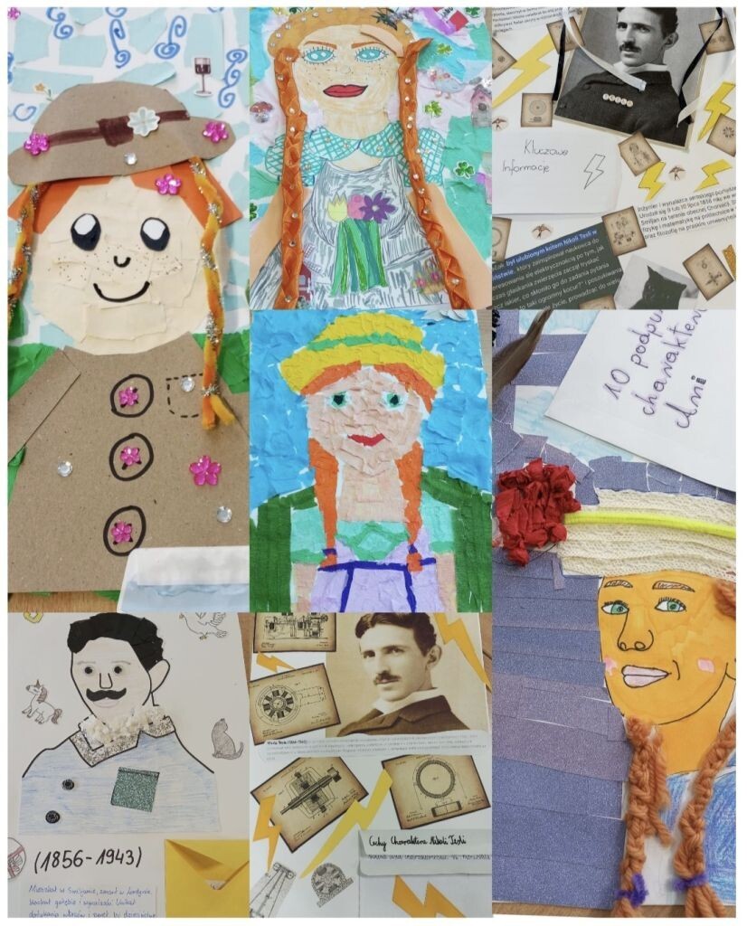 Uczniowie kl. 6b i 6c pod kierunkiem nauczyciela języka polskiego – pani Aleksandry Dudojć – charakteryzowali bohaterów omawianych lektur ( Anię Shirley i Nikolę Teslę) metodą collage. To twórcza technika wizualna polegająca na naklejaniu na papierze wycinków z gazet, fotografii, tkanin i cytatów, które odzwierciedlają wygląd, emocje, cechy i otoczenie postaci. Jest świetnym sposobem na zaprezentowanie wiadomości o interesującym nas bohaterze i rozwijanie wyobraźni. Uczniowie puścili wodze fantazji i w efekcie powstały piękne prace, których zdjęcia zamieszczamy poniżej. Czy chcielibyście na lekcjach języka polskiego charakteryzować bohaterów w równie artystyczny sposób?