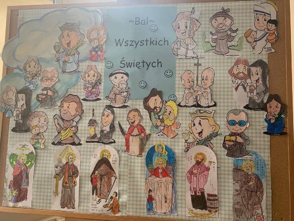 Listopad jest czasem zadumy i refleksji nad przemijaniem. Wspominamy w tym czasie tych, którzy odeszli, a w naszych sercach pozostawili cząstkę siebie. W ostatnich dniach października uczniowie klas 1-3 wzięli udział w okolicznościowych katechezach dotyczących tematyki Uroczystości Wszystkich Świętych i Dni Zadusznych. Ze względu na trwającą pandemię nie mogliśmy zorganizować Balu Wszystkich Świętych. Postanowiliśmy jednak uczniom przybliżyć postacie świętych, do których możemy uciekać się w różnych życiowych sprawach i problemach dnia codziennego. Efektem tej pracy stała się mini wystawa ,,Bal wszystkich świętych”.