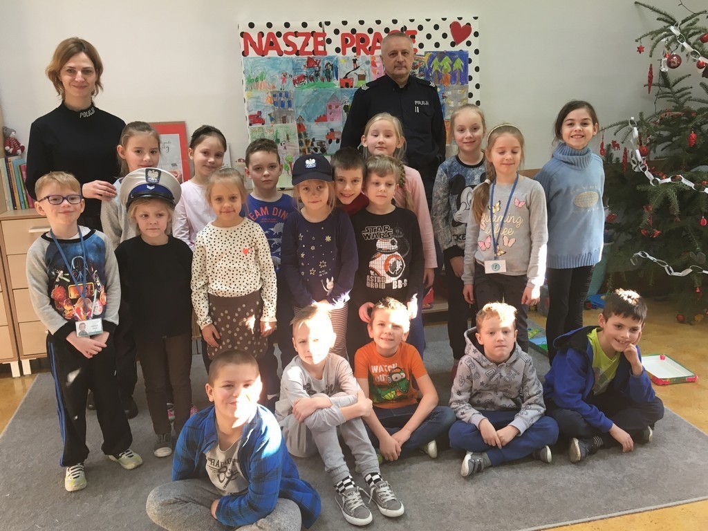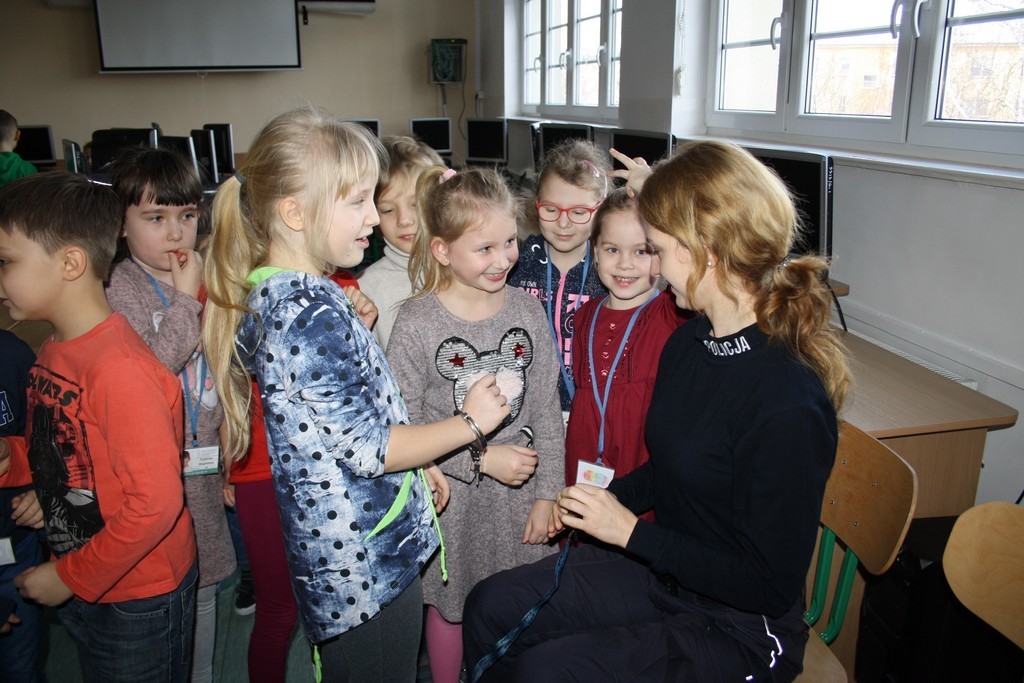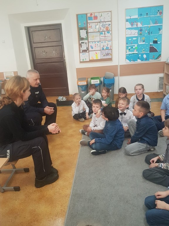 Z naszymi pierwszakami funkcjonariusze rozmawiali głównie na temat szeroko rozumianego bezpieczeństwa. Z maluchami omówiono zagrożenia jakie mogą wystąpić w czasie drogi do szkoły i powrotu do domu, przypomniano numery alarmowe i poinformowano o konieczności używania elementów odblaskowych. W czasie spotkania policjanci mówili również o tym, jak zachować się w przypadku kontaktu z nieznajomymi.