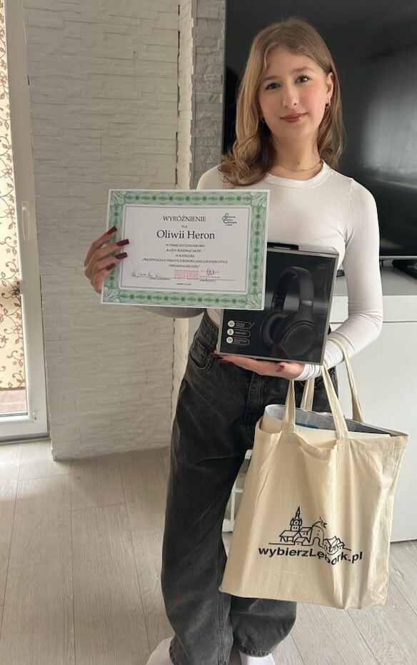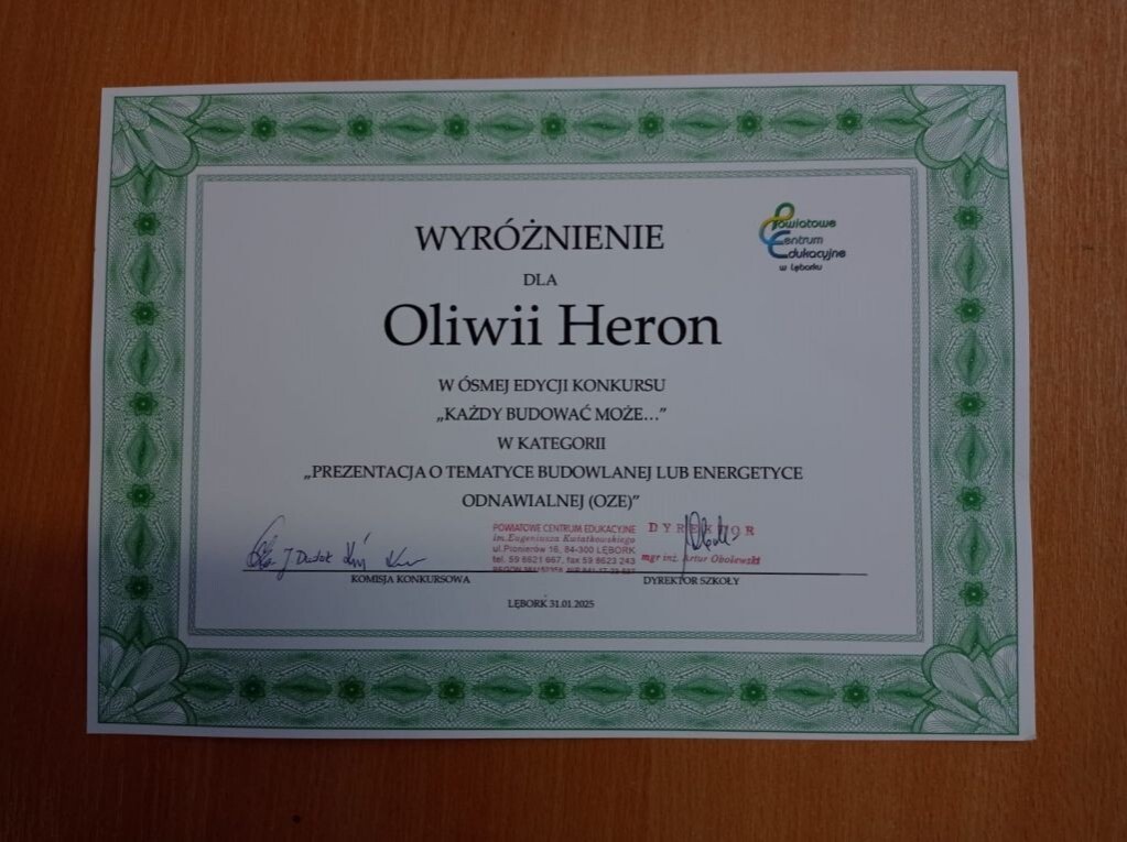 Miło nam zakomunikować, że konkurs zorganizowany przez Powiatowe Centrum Edukacyjne w Lęborku doczekał się rozstrzygnięcia. Został on skierowany do uczniów a jego celem było zainteresowanie młodzieży branżą budowlaną i energetyką odnawialną OZE. W piątek, 31 stycznia 2025 roku, w Powiatowym Centrum Edukacyjnym nagrodę za wyróżnienie w kategorii: „Prezentacja o tematyce budowlanej” otrzymała Oliwia Heron z klasy VIIIb .