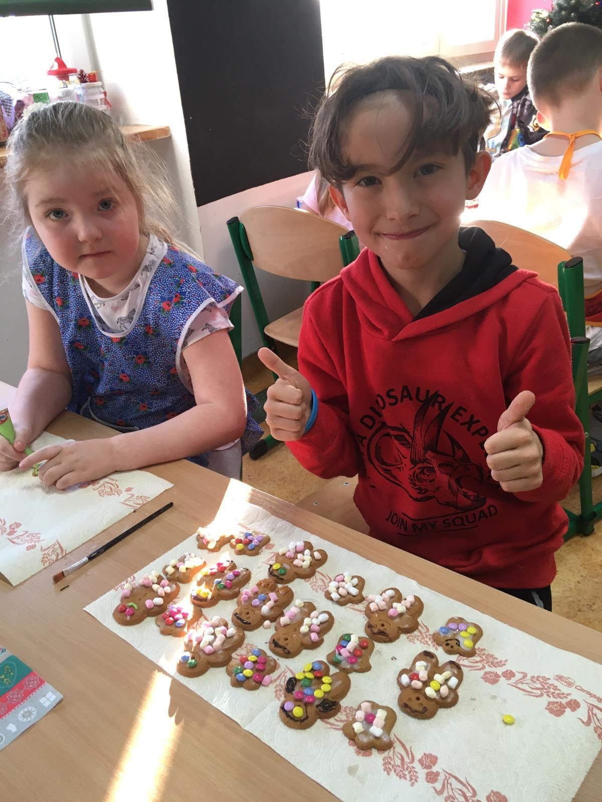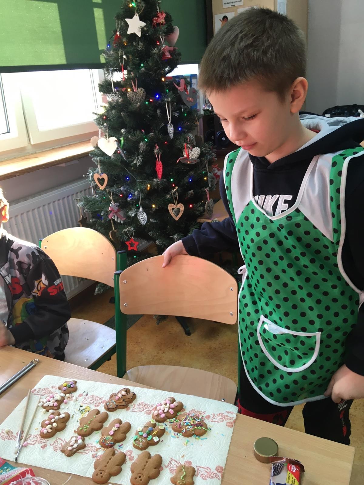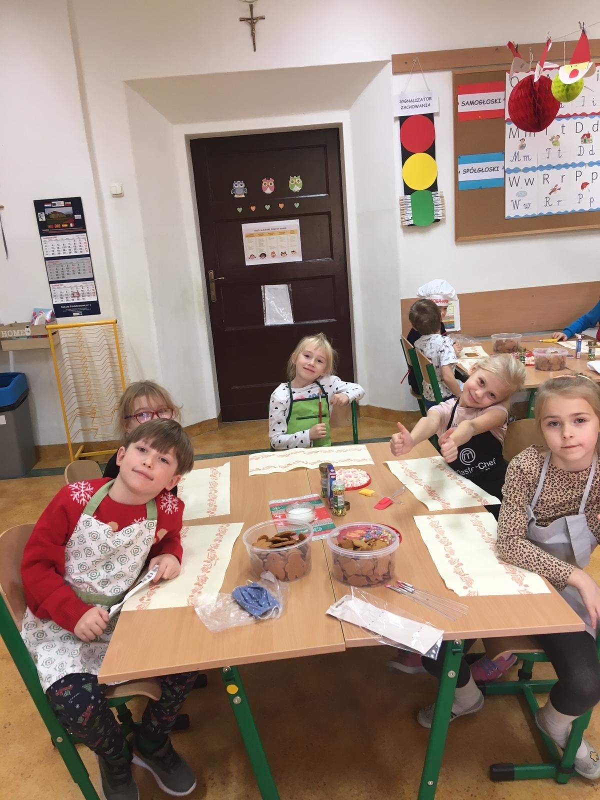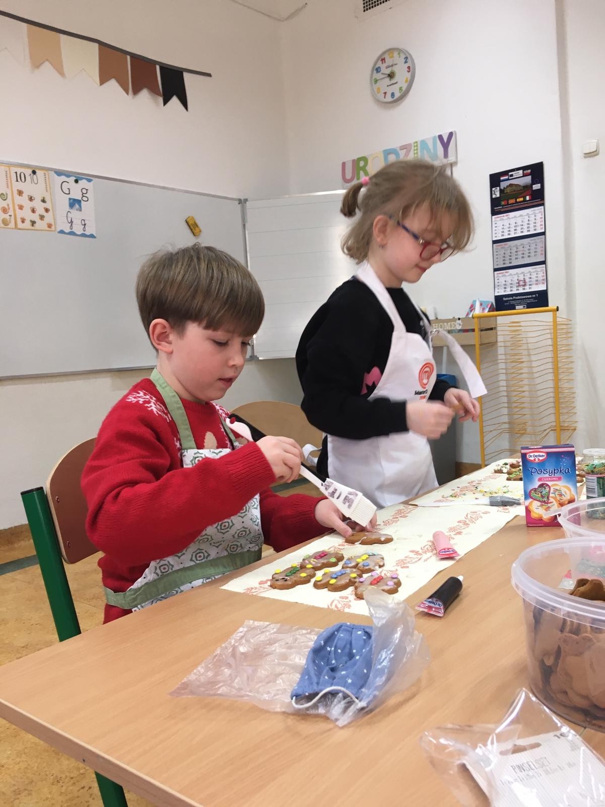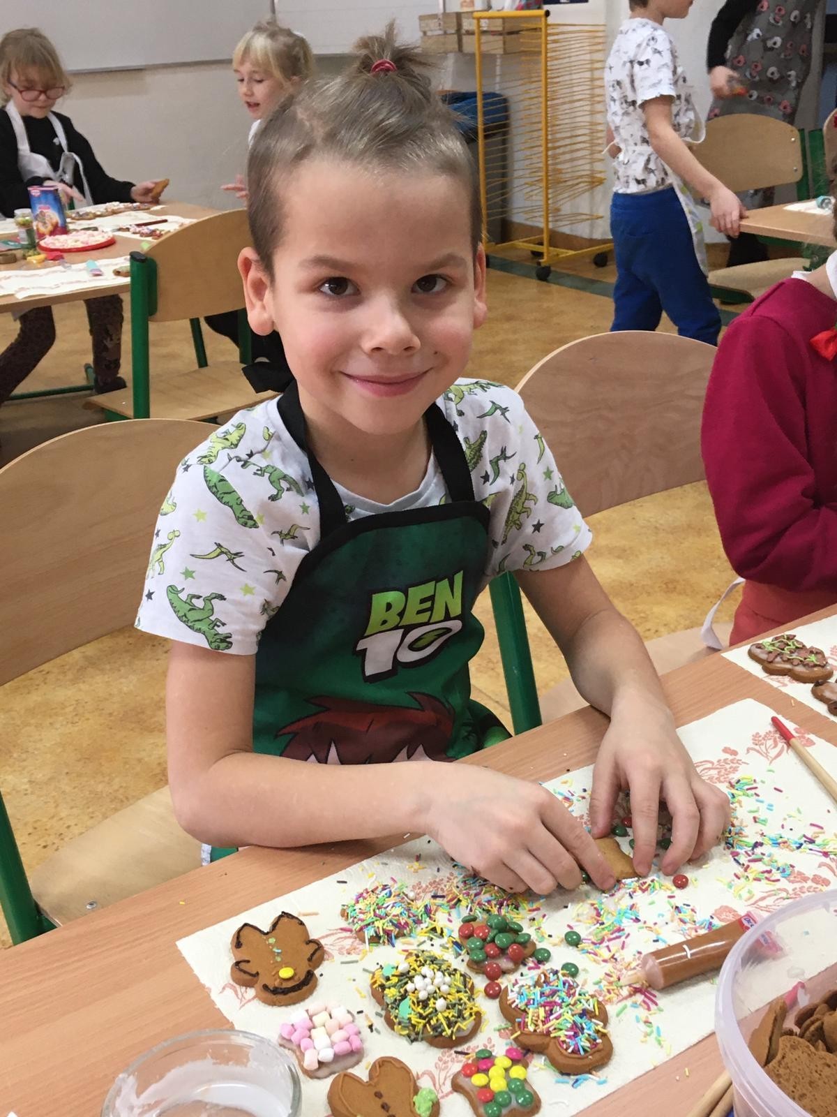 I tu niezawodna okazała się pani Ania, która wpadła na pomysł zorganizowania w klasie warsztatów piernikowych. W piątek, podczas lekcji, jej uczniowie mieli okazję wykazać się kreatywnością i zdolnościami plastycznymi w dekorowaniu świątecznych pierniczków. A było czym dekorować! Pani Ania zadbała o to, by przynieść niezbędne, słodkie ozdoby-posypki w różnych kolorach, żelki, pianki i inne cudeńka. Ozdabianie pierników sprawiło pierwszakom niesamowitą frajdę, uczniowie z brązowych ciasteczek stworzyli małe dzieła sztuki. Na zakończenie zajęć każdy mógł zabrać do domu swoje pierniczki w słoikach, specjalnie udekorowanych na tę okazję.