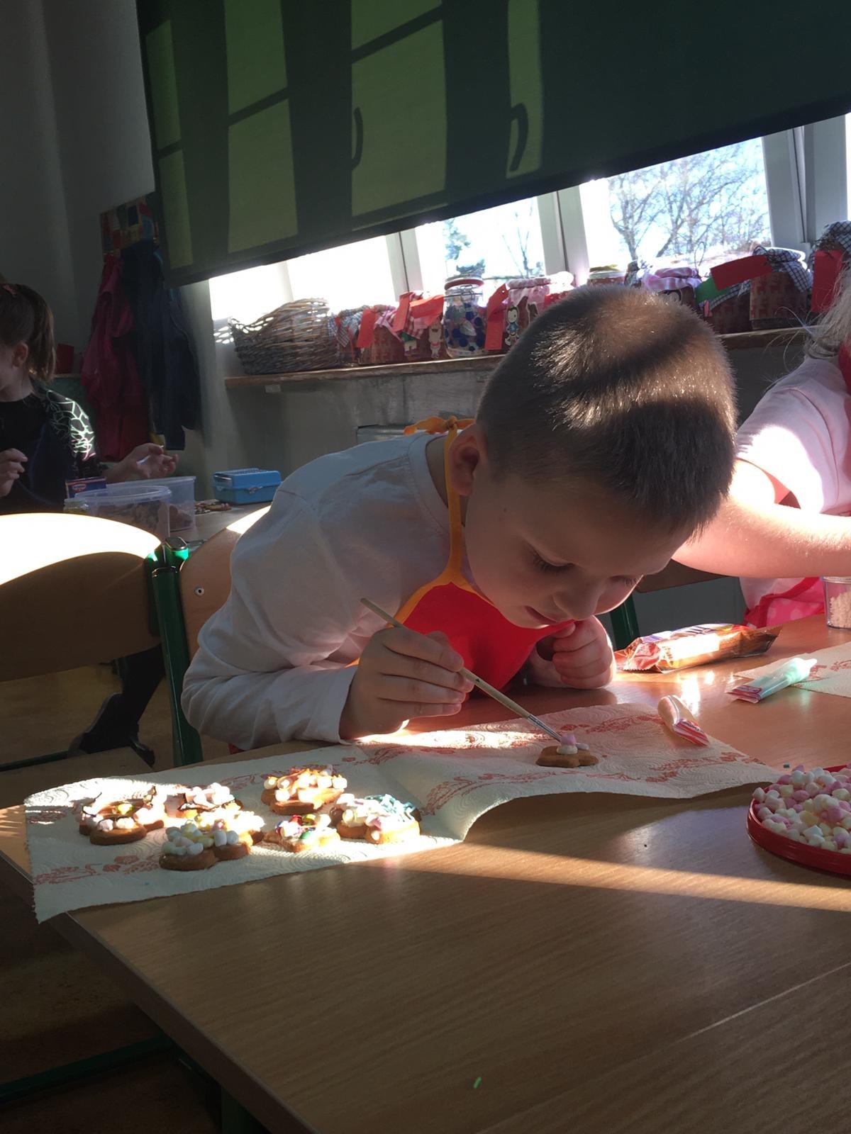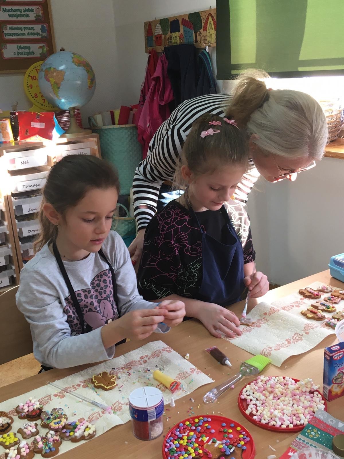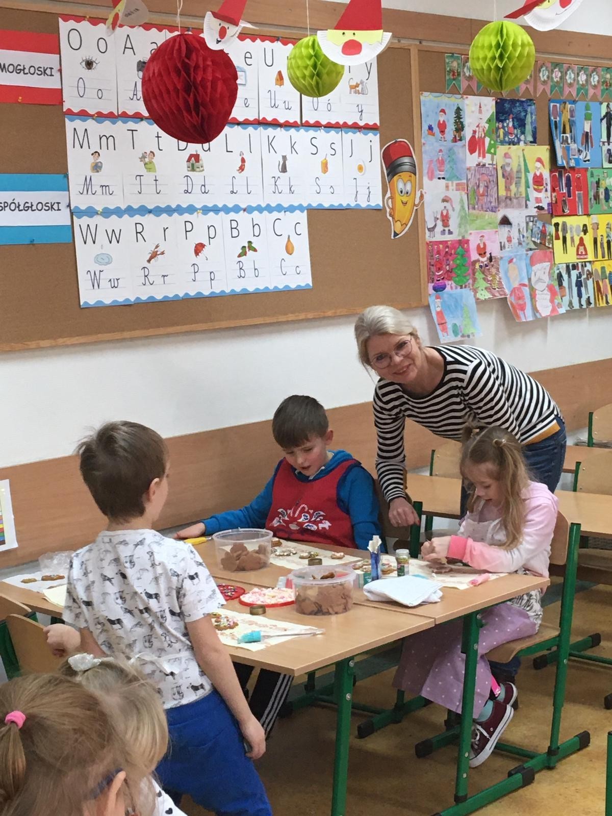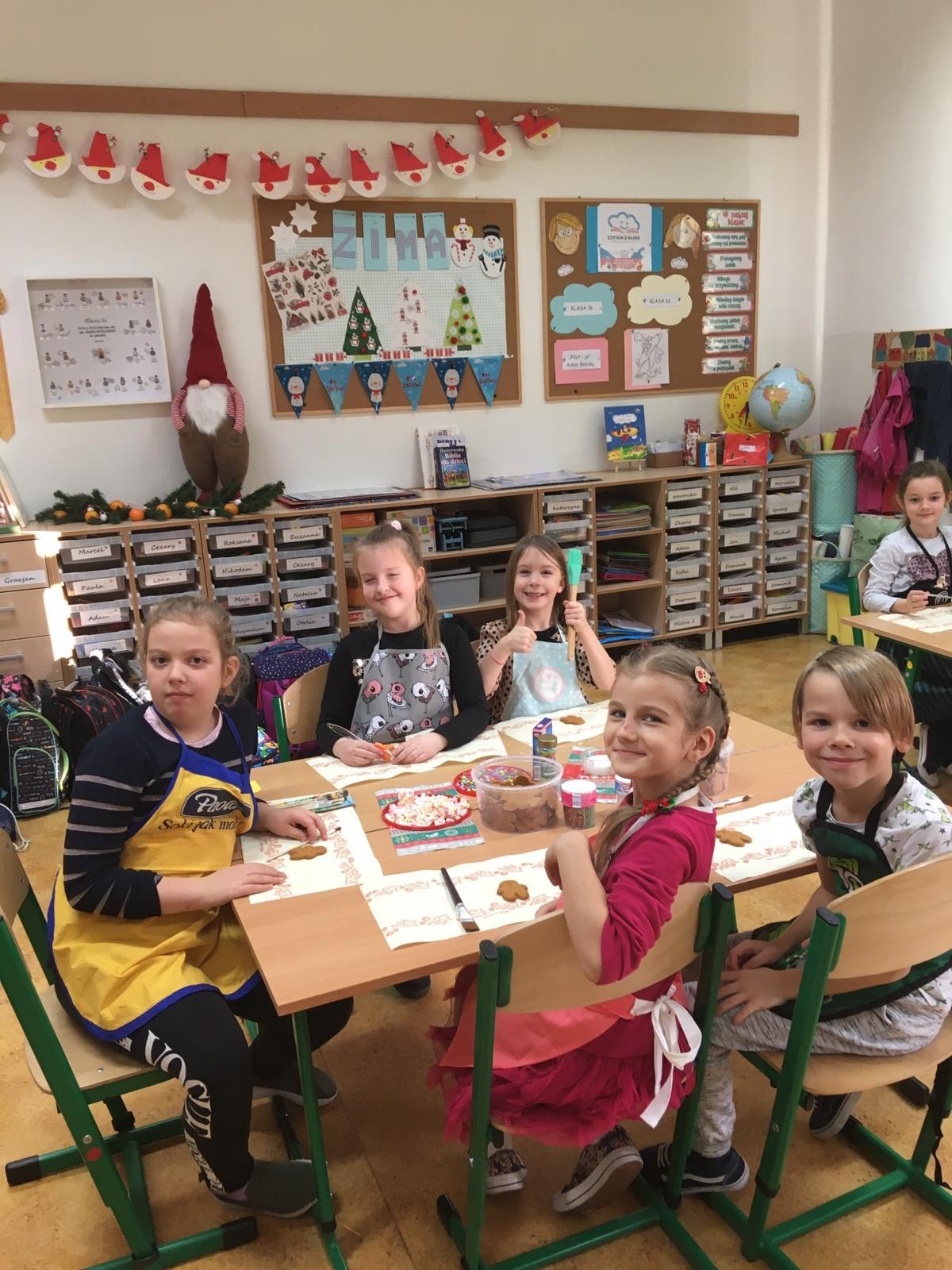 I tu niezawodna okazała się pani Ania, która wpadła na pomysł zorganizowania w klasie warsztatów piernikowych. W piątek, podczas lekcji, jej uczniowie mieli okazję wykazać się kreatywnością i zdolnościami plastycznymi w dekorowaniu świątecznych pierniczków. A było czym dekorować! Pani Ania zadbała o to, by przynieść niezbędne, słodkie ozdoby-posypki w różnych kolorach, żelki, pianki i inne cudeńka. Ozdabianie pierników sprawiło pierwszakom niesamowitą frajdę, uczniowie z brązowych ciasteczek stworzyli małe dzieła sztuki. Na zakończenie zajęć każdy mógł zabrać do domu swoje pierniczki w słoikach, specjalnie udekorowanych na tę okazję.