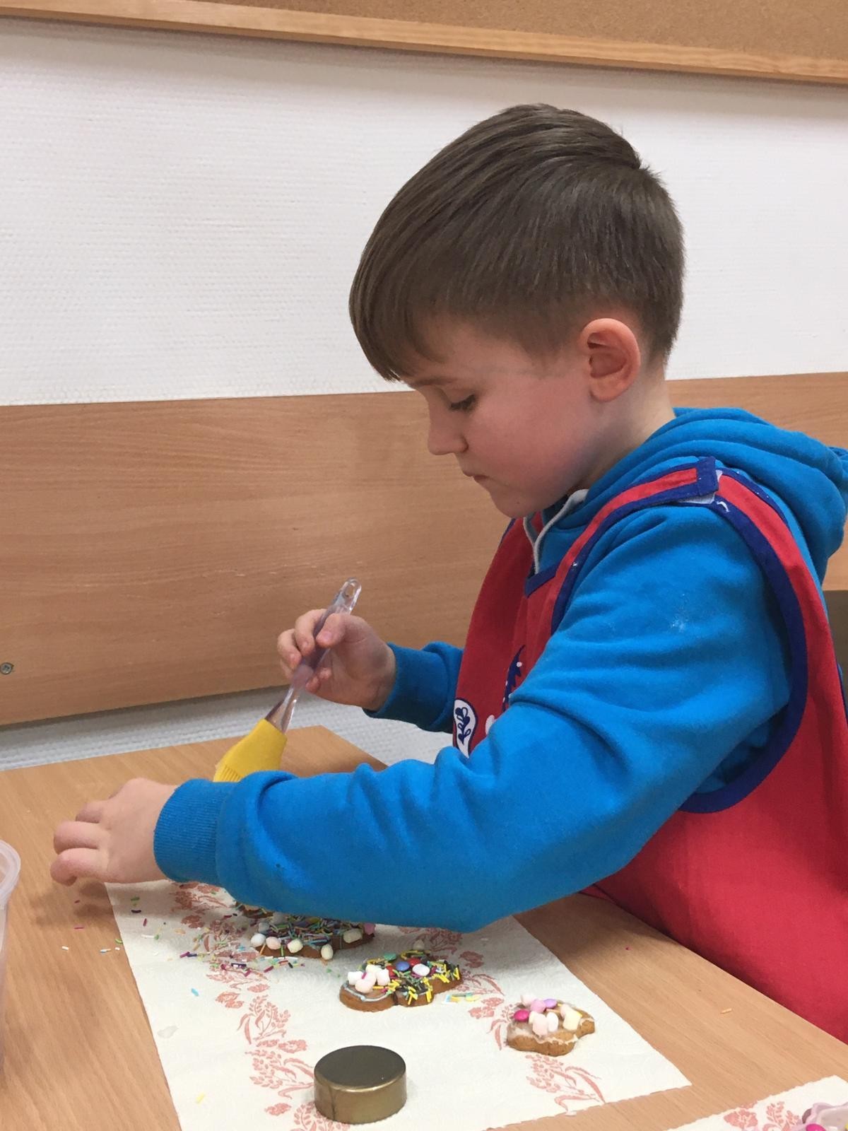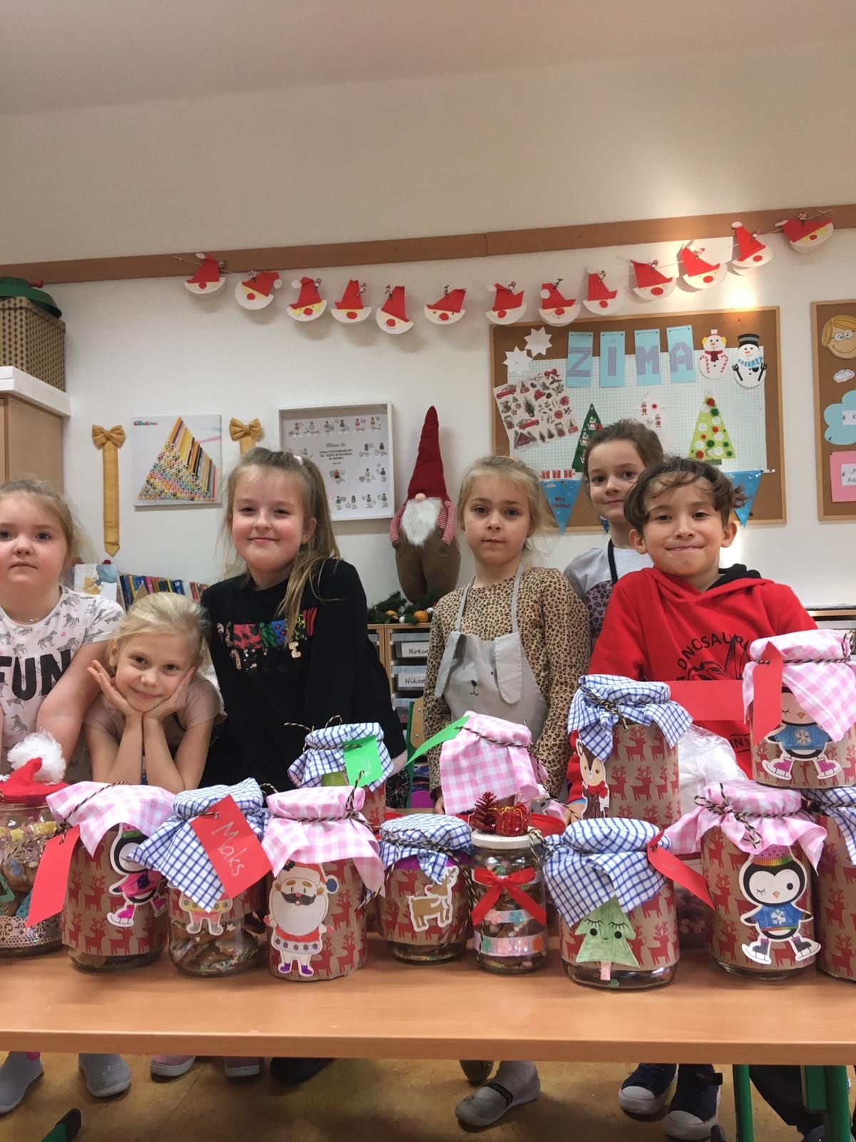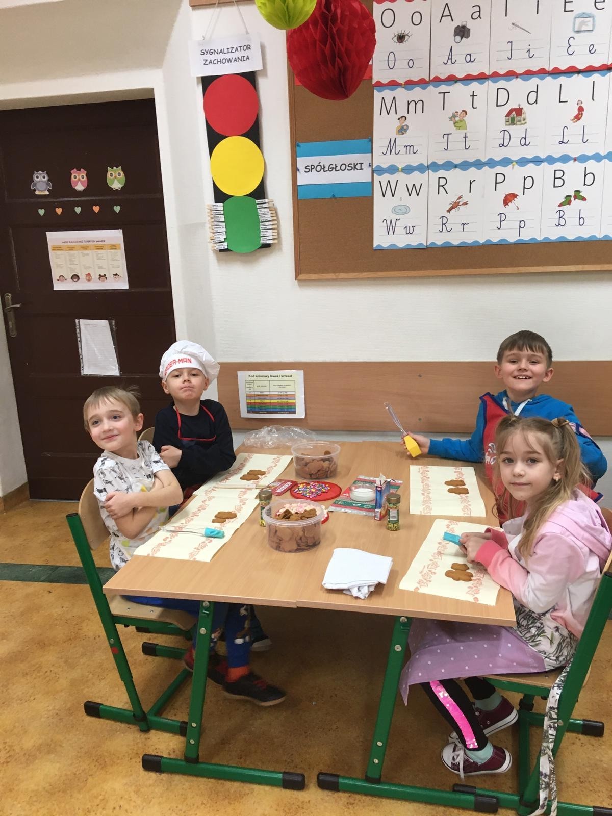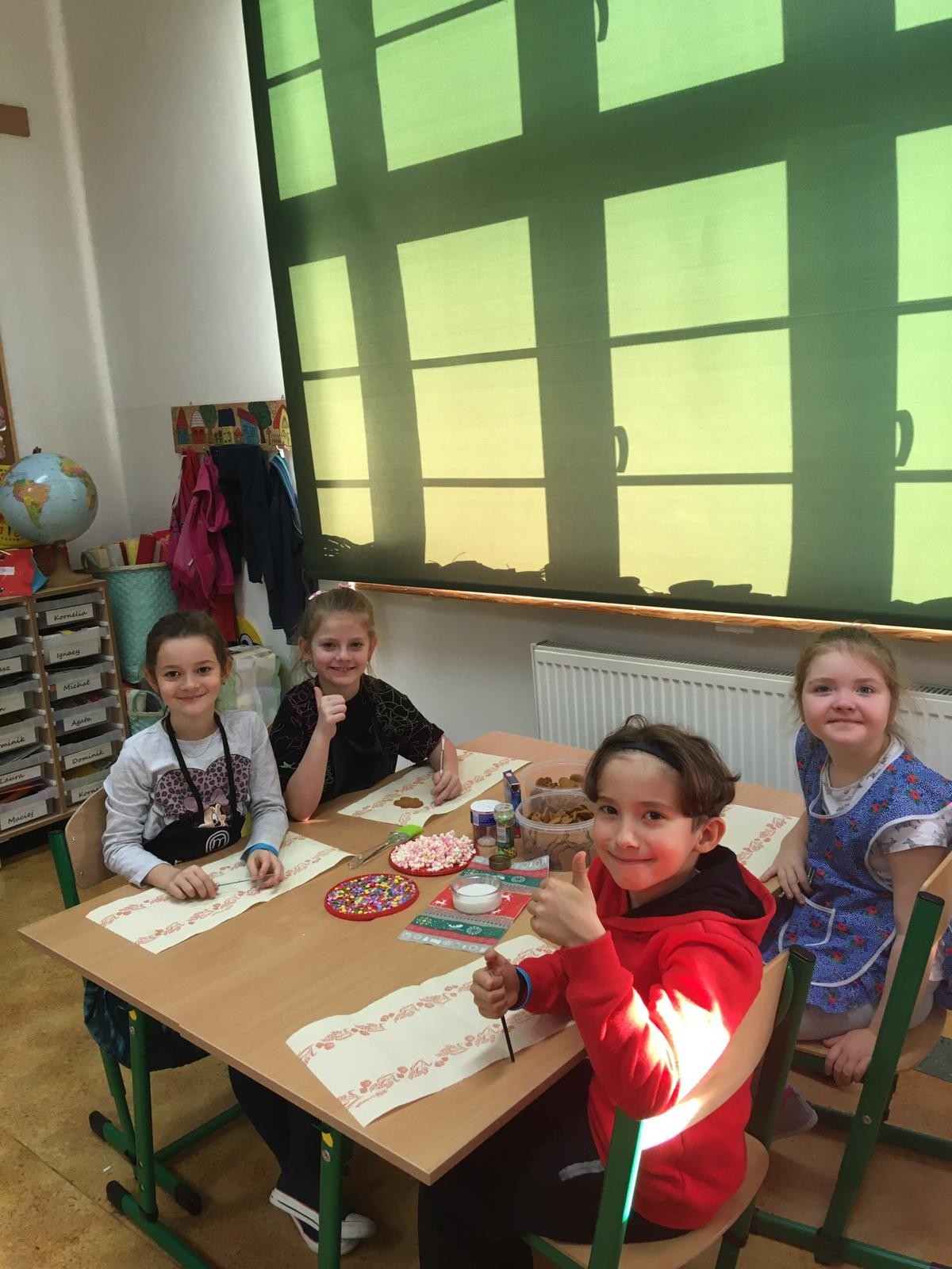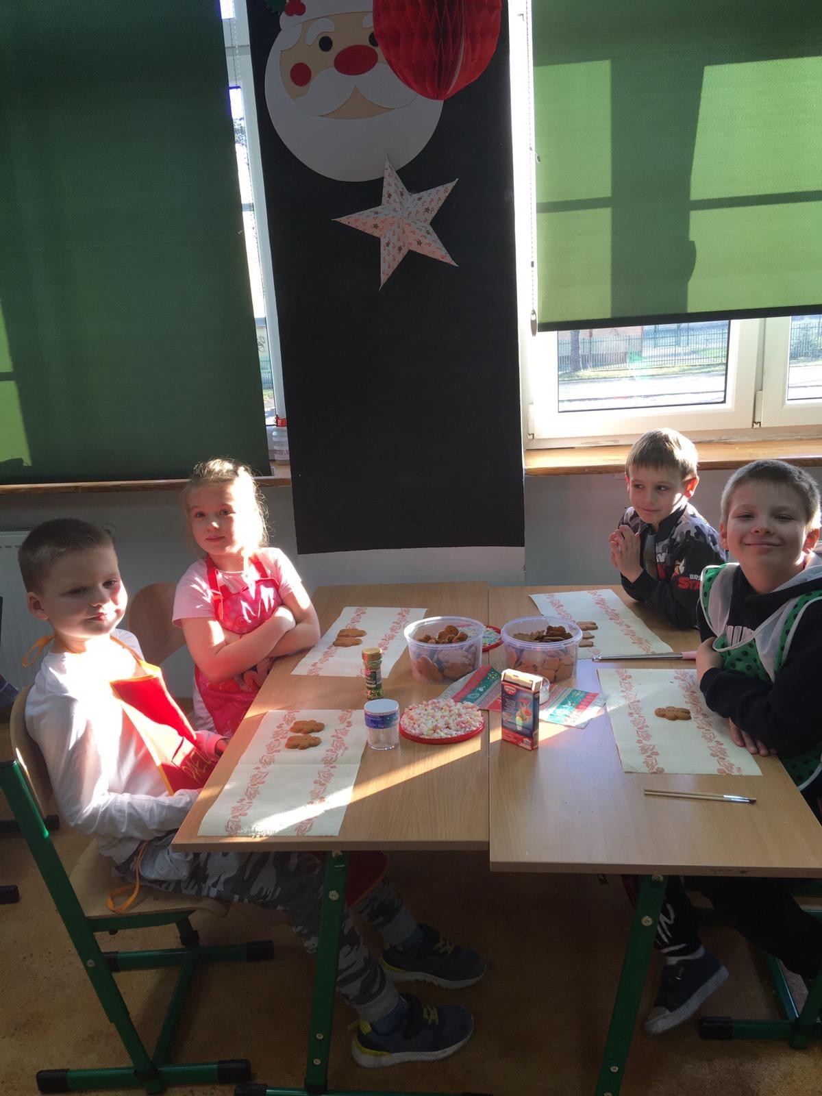 I tu niezawodna okazała się pani Ania, która wpadła na pomysł zorganizowania w klasie warsztatów piernikowych. W piątek, podczas lekcji, jej uczniowie mieli okazję wykazać się kreatywnością i zdolnościami plastycznymi w dekorowaniu świątecznych pierniczków. A było czym dekorować! Pani Ania zadbała o to, by przynieść niezbędne, słodkie ozdoby-posypki w różnych kolorach, żelki, pianki i inne cudeńka. Ozdabianie pierników sprawiło pierwszakom niesamowitą frajdę, uczniowie z brązowych ciasteczek stworzyli małe dzieła sztuki. Na zakończenie zajęć każdy mógł zabrać do domu swoje pierniczki w słoikach, specjalnie udekorowanych na tę okazję.