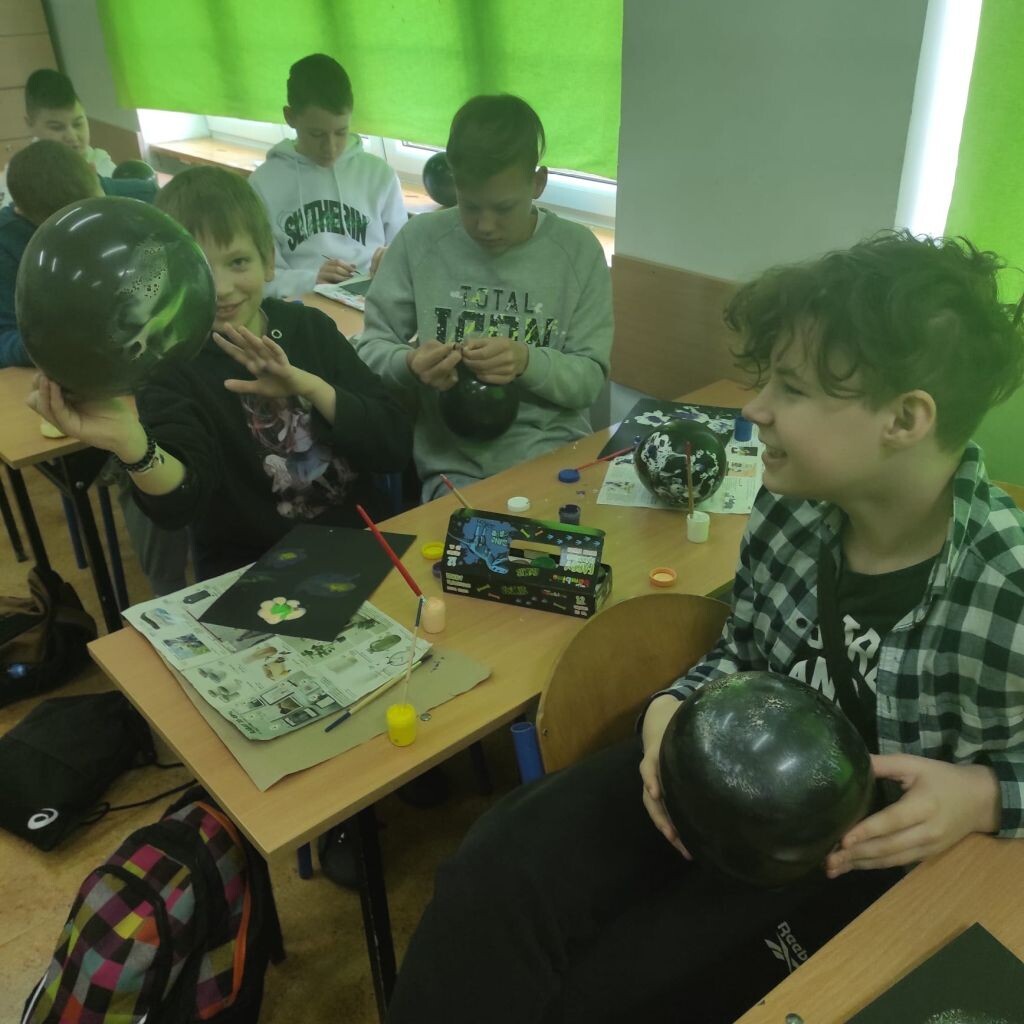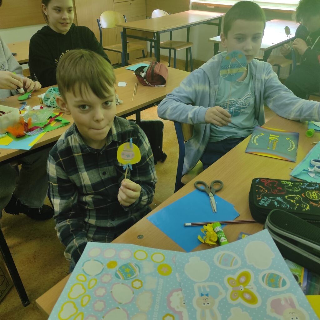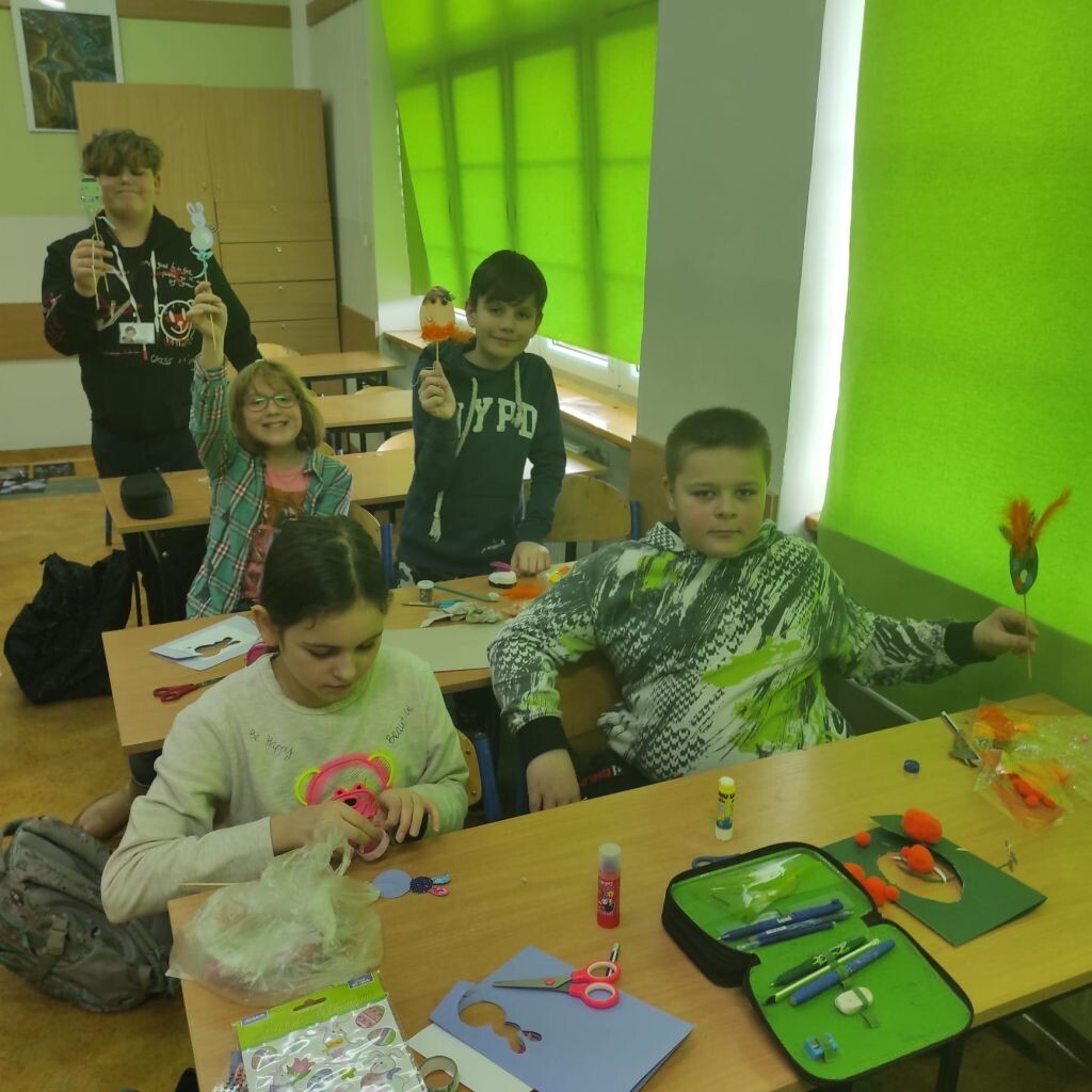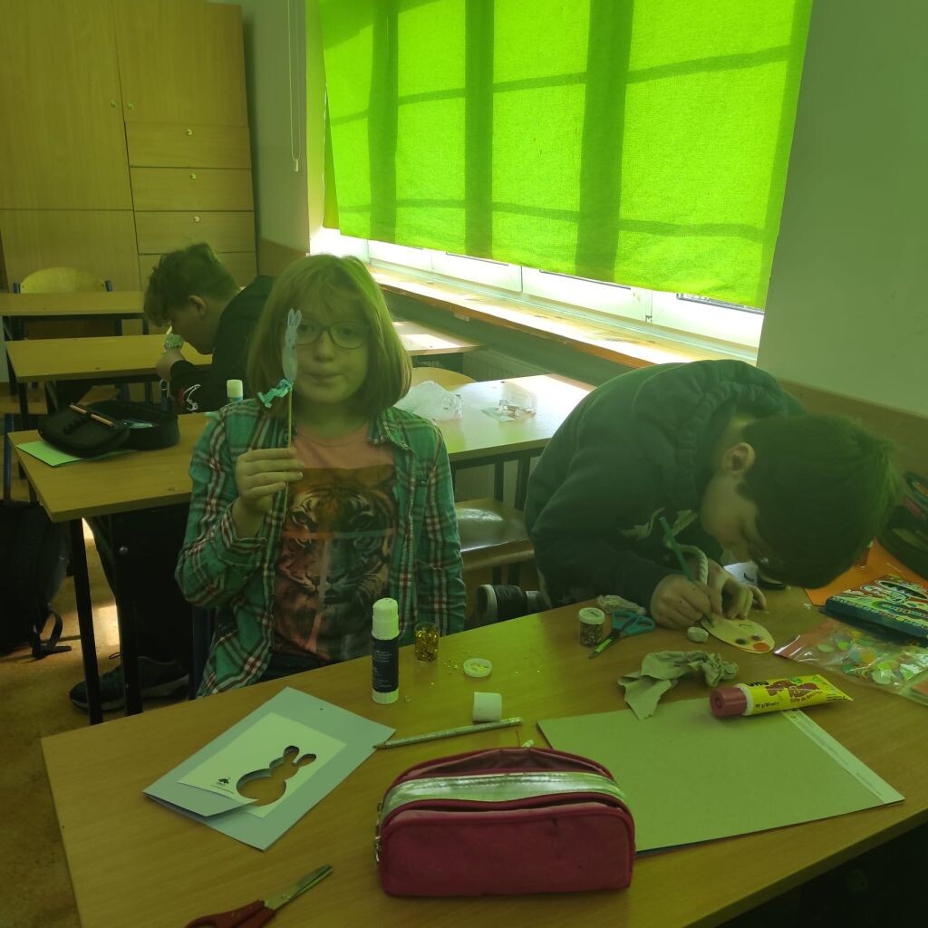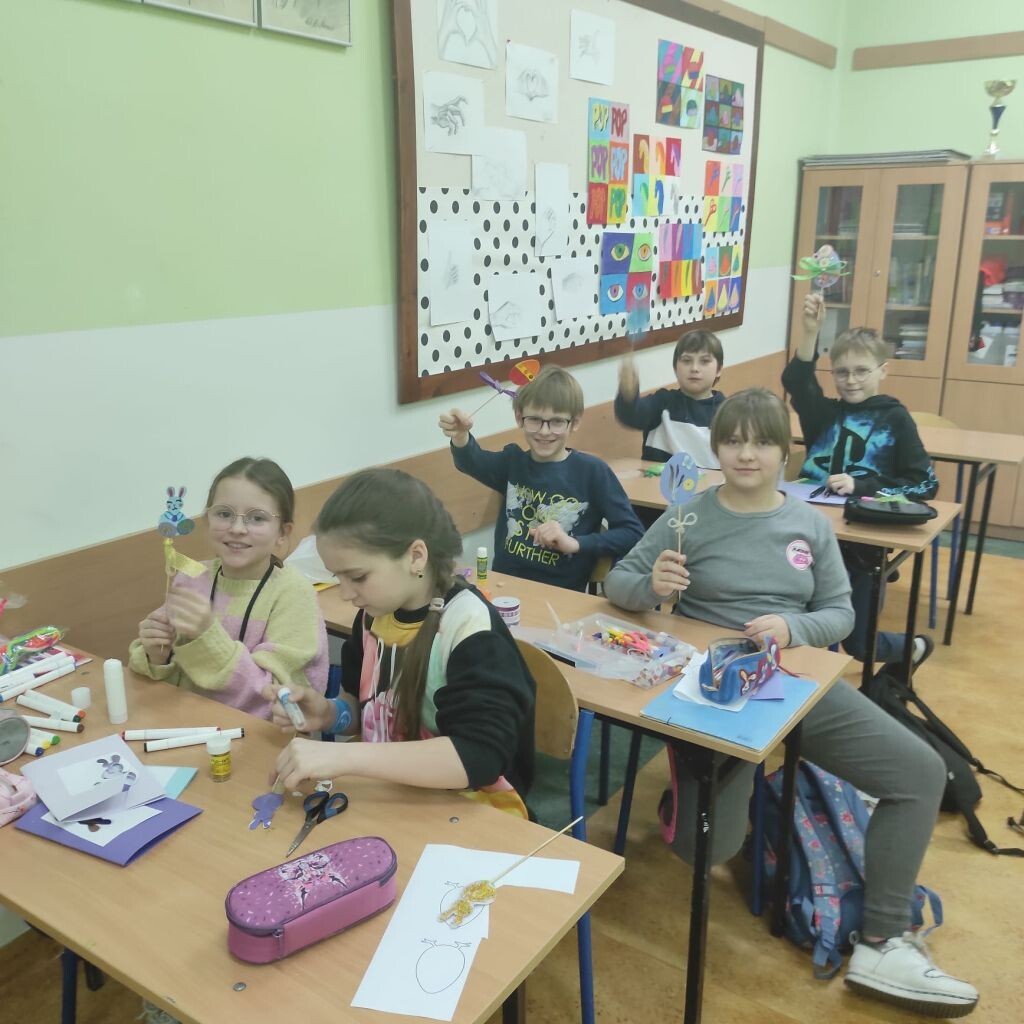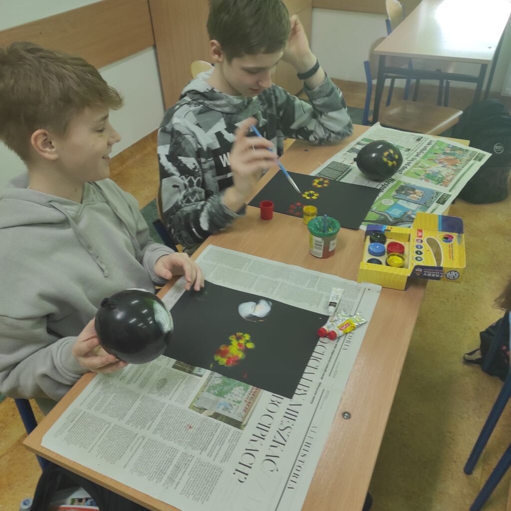 Zbliżające się święta wielkanocne stały się inspiracją dla uczniów klasy 4b i 5a - uczniowie wykonali ciekawe ozdoby świąteczne na patyku. Klasa 6a stworzyła kompozycje wiosennych kwiatów. Prace malarskie powstały bez użycia pędzla, który zastąpiony został balonikiem… Powstały efektowne prace.