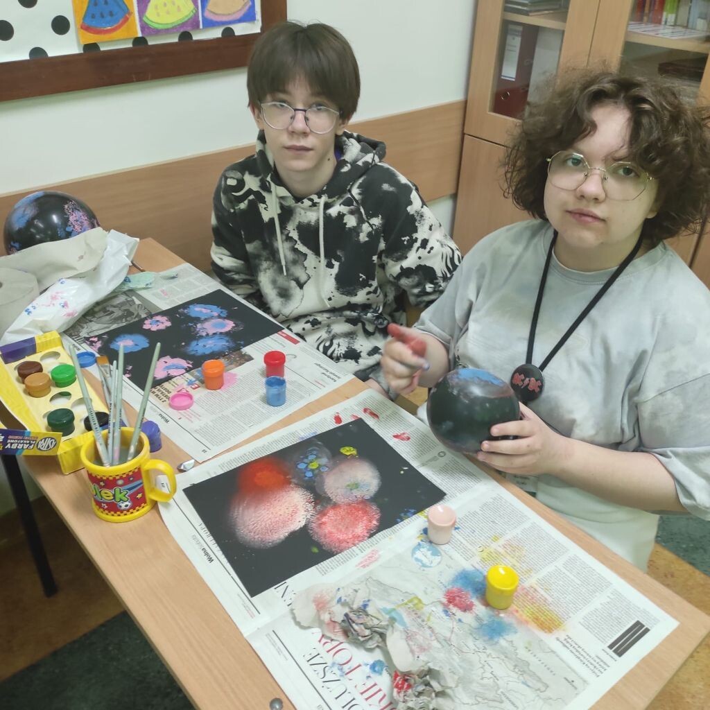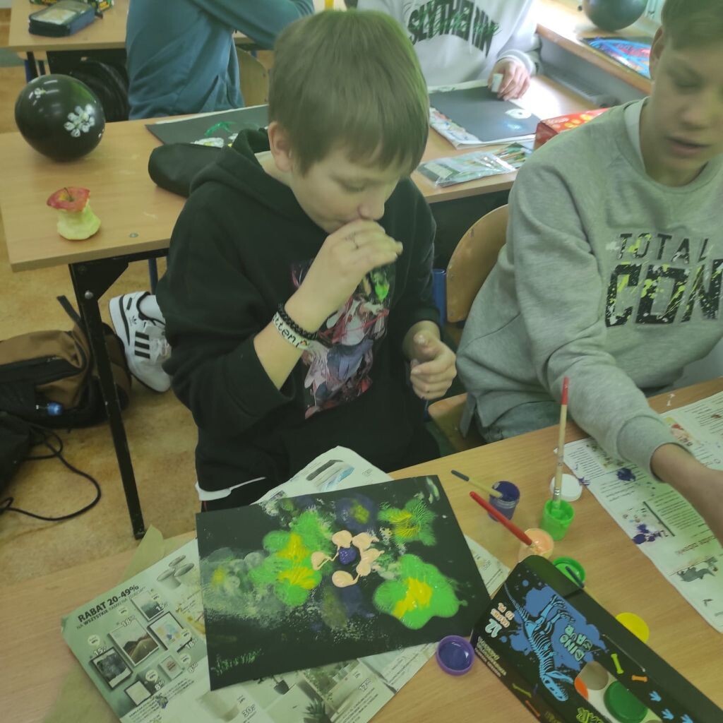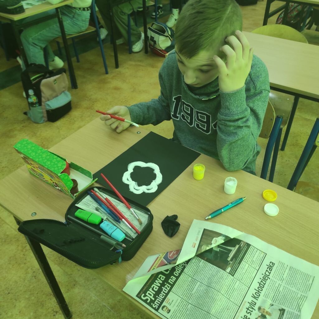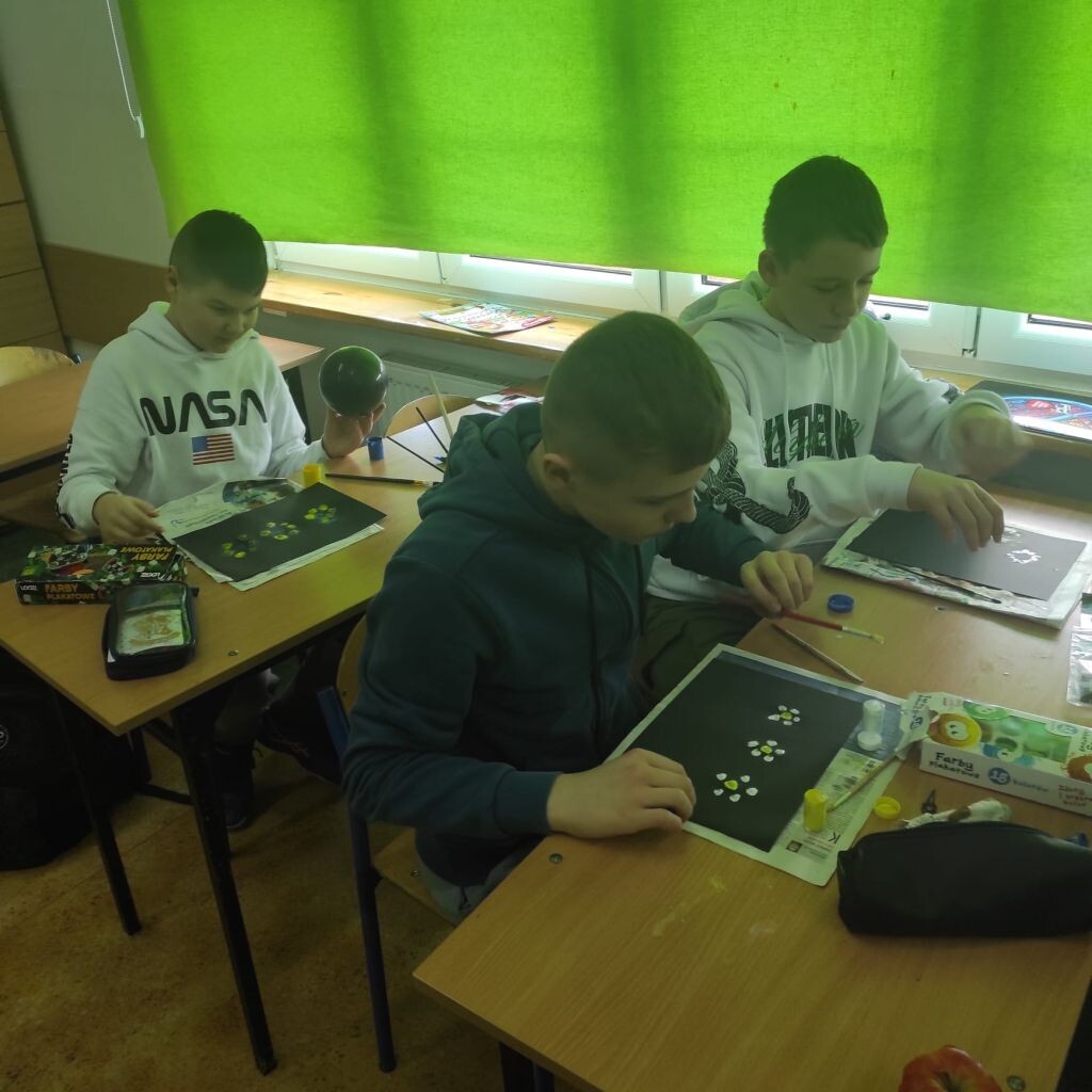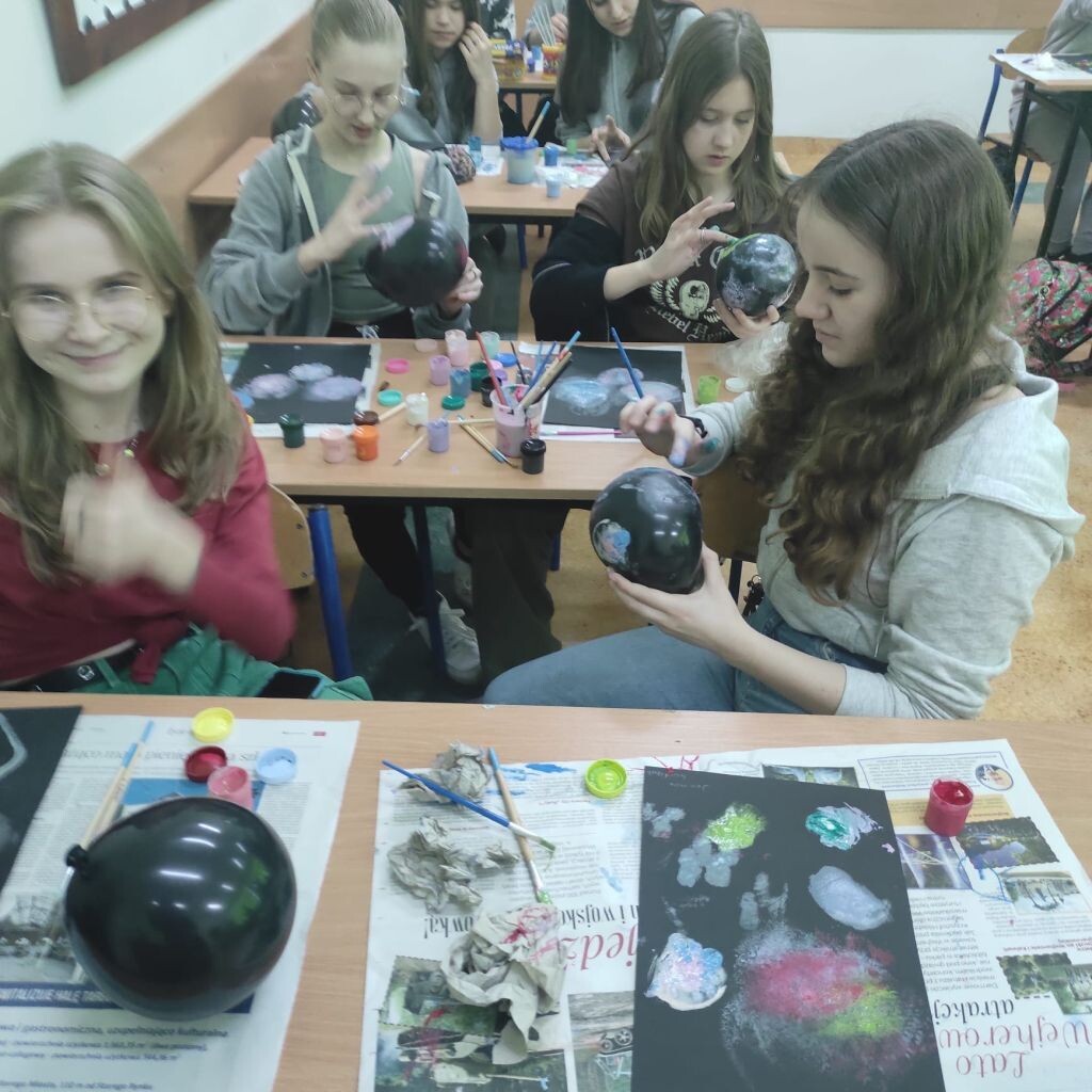 Zbliżające się święta wielkanocne stały się inspiracją dla uczniów klasy 4b i 5a - uczniowie wykonali ciekawe ozdoby świąteczne na patyku. Klasa 6a stworzyła kompozycje wiosennych kwiatów. Prace malarskie powstały bez użycia pędzla, który zastąpiony został balonikiem… Powstały efektowne prace.
