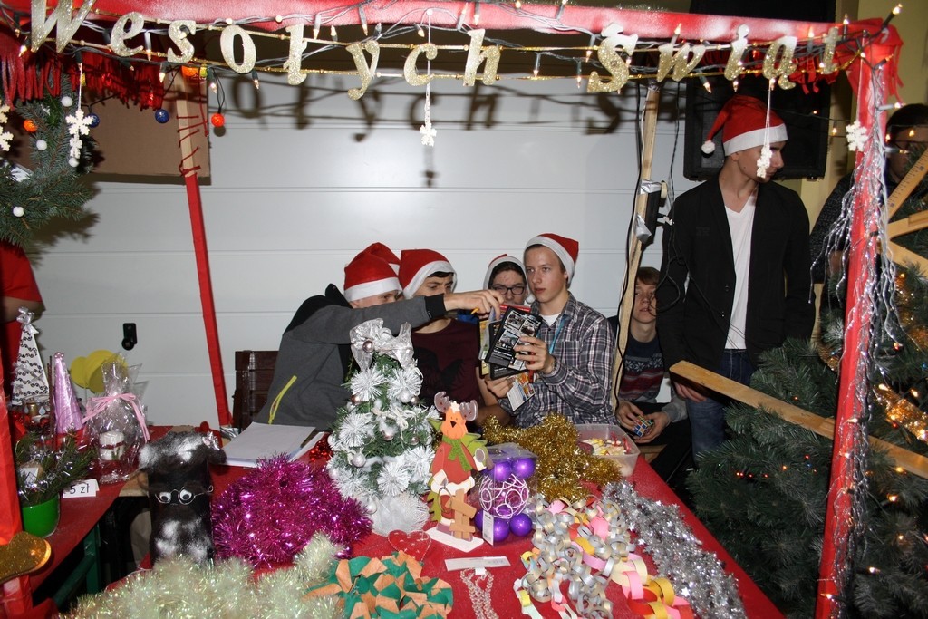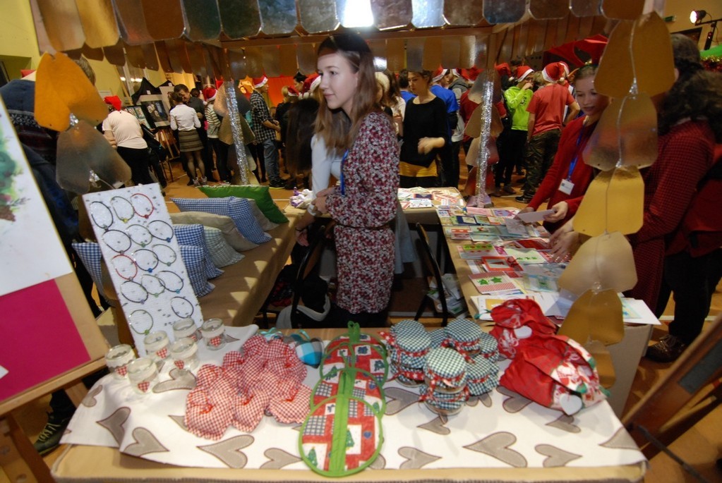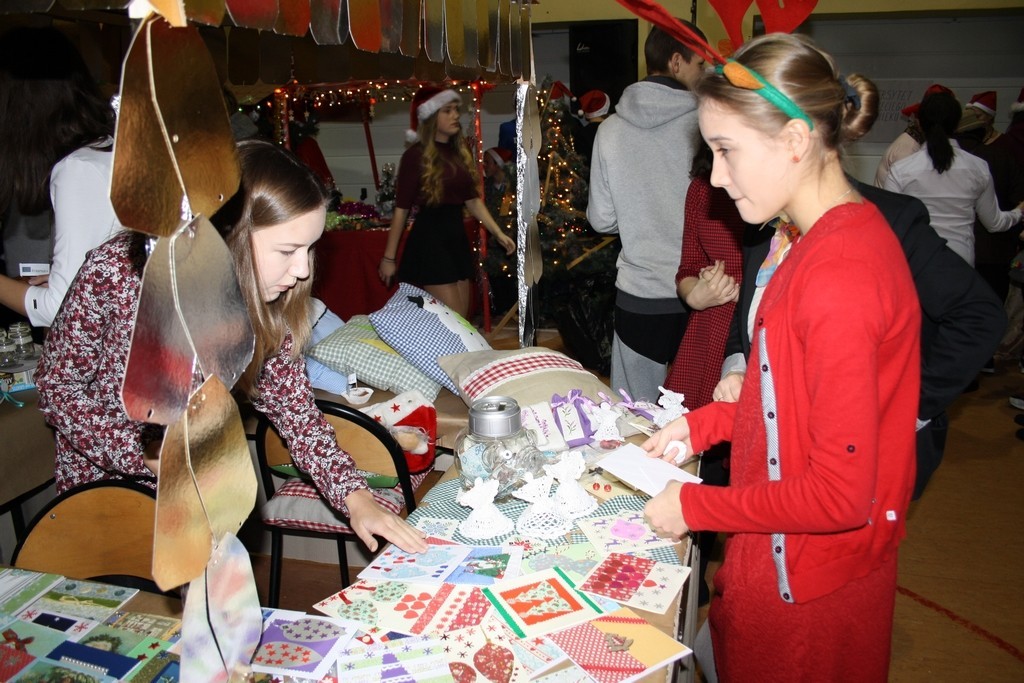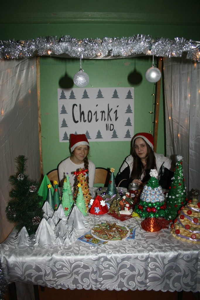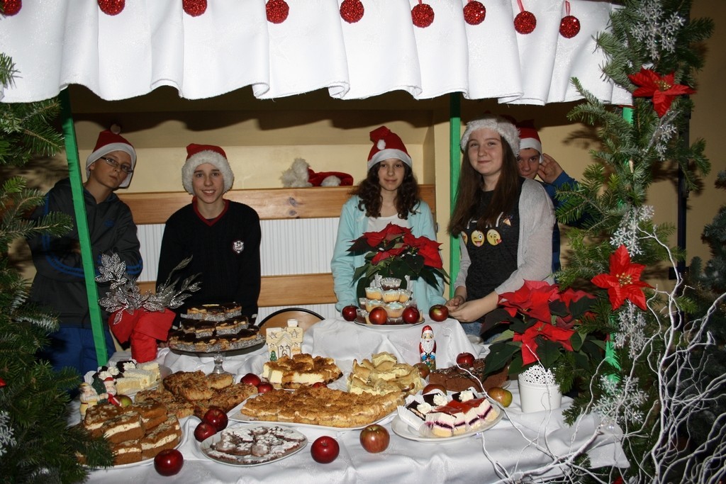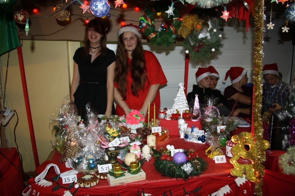 Na sali gimnastycznej pojawiły się specjalnie przygotowane na tę okazję stragany – a na nich mnóstwo atrakcji. Uczniowie już od kilku tygodni przygotowywali świąteczne ozdoby, miniaturowe choinki, bombki, pudełka na upominki, świeczniki, niepowtarzalne ozdoby, bożonarodzeniowe kartki a nawet ekologiczne kosmetyki. Stoiska oferowały również pyszne ciasta, pierniczki, babeczki, sałatki, napoje a nawet pierogi i tradycyjny czerwony barszczyk.