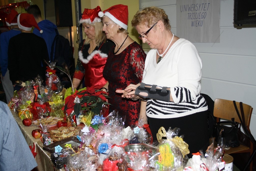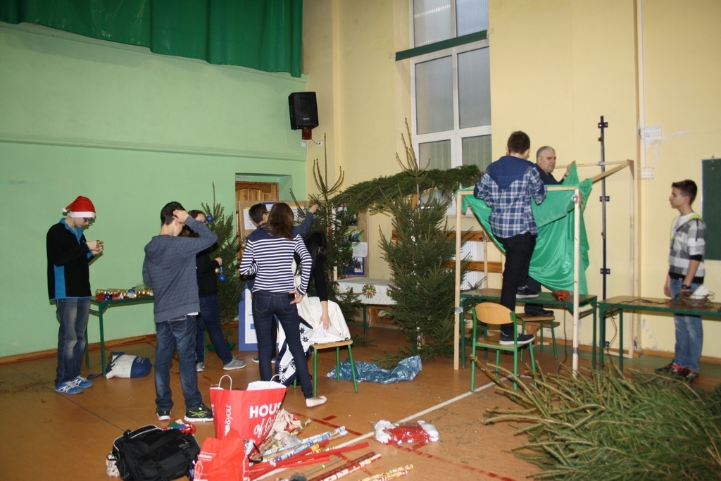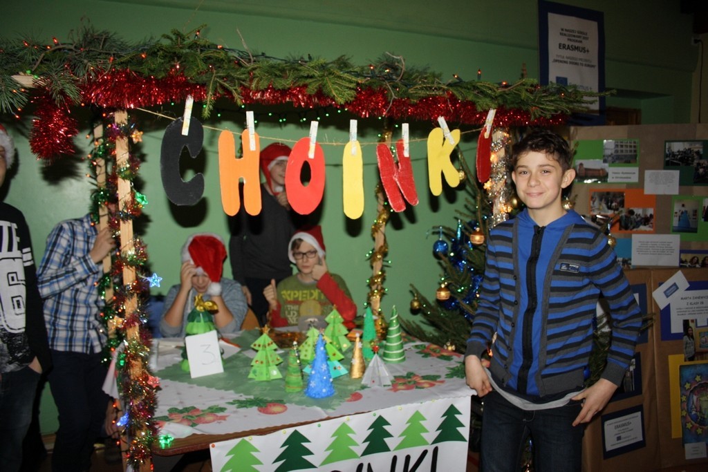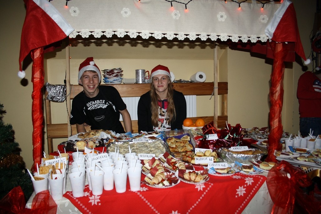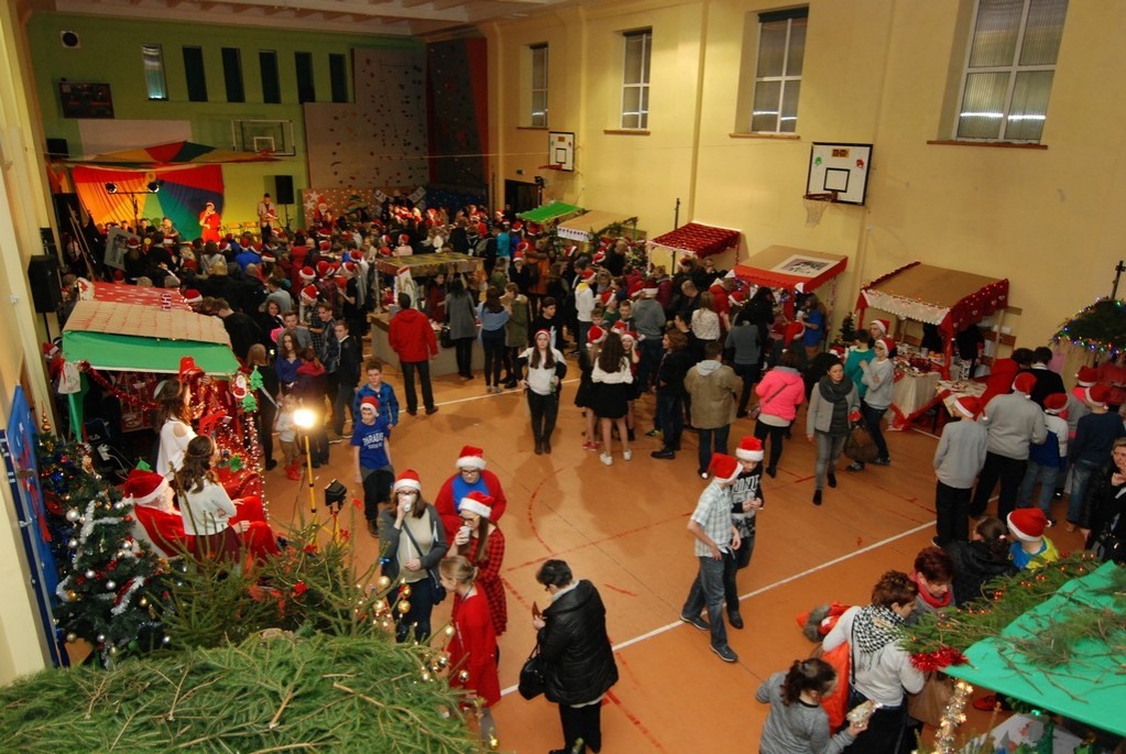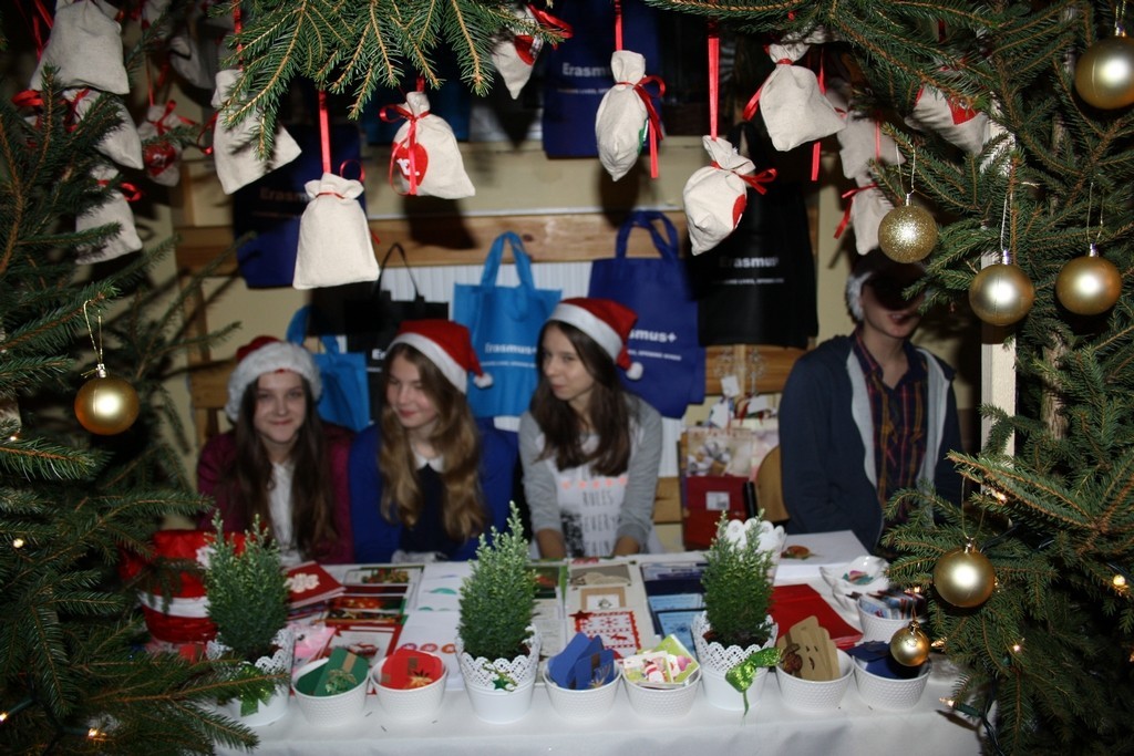 Na sali gimnastycznej pojawiły się specjalnie przygotowane na tę okazję stragany – a na nich mnóstwo atrakcji. Uczniowie już od kilku tygodni przygotowywali świąteczne ozdoby, miniaturowe choinki, bombki, pudełka na upominki, świeczniki, niepowtarzalne ozdoby, bożonarodzeniowe kartki a nawet ekologiczne kosmetyki. Stoiska oferowały również pyszne ciasta, pierniczki, babeczki, sałatki, napoje a nawet pierogi i tradycyjny czerwony barszczyk.