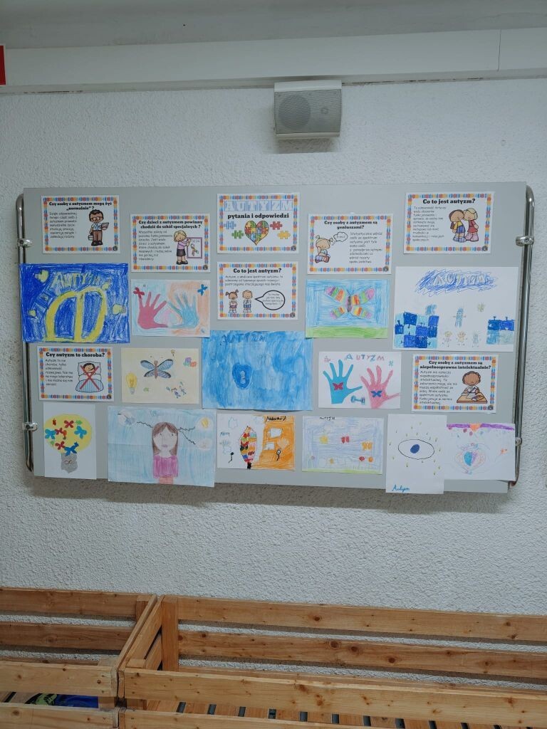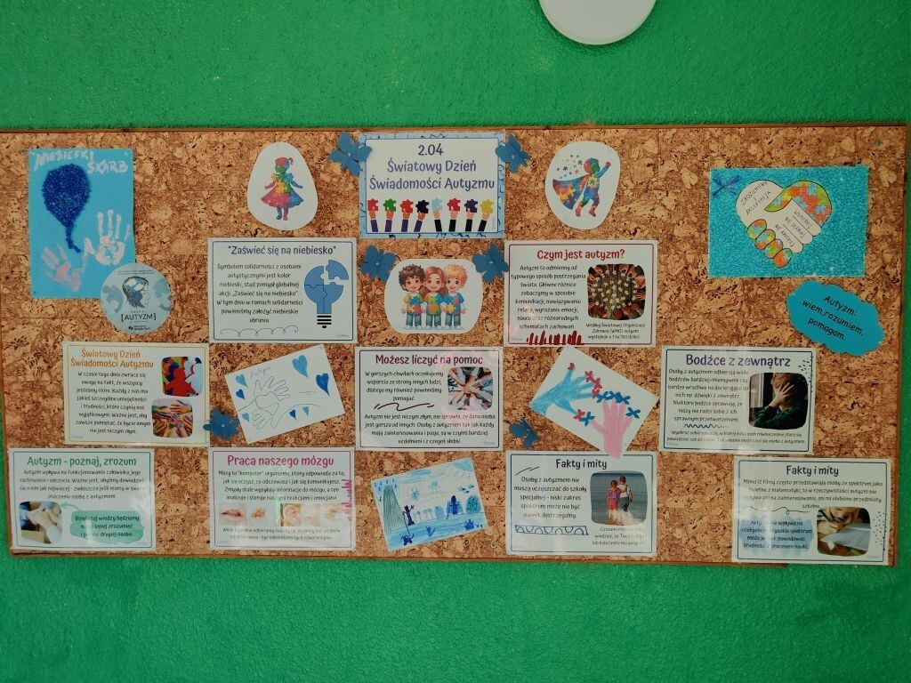 W ramach obchodów Światowego Dnia Świadomości Autyzmu w naszej szkole w klasach I-III odbyły się warsztaty na temat autyzmu wzbogacone o ćwiczenia praktyczne, w których dzieci chętnie brały udział. W klasach IV-VIII przeprowadzone zostały ankiety oraz zaprezentowane wykłady. Klasy młodsze uczestniczyły w konkursie plastycznym zorganizowanym Przez Stowarzyszenie Niebieski Skarb. Prace dzieci zostały zamieszczone w galerii prac w naszej szkole. Zajęcia prowadzone były przez A. Białk, J. Wołoszynek, B. Frankiewicz, K. Wasilewską, M. Pałubicką G. Negrya i M. Piekut.
