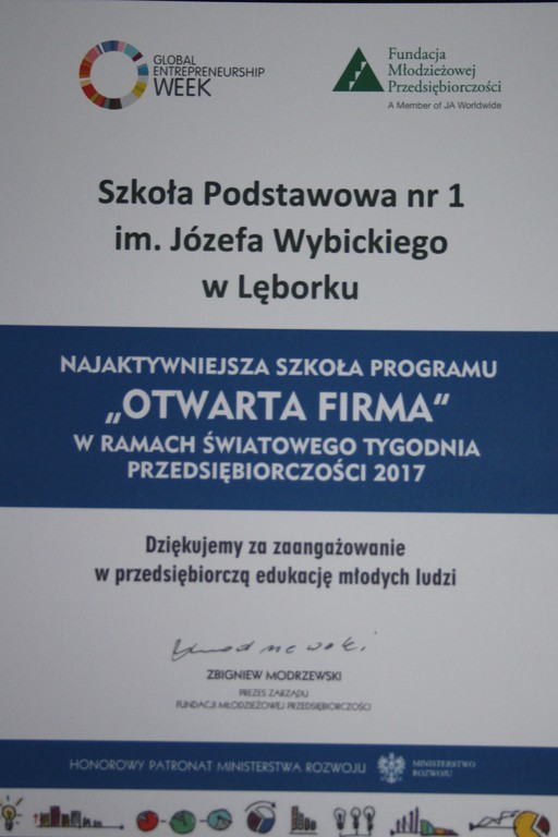 W trzydziestce najlepszych znalazła się Szkoła Podstawowa nr 1 im. Józefa Wybickiego w Lęborku. Zgodnie z regulaminem Komisja przyznała nam pamiątkowy dyplom, okolicznościową statuetkę, honorowy tytuł Najaktywniejszej Szkoły w ramach programu Otwarta firma 2017 jak również złożyła gratulacje koordynatorowi p. Grażynie Ruszkowskiej, całej społeczności szkolnej oraz wszystkim uczestnikom programu.