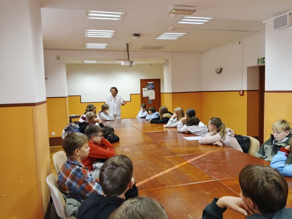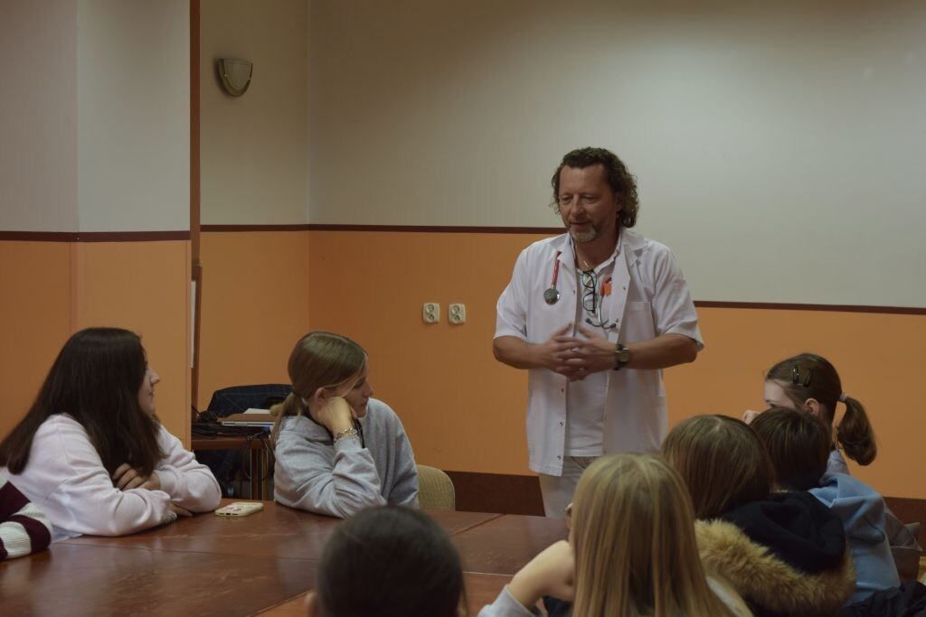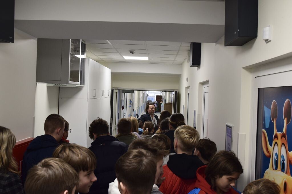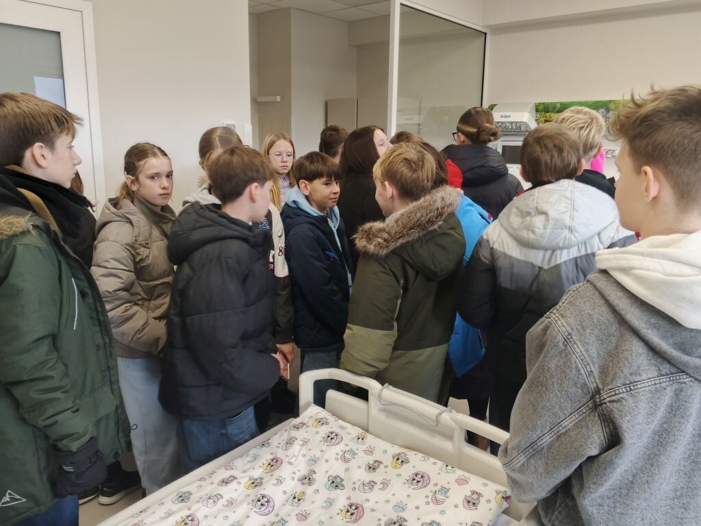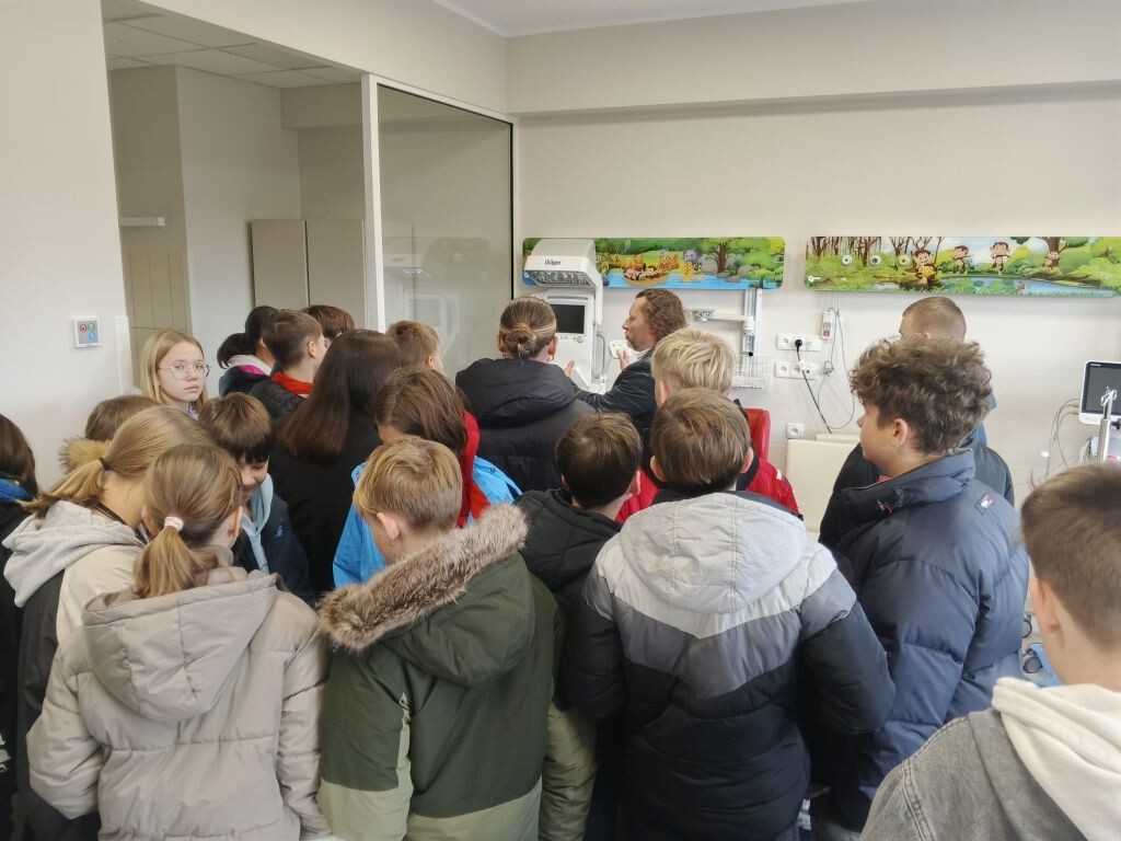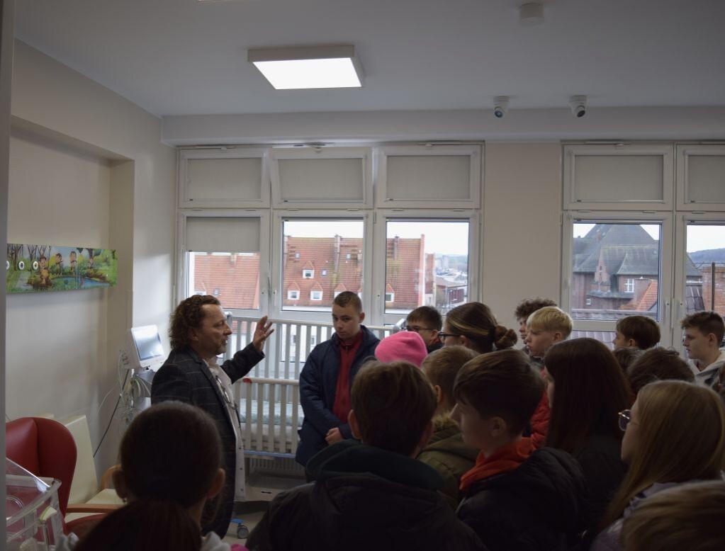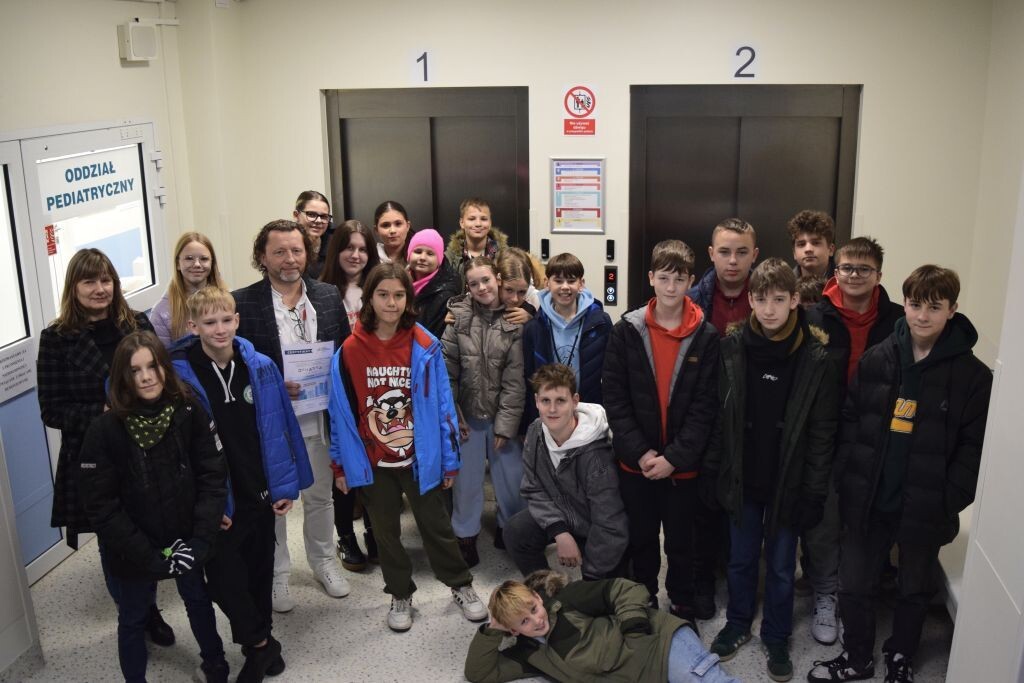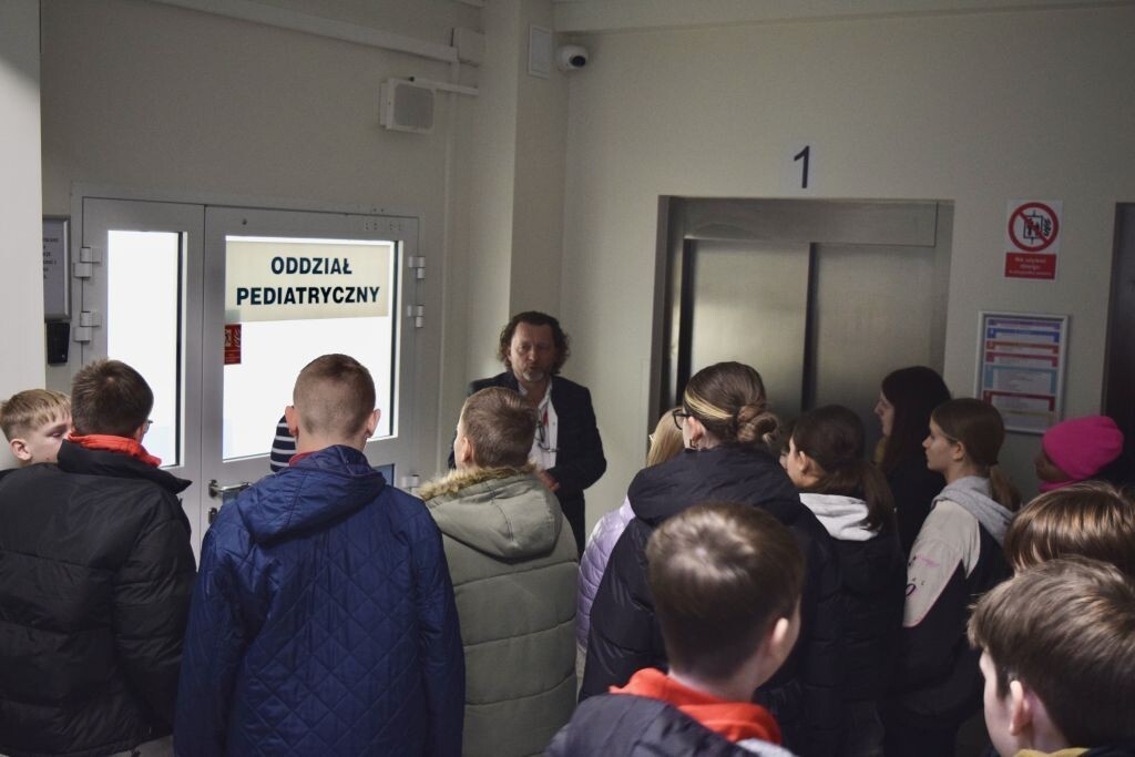 Następnie uczniowie udali się na oddział pediatryczny, zlokalizowany na czwartym piętrze budynku głównego szpitala. Zapoznali się z jego funkcjonowaniem, mogli również zobaczyć jak wygląda sala wzmożonego nadzoru, pokój badań i konsultacji, gabinet zabiegowy oraz diagnostyczny. Była to ciekawa lekcja, która być może zachęci któregoś z uczniów do wyboru ścieżki zawodowej związanej z szeroko pojętą medycyną.