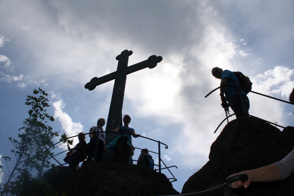 Doskonałym punktem widokowym okazała się Krzyżna Góra (654 m.n.p.m.) – jeden z dwóch najbardziej znanych wierzchołków Gór Sokolich. Na sam szczyt prowadziły wykute w skale stopnie. Roztaczająca się z niej panorama na Karkonosze i okoliczne miejscowości wynagrodziła wszystkim trudy wspinaczki.
