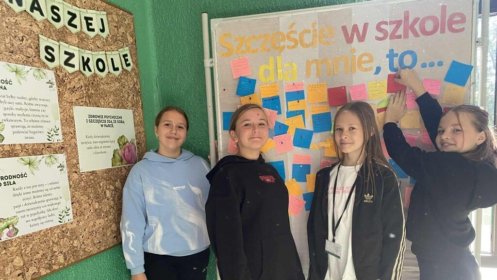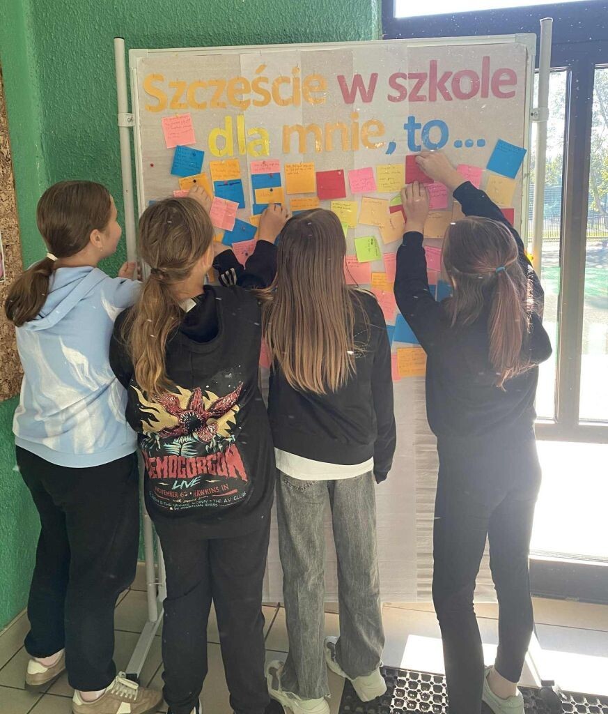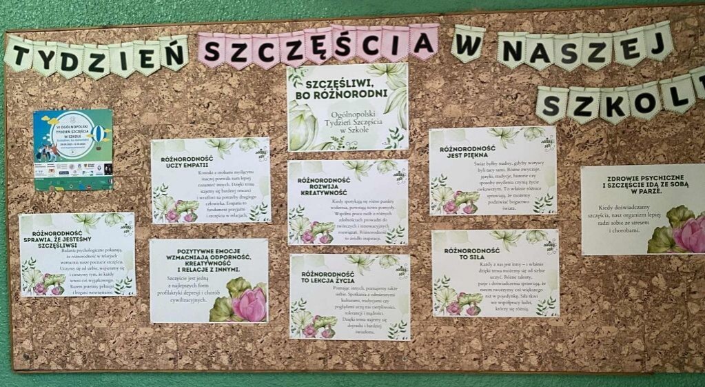 W dniach od 29 września do 3 października obchodziliśmy VI Ogólnopolski Tydzień Szczęścia w Szkole. Tegoroczne hasło brzmiało „Szczęśliwi, bo różnorodni”. Z tej okazji, przygotowaliśmy na każdy dzień tygodnia wyzwania. W poniedziałek - "Dzień dobrych relacji": witaliśmy się szerokim uśmiechem, dzieliliśmy się dobrymi słowami. Można było podziękować np. Paniom, które dbają o porządek w naszej szkole, Paniom kucharkom, innym pracownikom szkoły, koleżankom i kolegom. We wtorek - "Dzień szczęścia w szkole": na małych kolorowych karteczkach pisaliśmy co sprawia nam przyjemność w szkole, z jakiego powodu jesteśmy szczęśliwi. Zapisane karteczki wieszaliśmy na tablicy zatytułowanej: "Szczęście w szkole dla mnie, to...". Środa - Szczęśliwi, bo różnorodni" - wyzwaniem było ubrać się zabawnie, kolorowo, wzorzyście w rzeczy nie do pary. Czwartek - "Dzień dobrego humoru" - dzieci mogły przyjść do szkoły w zwariowanych, wystrzałowych fryzurach, mogły przygotować, żarty, dowcipy, którymi dzieliły się na lekcjach. Piątek - "Dzień bez oceniania" - staraliśmy się powstrzymywać od negatywnego oceniania innych, samego siebie a także wydarzeń. Tego dnia nie wystawiano ocen.