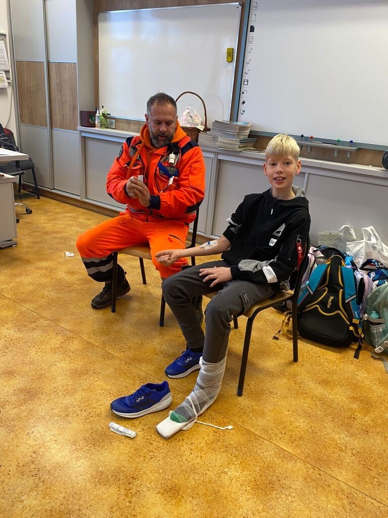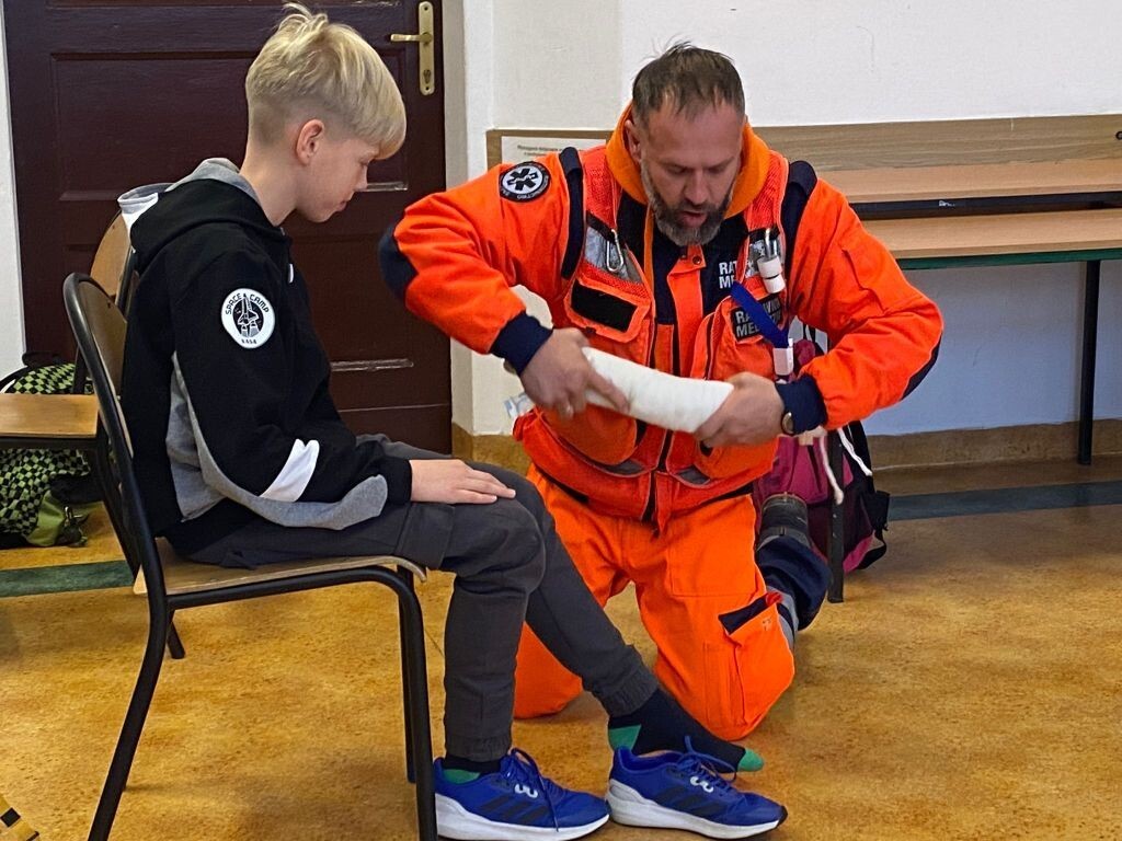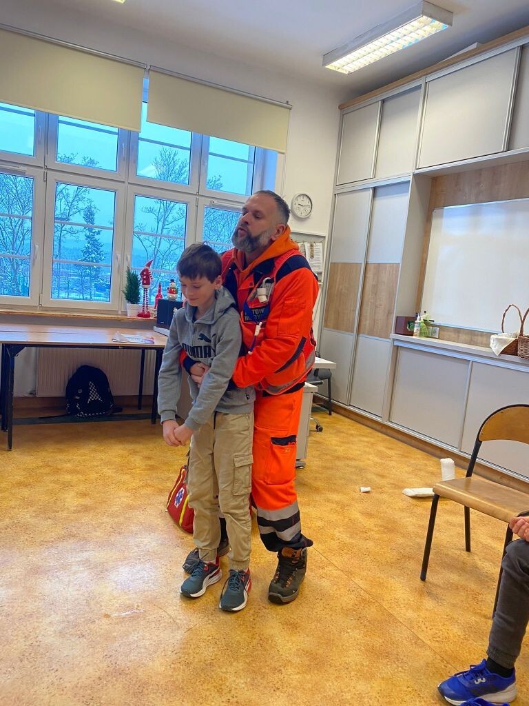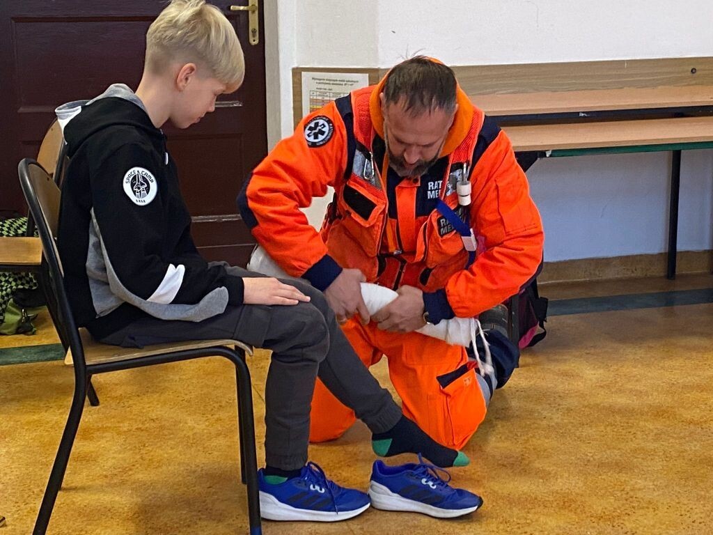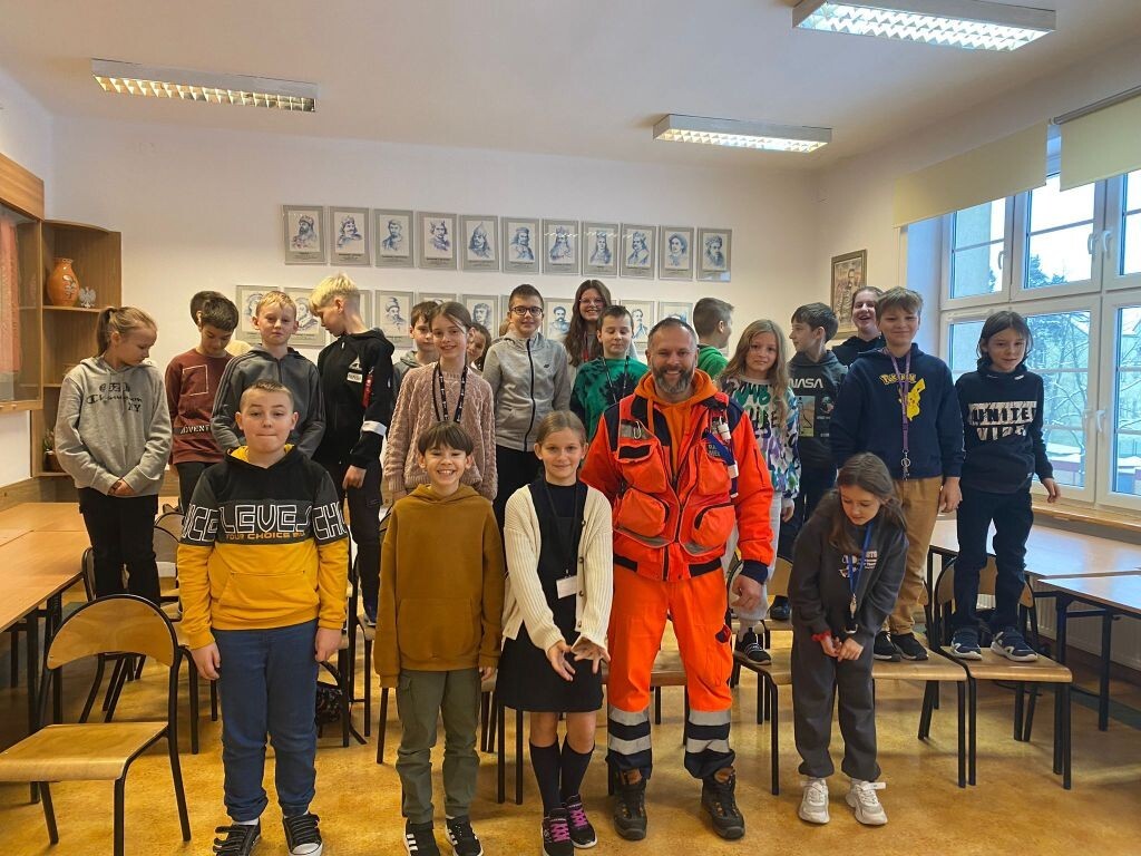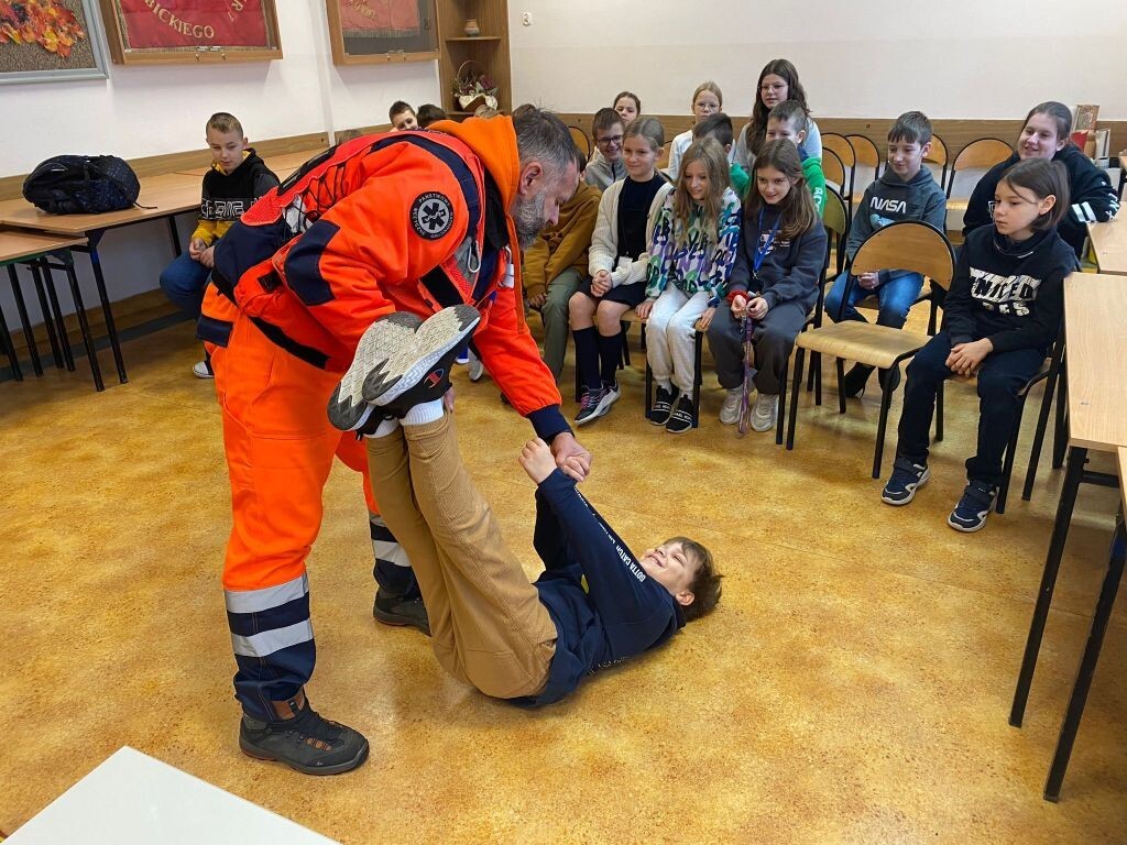 Uczniowie klasy 4a na godzinę wychowawczą zaprosili ratownika medycznego pana Mateusza Nowatkowskiego. Tata jednego z naszych uczniów zapoznał czwartoklasistów z zasadami udzielania pierwszej pomocy. Podczas zajęć uczniowie mogli dowiedzieć się jak reagować na omdlenia, zakrztuszenia, skręcenia i złamania kończyn - na które jesteśmy narażeni szczególnie w czasie zimowej aury. Zapoznali się z zasadami resuscytacji krążeniowo-oddechowej. Niektórzy uczniowie na własnym przykładzie mogli poczuć wyjątkową opiekę ratownika medycznego. Bardzo dziękujemy za cenne wskazówki i poświęcony czas.