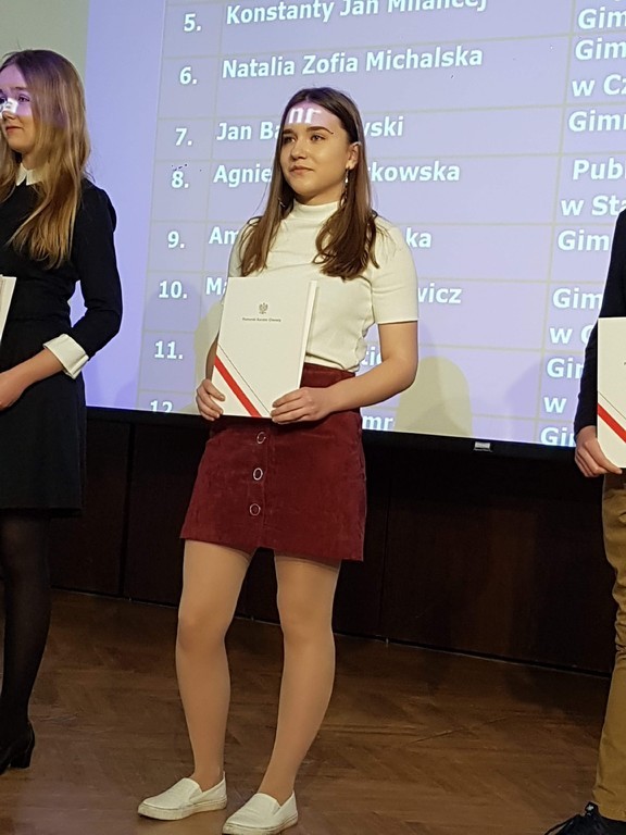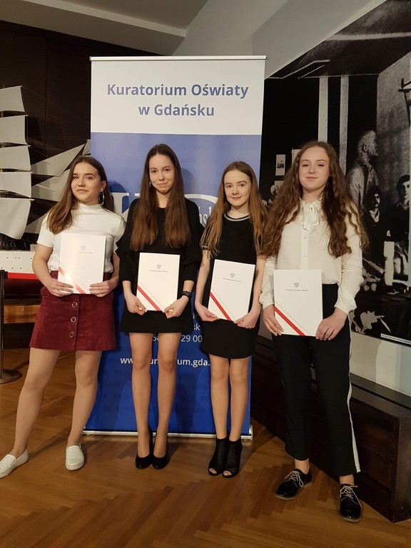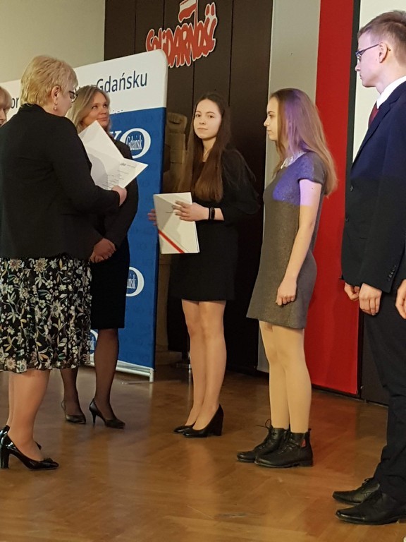 Dla uczniów oddziałów gimnazjalnych wręczenie zaświadczeń zorganizowano w legendarnej Sali BHP w Gdańsku w piątek 5 kwietnia. W uroczystości wzięli udział: Magdalena Nawrot (Laureat historia i geografia), Wiktoria Potoczna (j. niemiecki), Olga Szreder (j. niemiecki), Amelia Gołębiowska (j.niemiecki). Dla uczniów oddziałów gimnazjalnych udział w konkursie oprócz wpisu na świadectwo i dodatkowych punktów oznacza również zwolnienie z odpowiedniej części egzaminu.