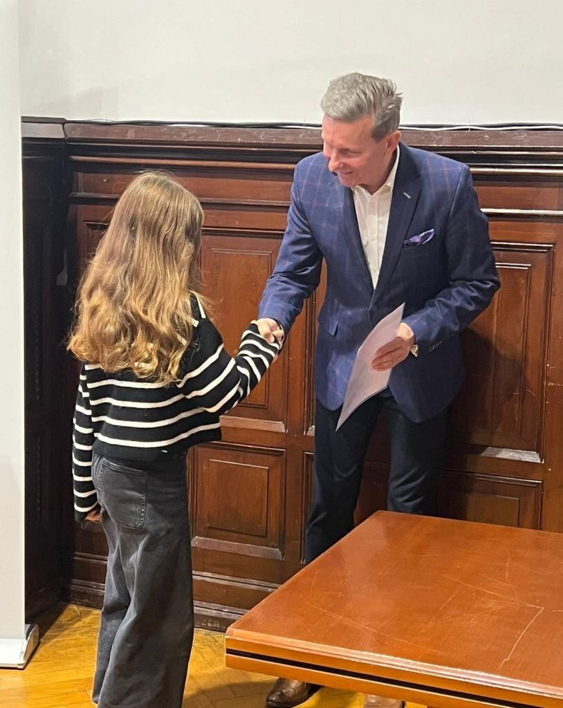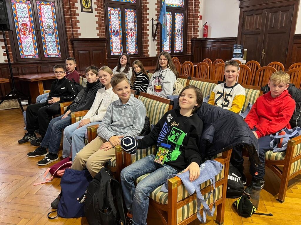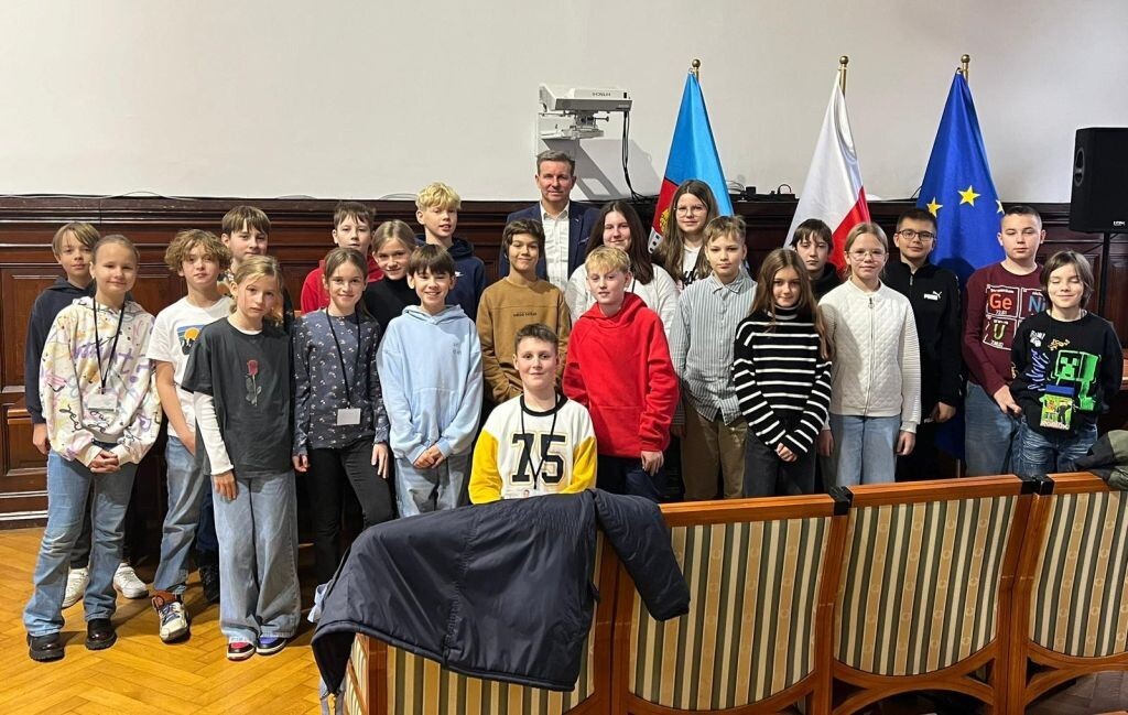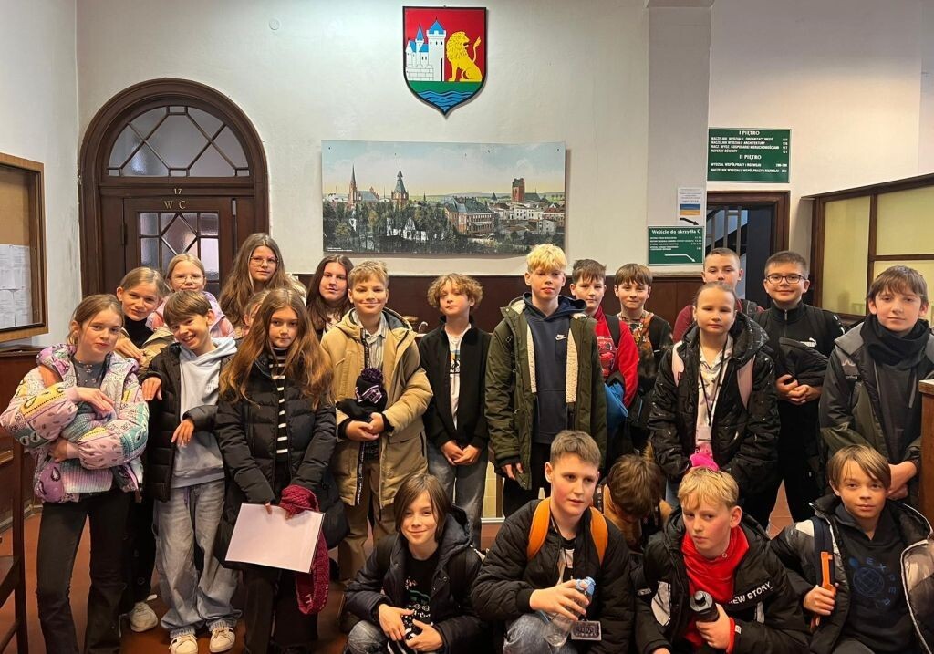 Klasa Va odwiedziła w ramach projektu "Otwarta firma" Urząd Miejski w Lęborku. Miejscem spotkania była Sala Rajców, w której na co dzień radni podejmują decyzje dotyczące naszego miasta. Uczniów powitał Sekretarz Miasta pan Marian Kurzydło. Przybliżył historię lęborskiego Ratusza, opowiedział o codziennej pracy urzędnika. Piątoklasiści dowiedzieli się jak wiele osób pracuje w urzędzie oraz jakie wykształcenie jest potrzebne do podjęcia pracy w tym miejscu. Uczniów ciekawiły również bieżące tematy związane z rozwojem miasta: droga S6, lodowisko czy elektryczne autobusy. Niewątpliwą atrakcją była też wizyta w skarbcu. Bardzo dziękujemy za poświęcony czas i drobne upominki.