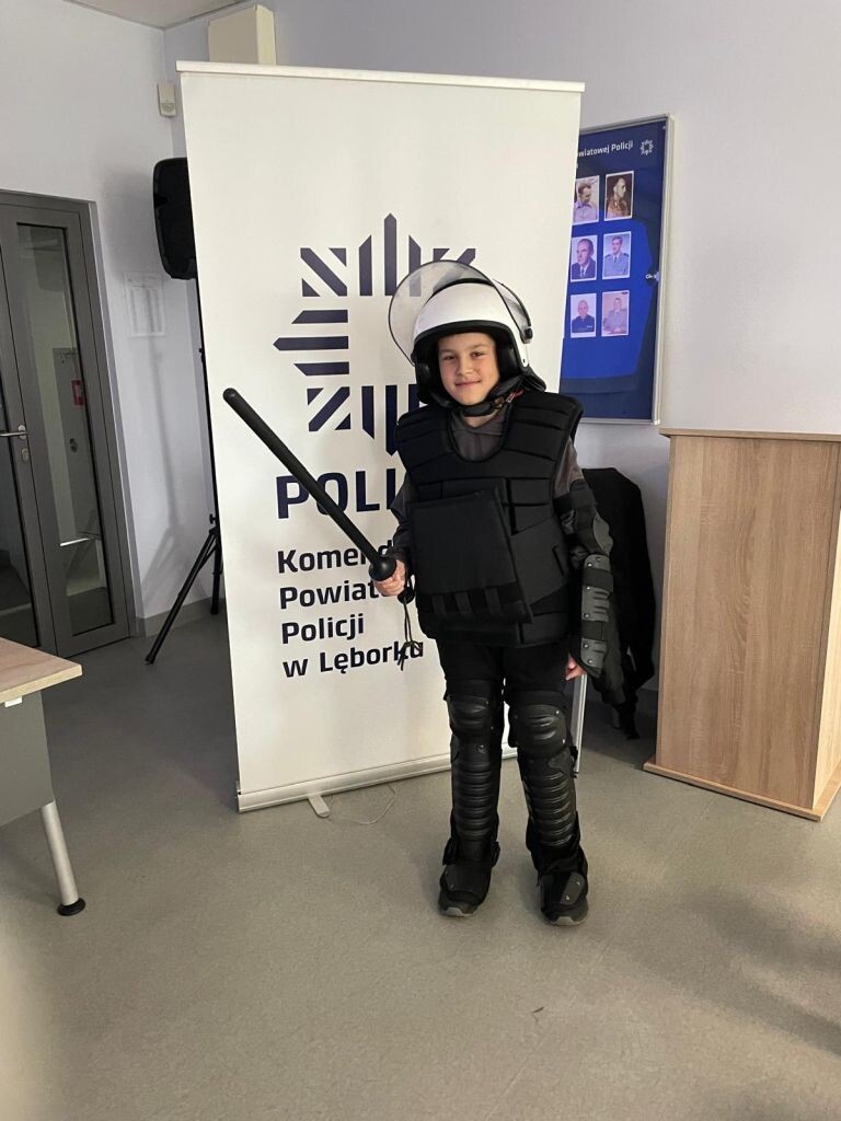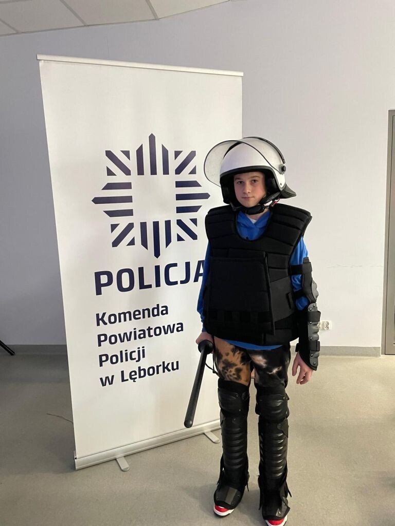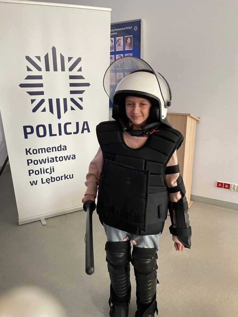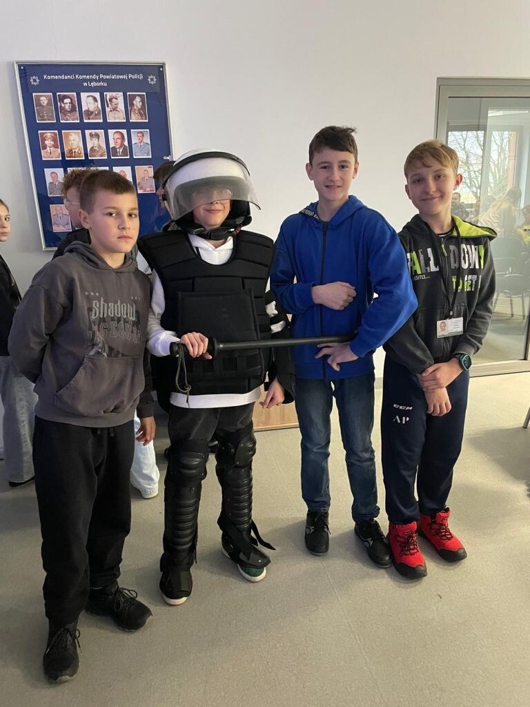 Wizyta w lęborskiej komendzie przypadła w udziale klasie VIb, która 21 listopada, wraz z panią pedagog, udała się tam w ramach projektu Otwarta firma. Podczas wizyty uczniowie zapoznali się z działalnością komendy, poznali tajniki pracy oficera dyżurnego. Niewątpliwą atrakcję stanowiła możliwość przymierzenia ubrania i sprzętu policyjnego oraz pobranie od każdego z uczniów odcisków linii papilarnych. Młodzież obejrzała również radiowóz, posiadający wydzieloną strefę z kratą w tylnej części do bezpiecznego przewozu osób zatrzymanych. Po lęborskiej komendzie oprowadziła uczniów asp. Marta Bąciaszek.